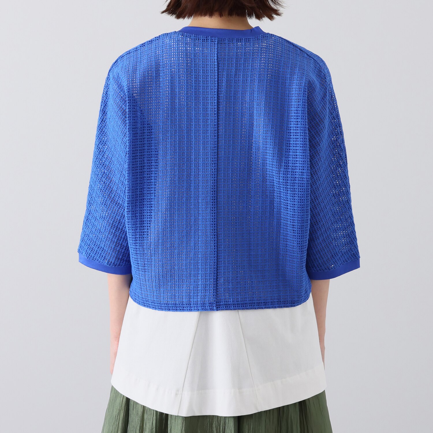 シアー素材を立体感ある格子状のラッセルレースでリラックス感あふれるドルマンスリーブのゆとりを持たせた立体的なフォルム。