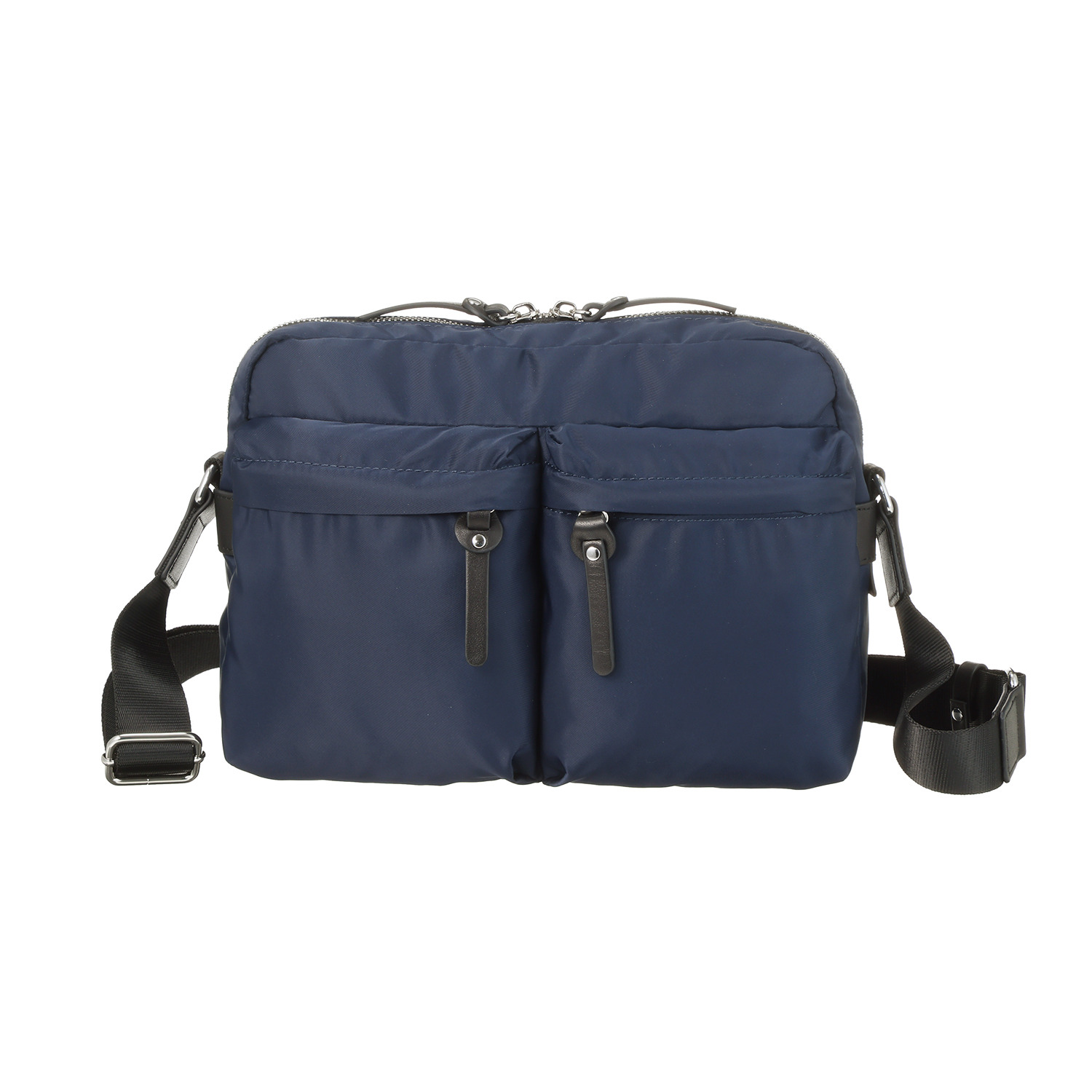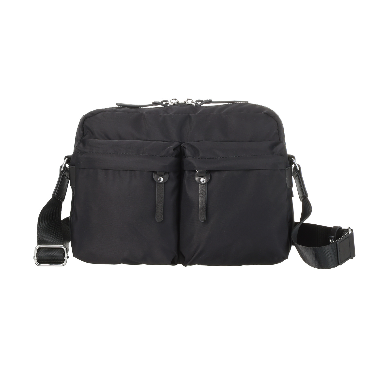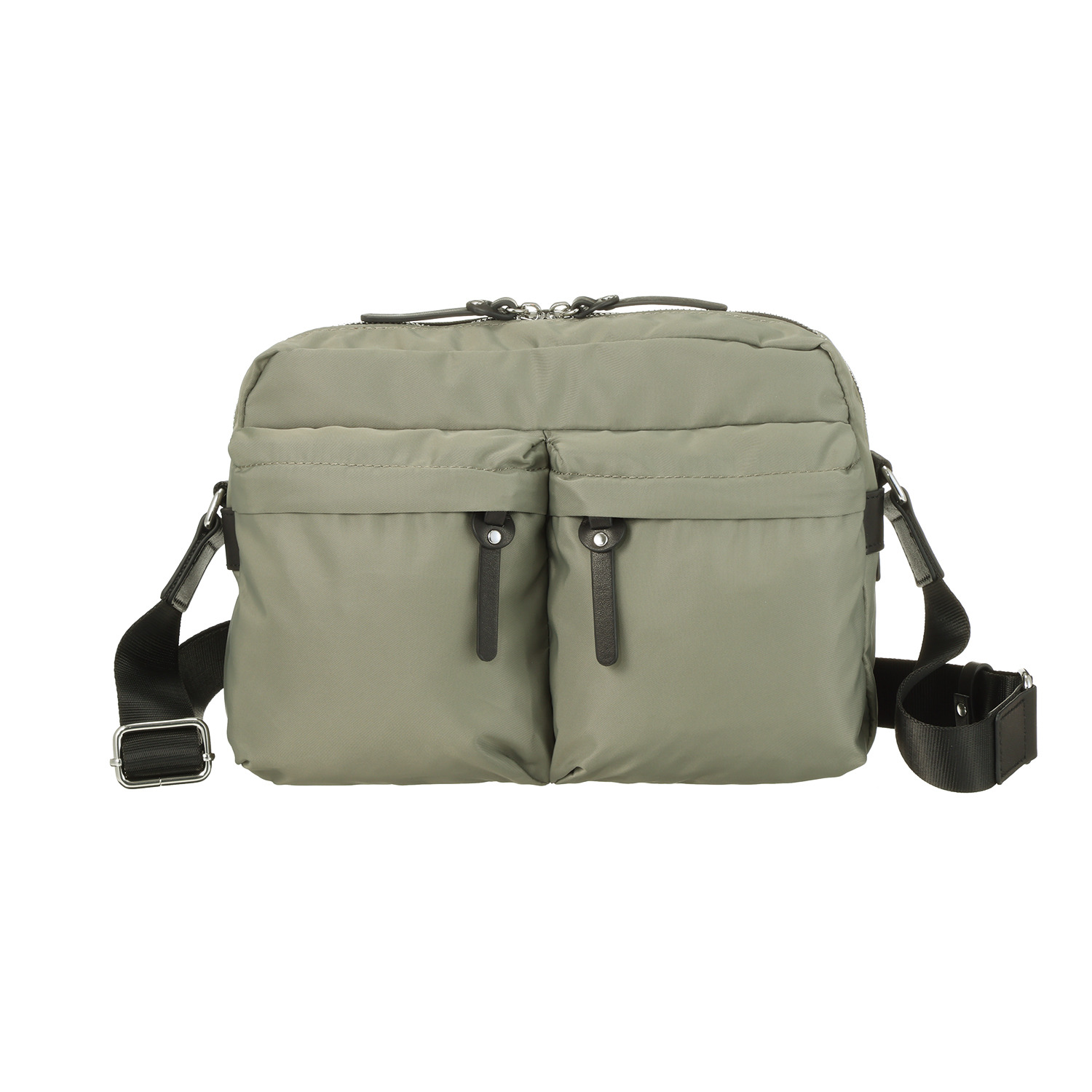 正面片側のファスナーポケットにはナスカン付ストラップを付けており、カギやリール式のパスケースを取り付けるのに便利。
