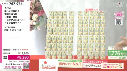 ショップチャンネルと<カゴメ>が共同開発した、5種類の国産野菜とりんごを使用した、あらごし感のある特別な野菜・果実ミックスジュースです(レモンは海外産)。