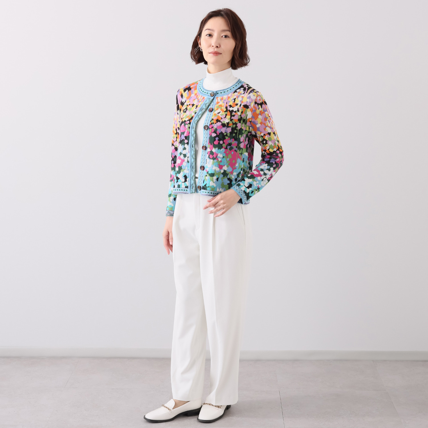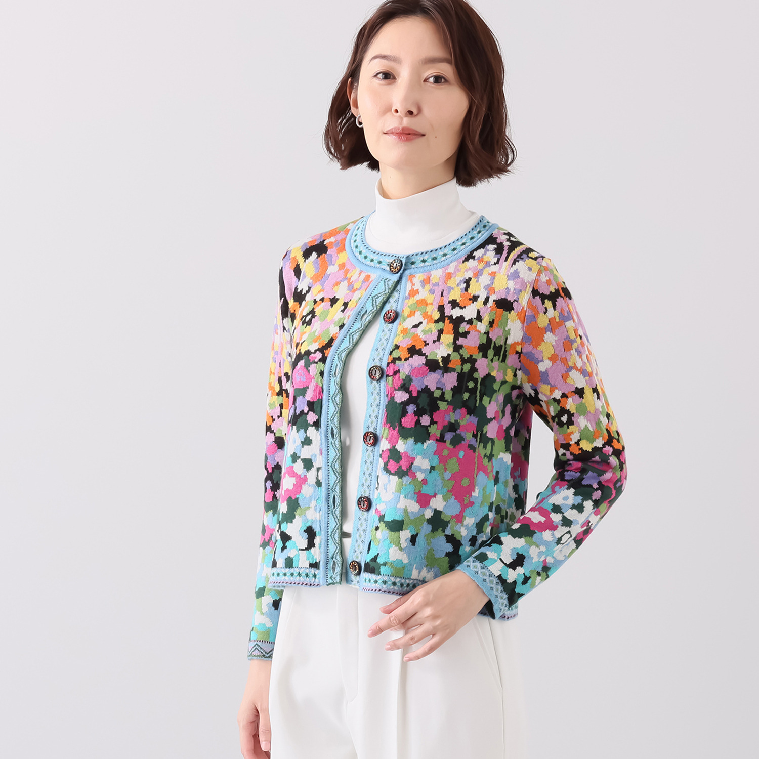 スッキリしたシルエットに絵画のように美しいジャガードニット。サッと羽織るだけでクラス感がアップします。