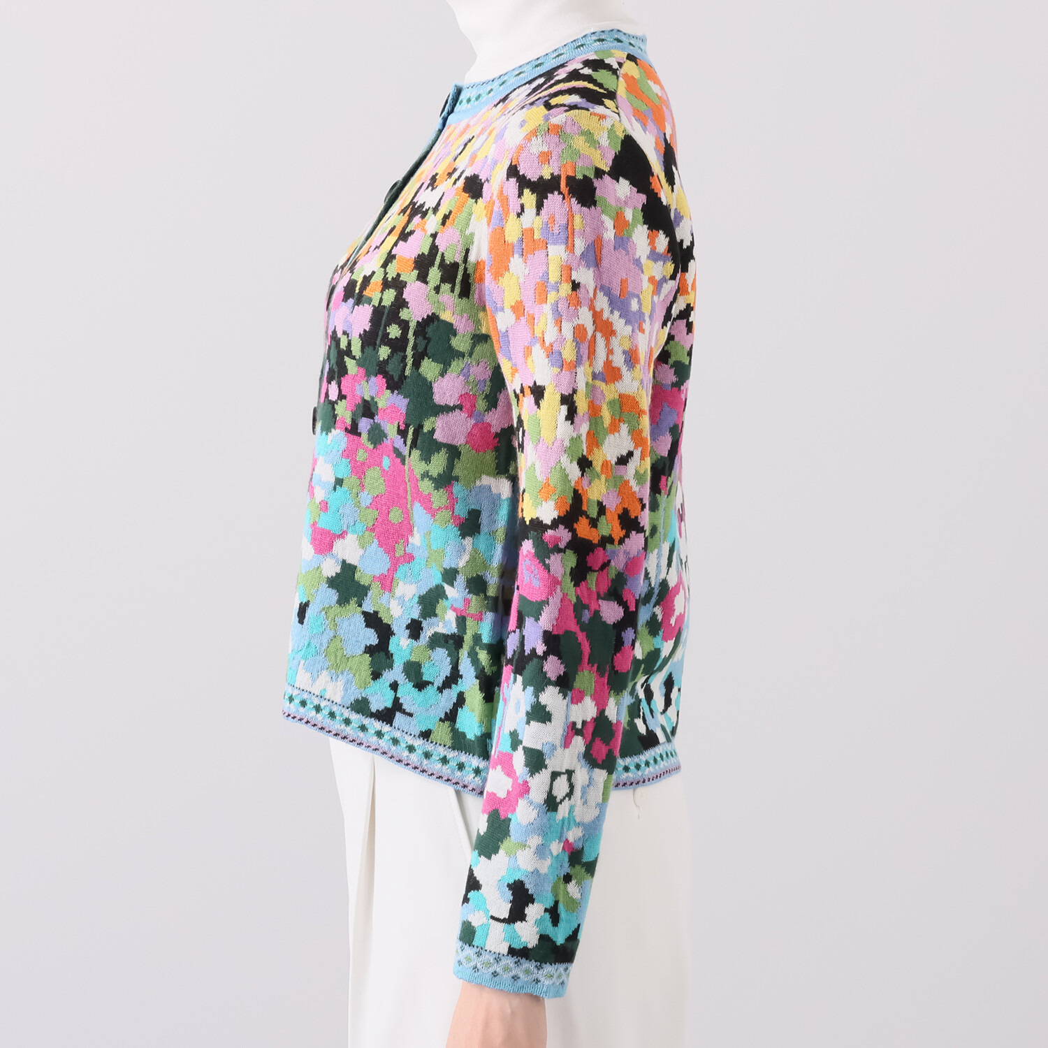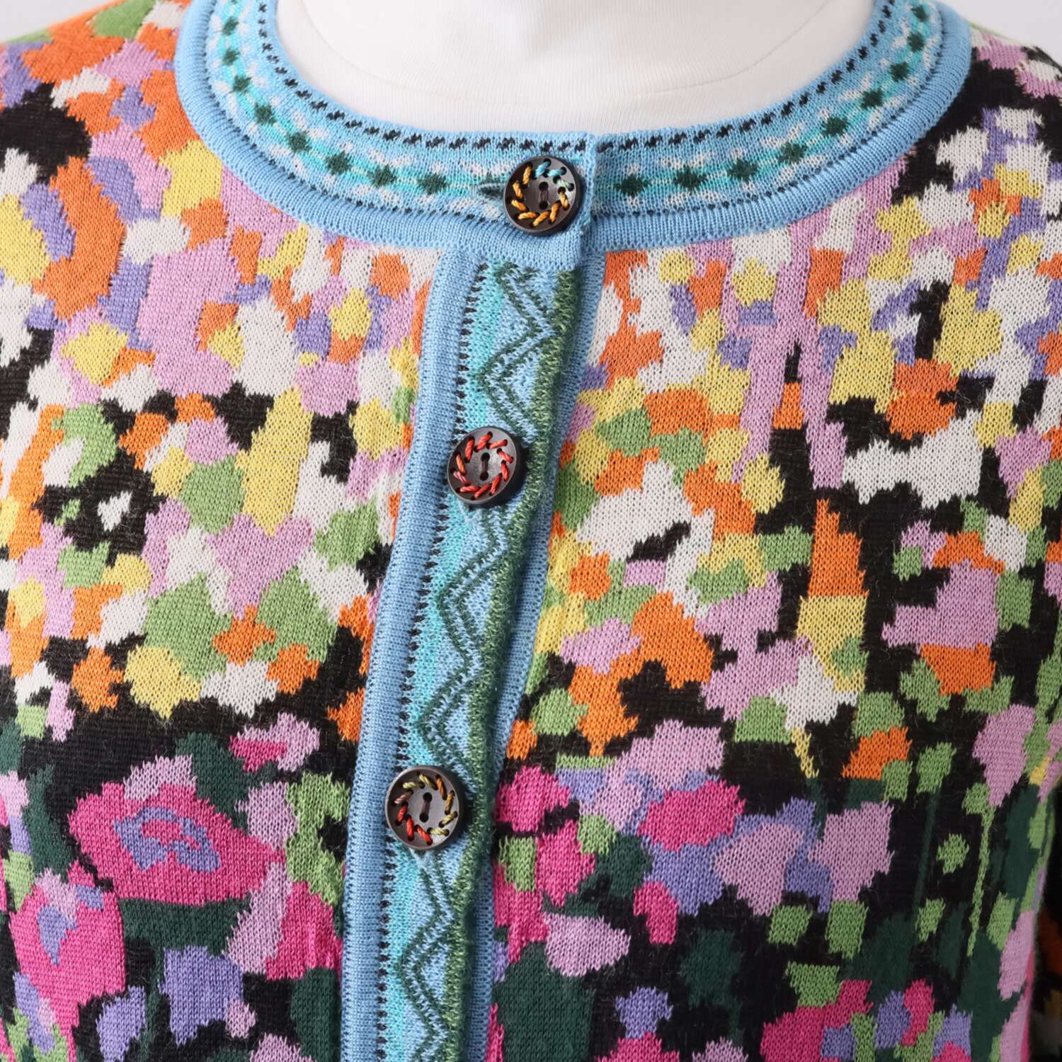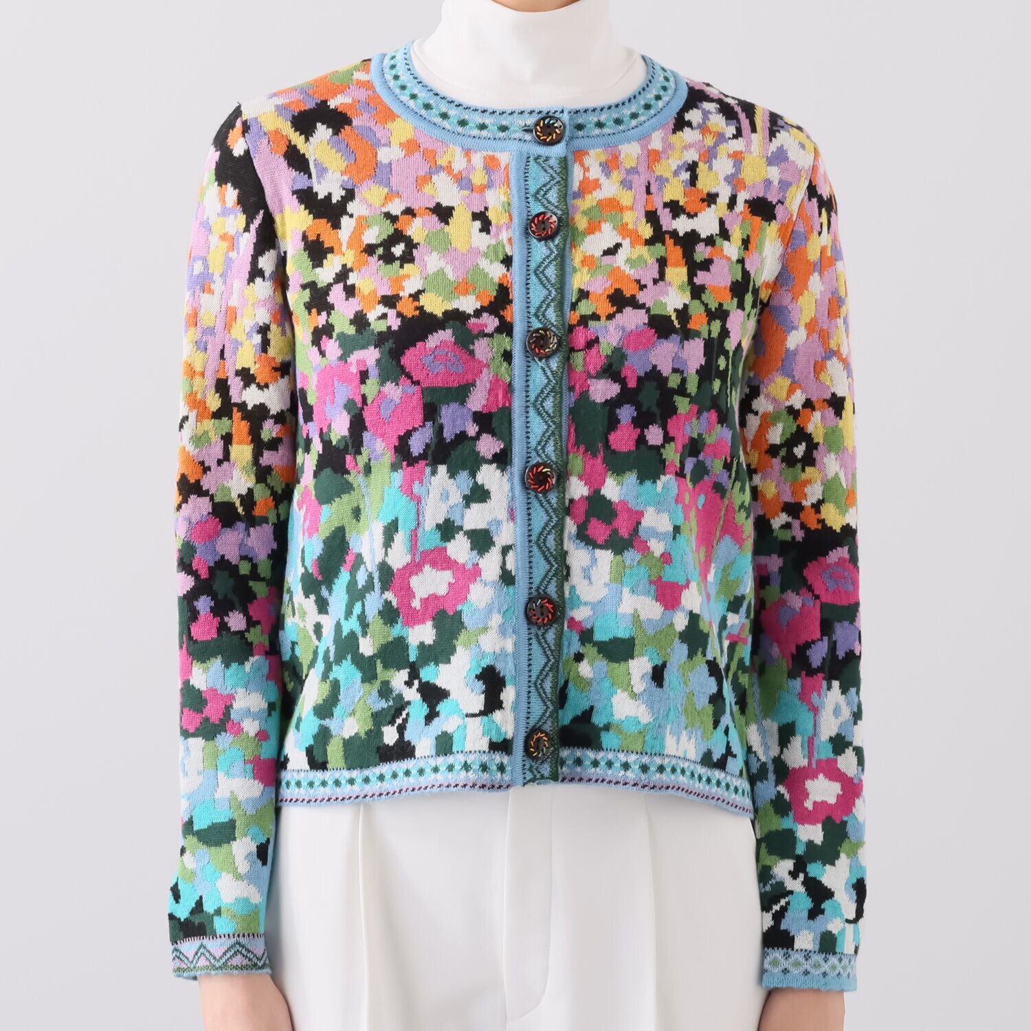 フランス語で”お花畑”を意味する”シャン・ド・フルール”をイメージした、豊かで複雑な花柄のカーディガンです。