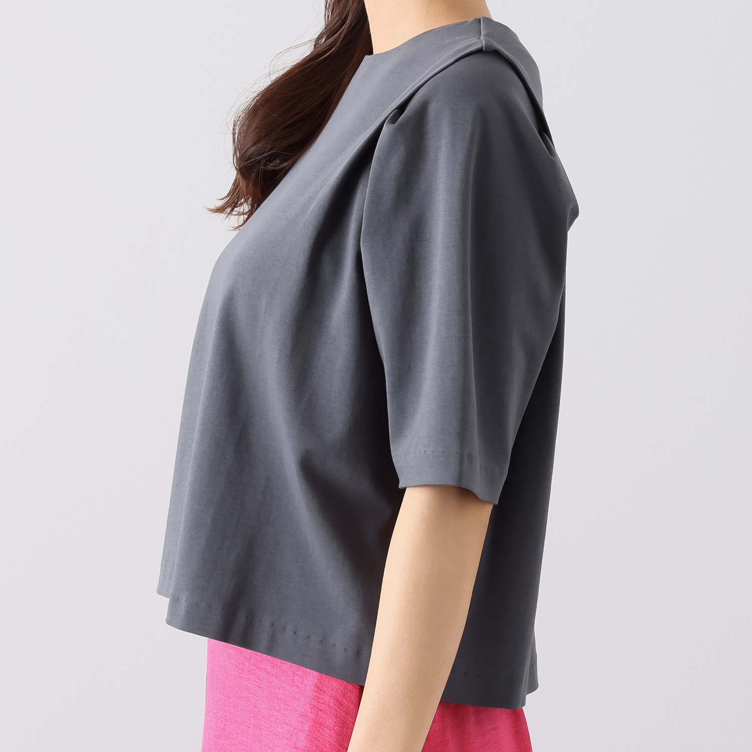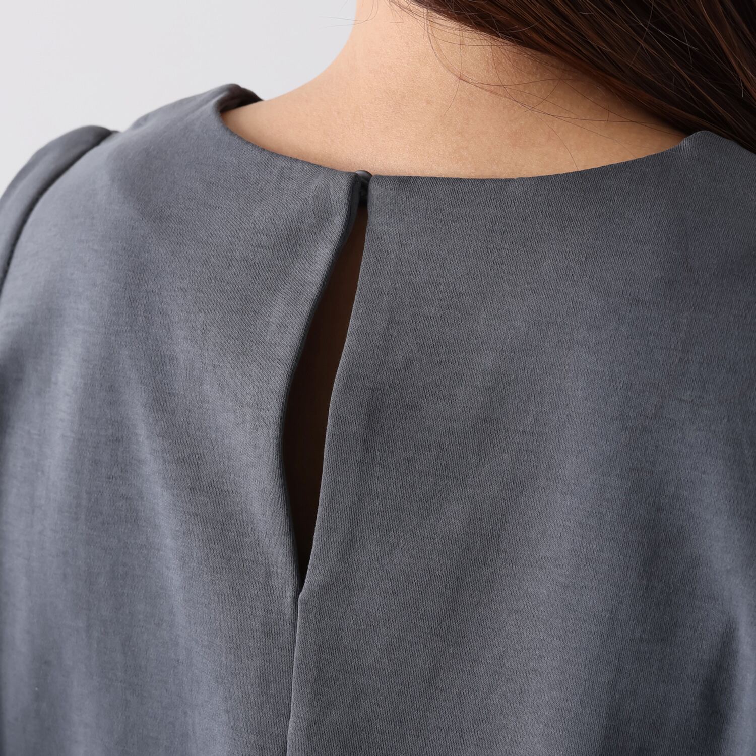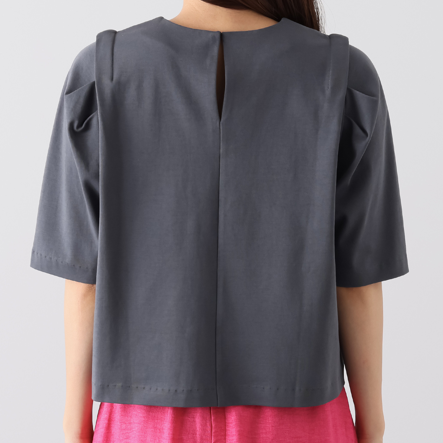 身頃はゆとりを持たせた着心地の良いつくりですが、コンパクトめの肩幅と袖付け部分入れたタックにより縦のラインが強調され、身体をすっきりと細く見せてくれます。