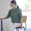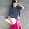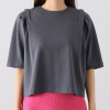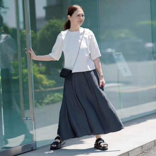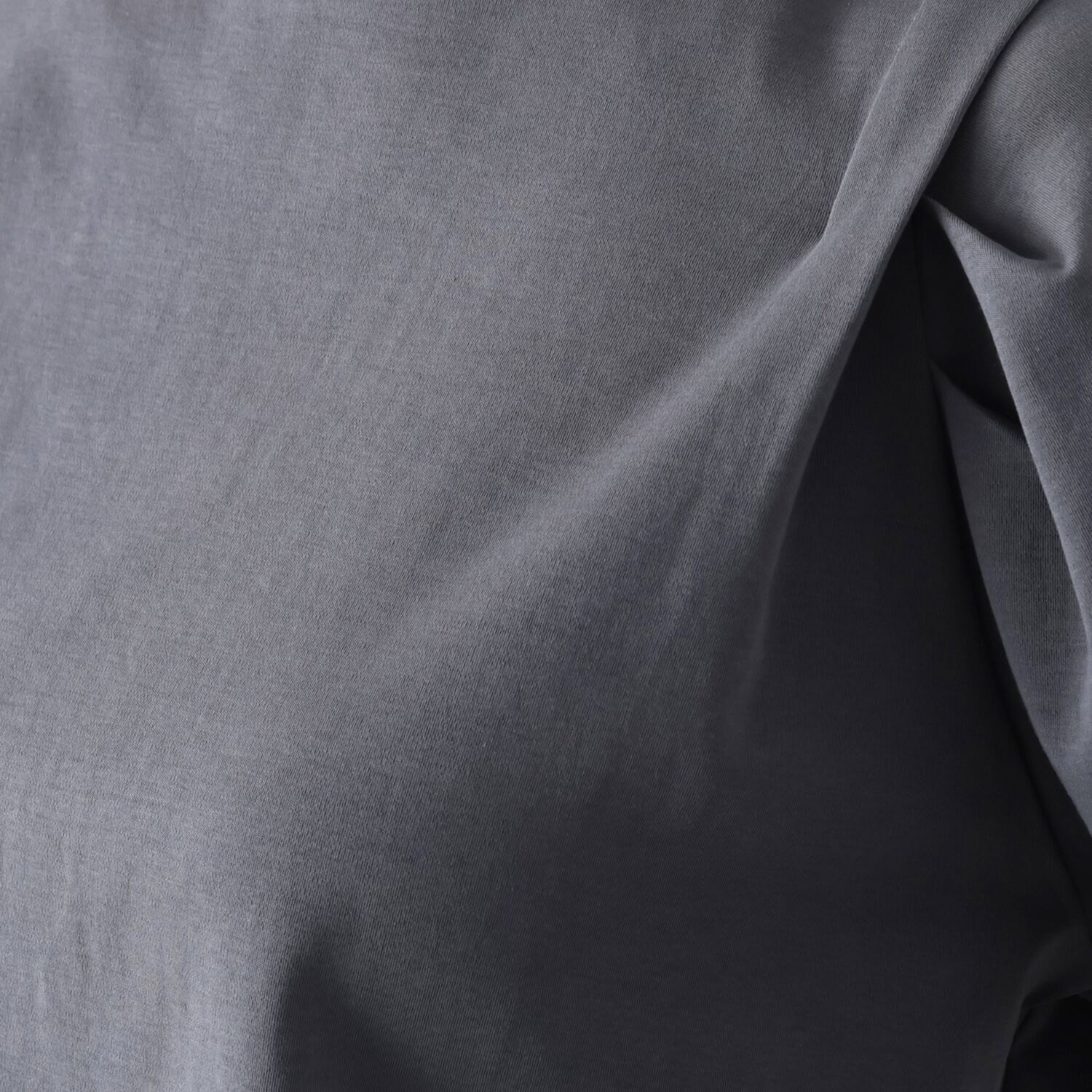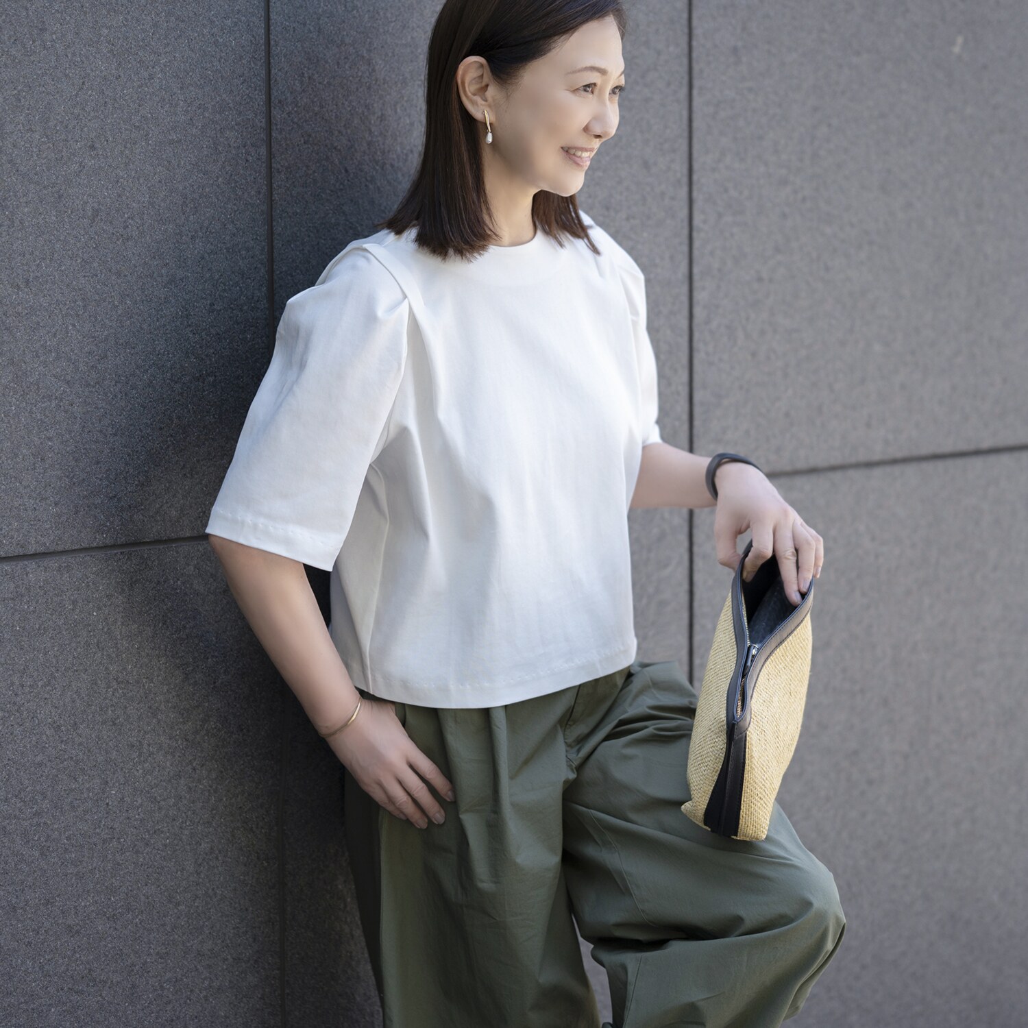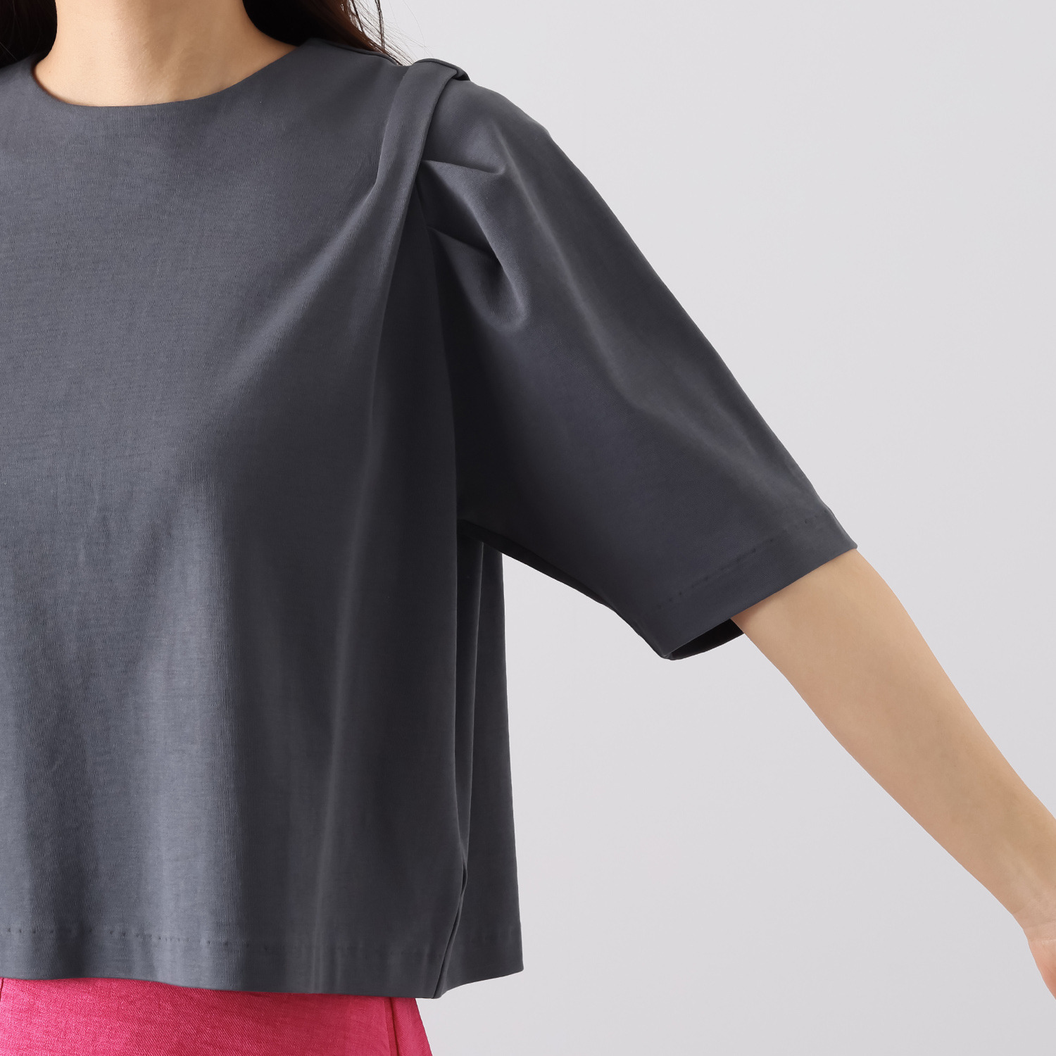 身頃はゆとりを持たせた着心地の良いつくりですが、コンパクトめの肩幅と袖付け部分入れたタックにより縦のラインが強調され、身体をすっきりと細く見せてくれます。