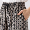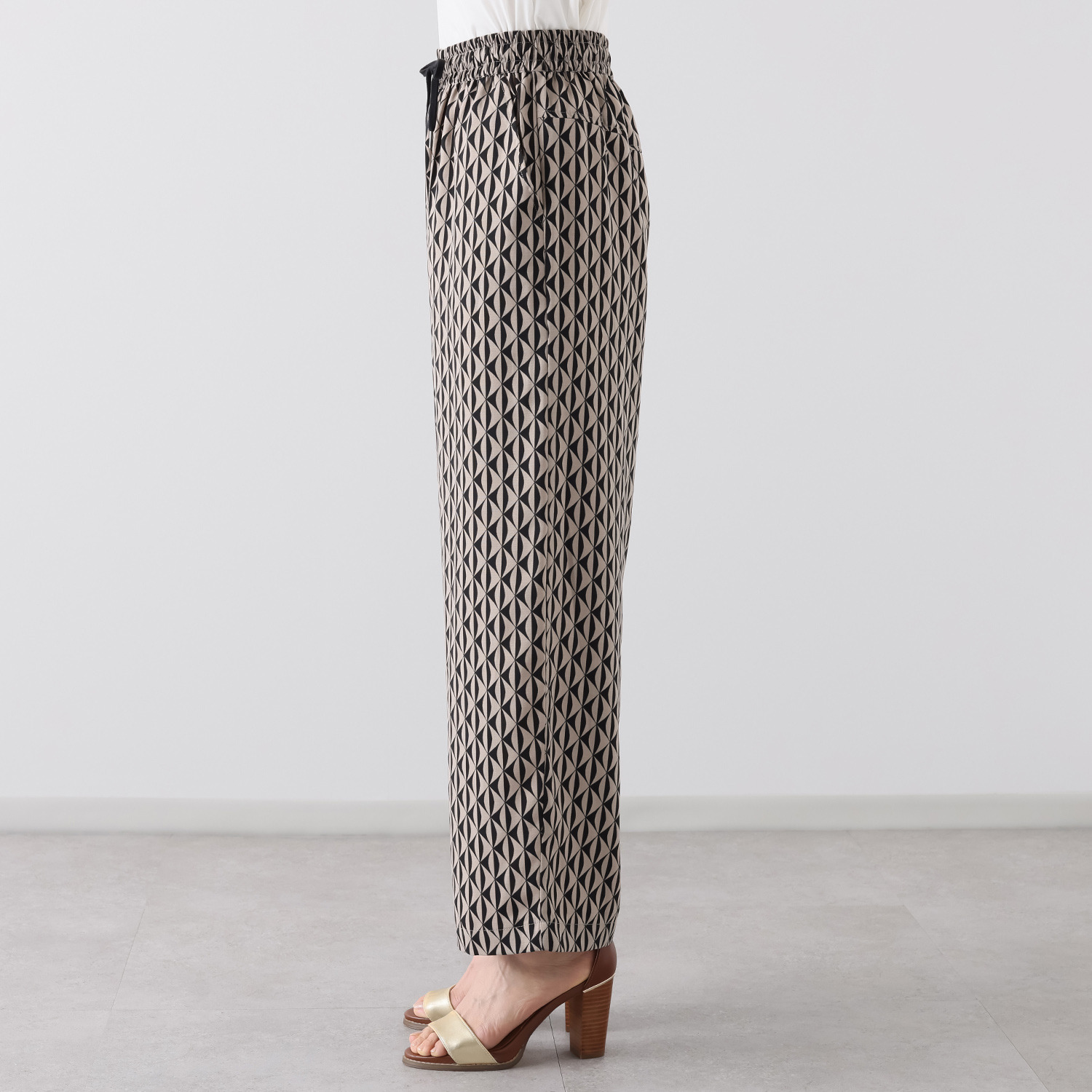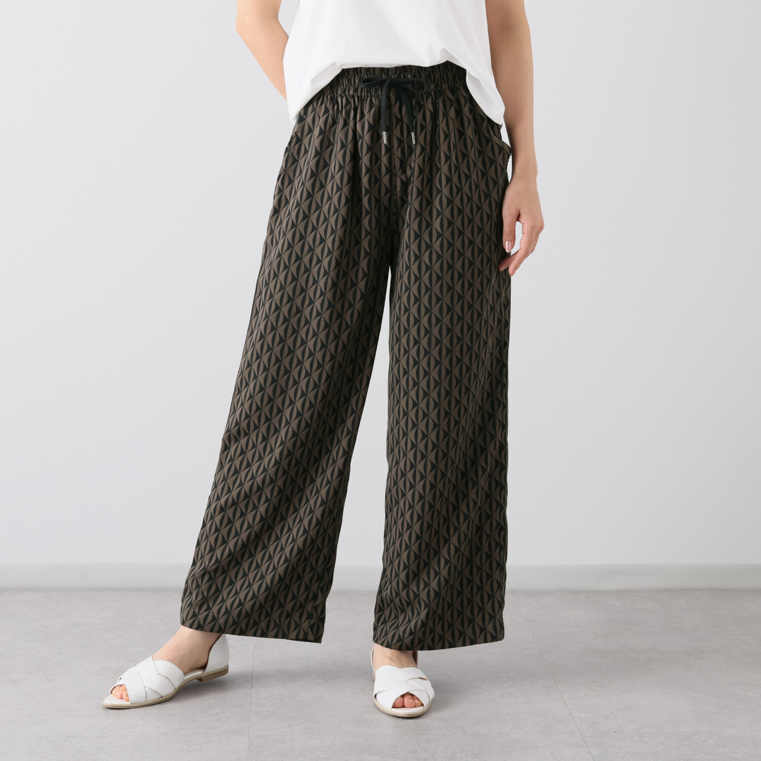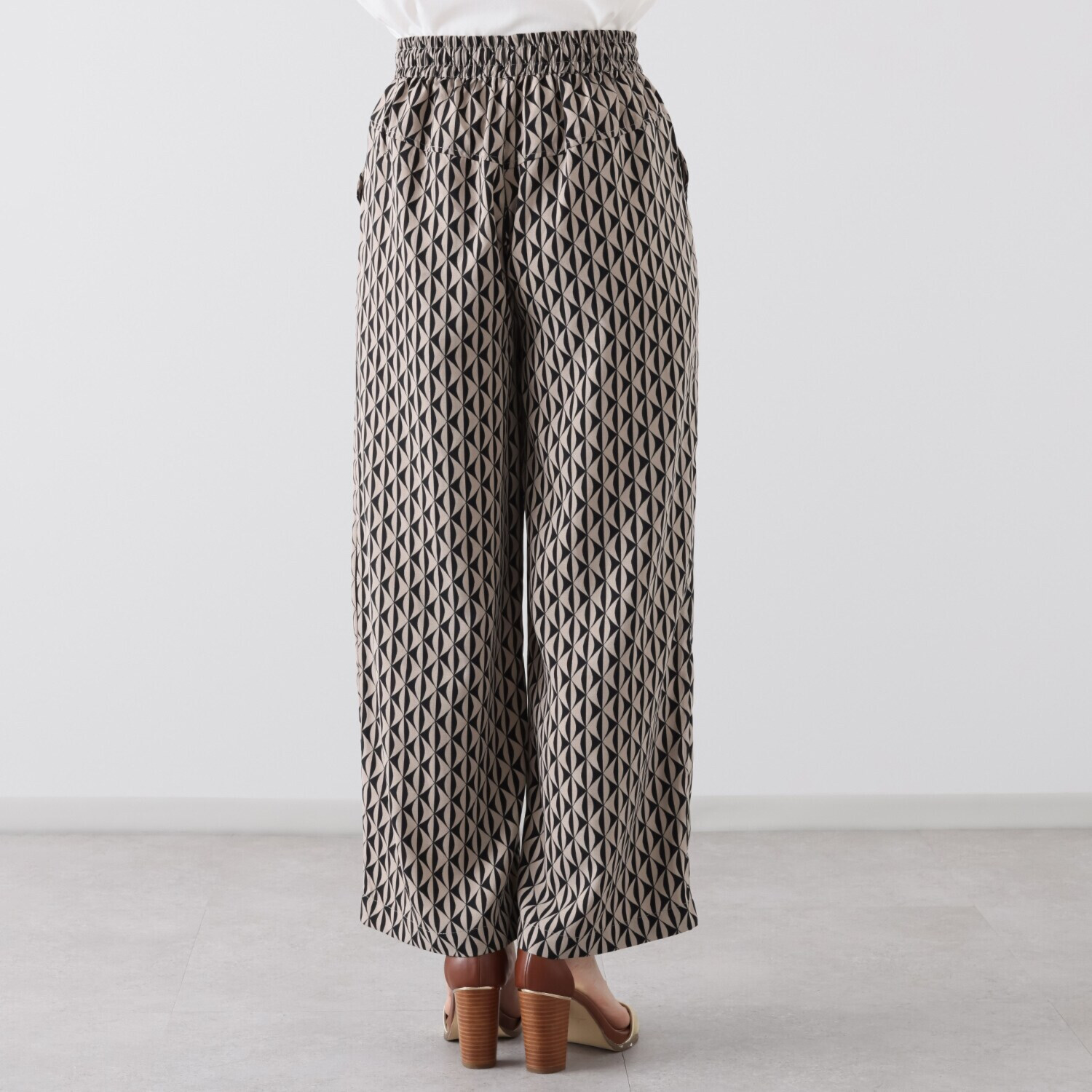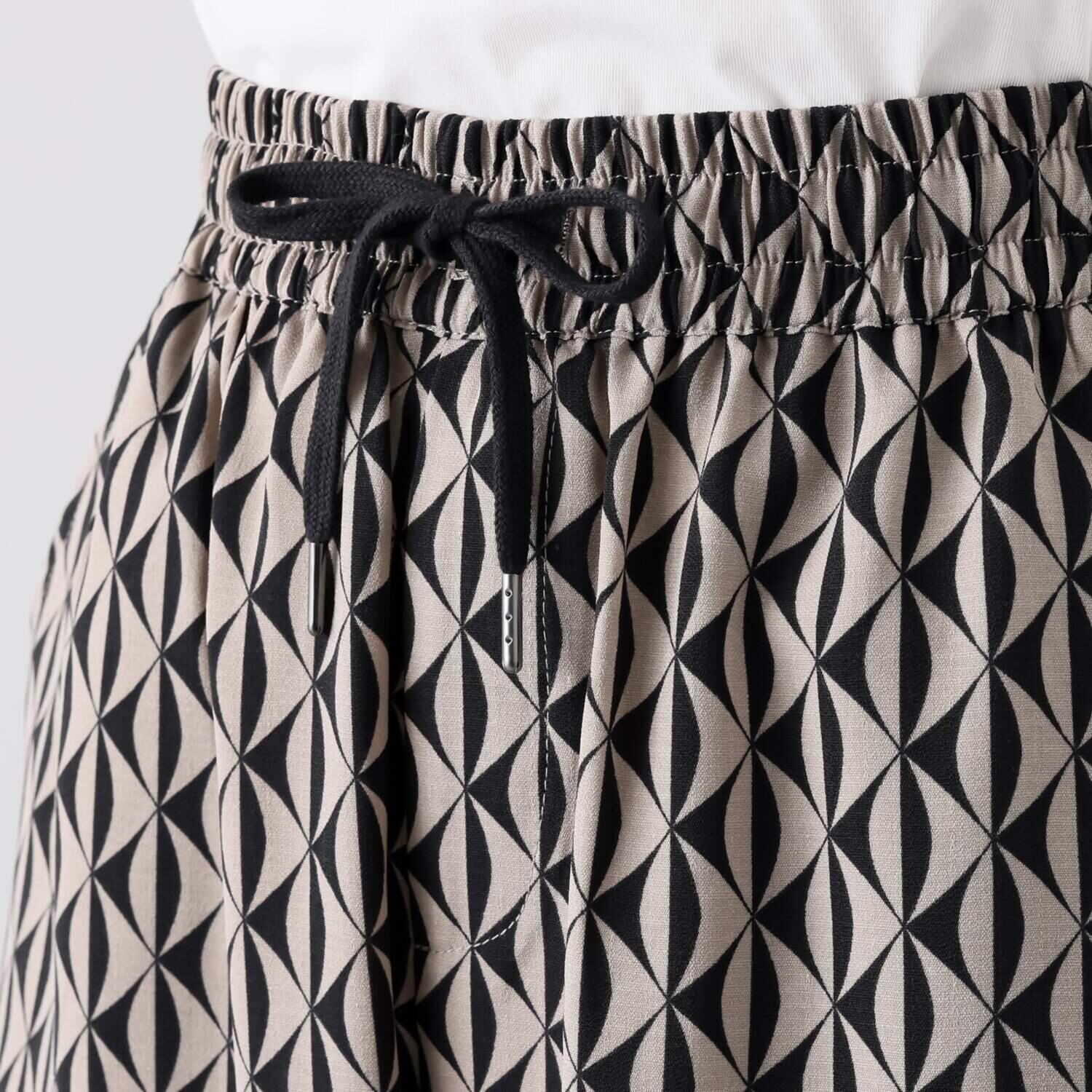 幾何学柄プリントをほどこした、天然素材のような肌触りが特徴の、ポリエステル100%の布帛素材を使用。