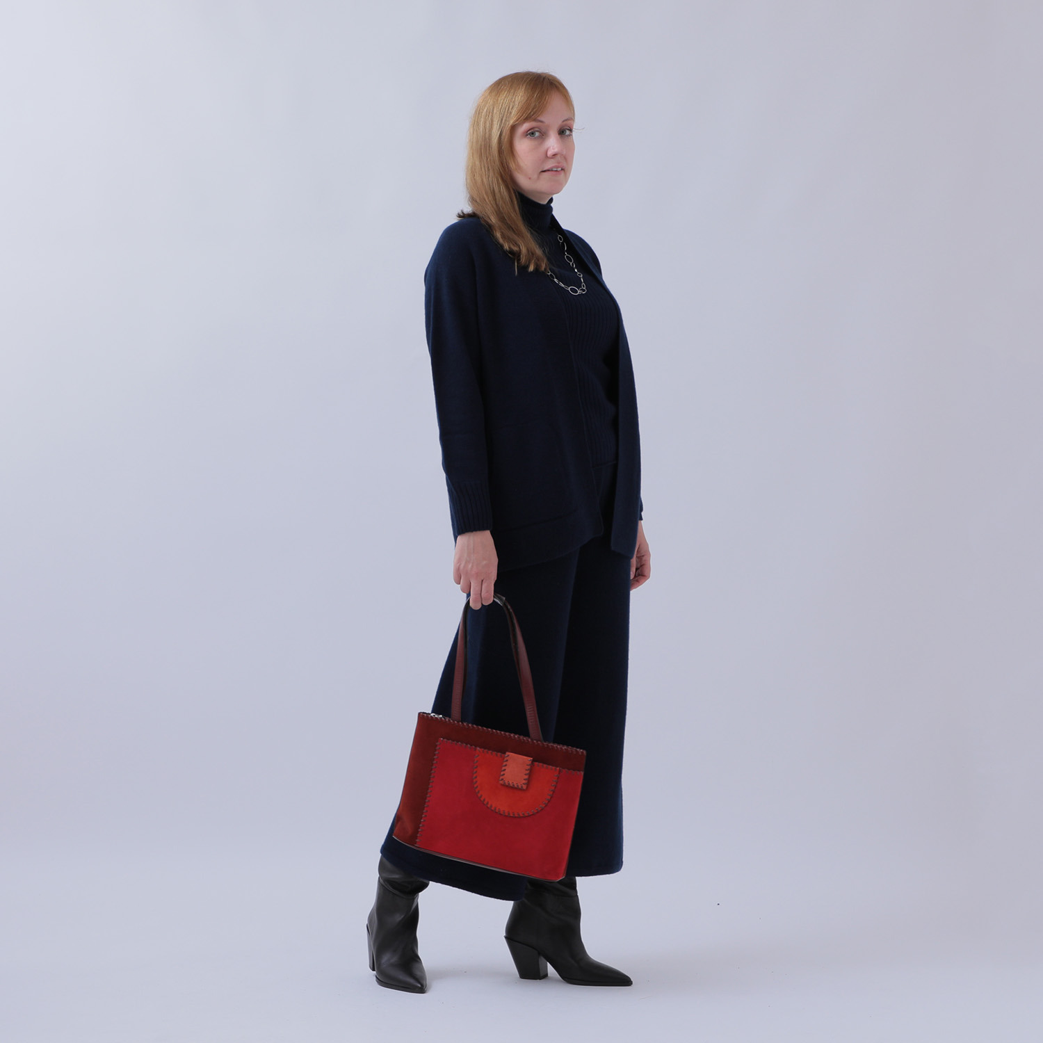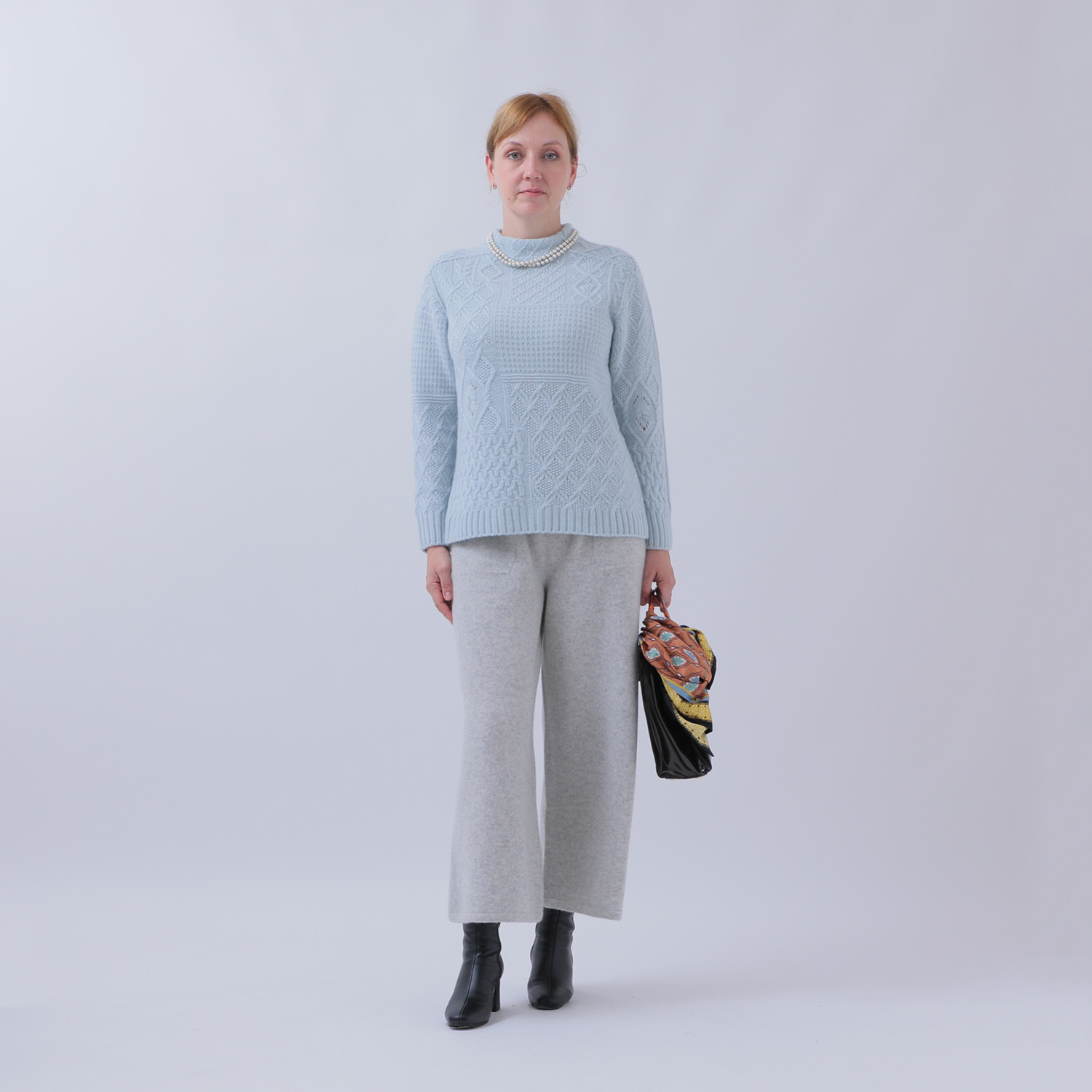 たっぷりと贅沢に糸を用いてミドルゲージで天竺編みベースに編み立てました。