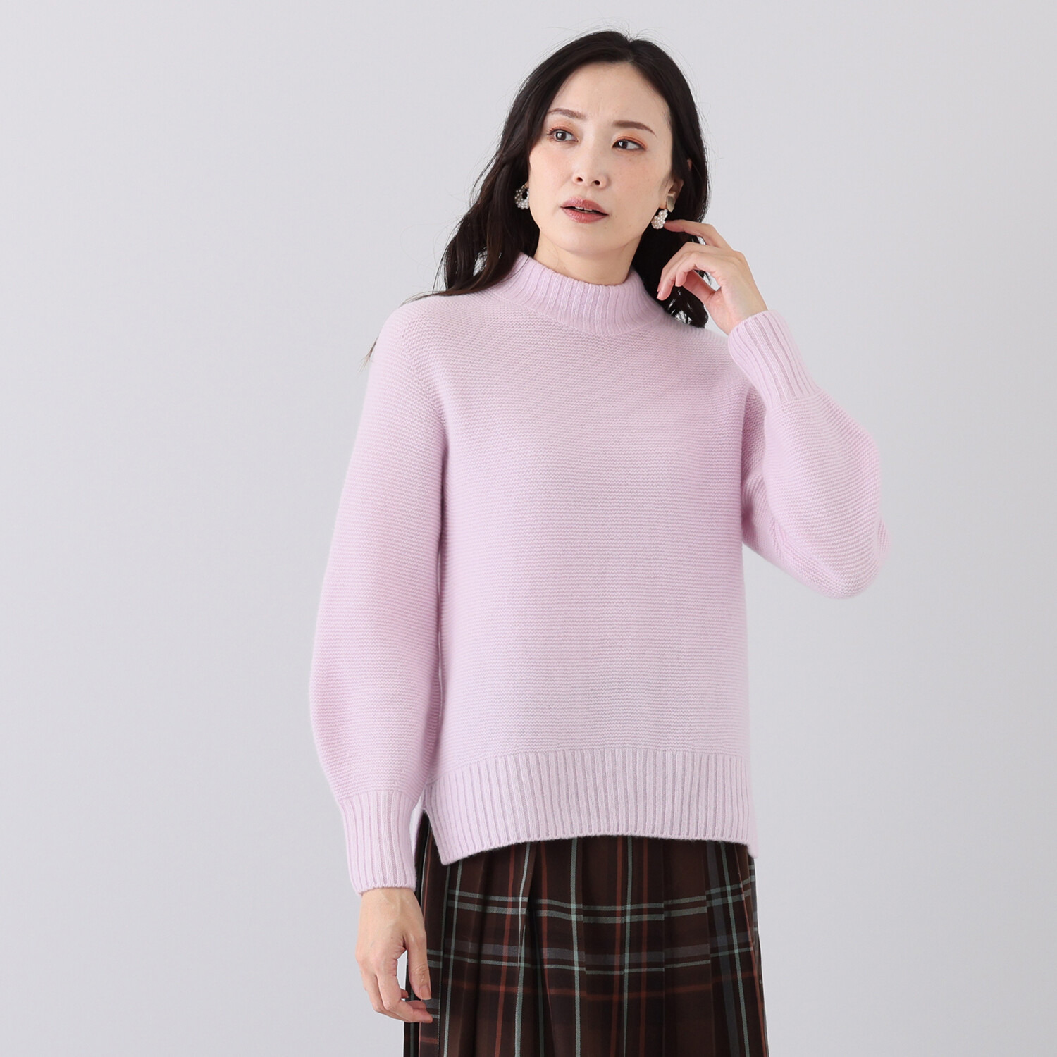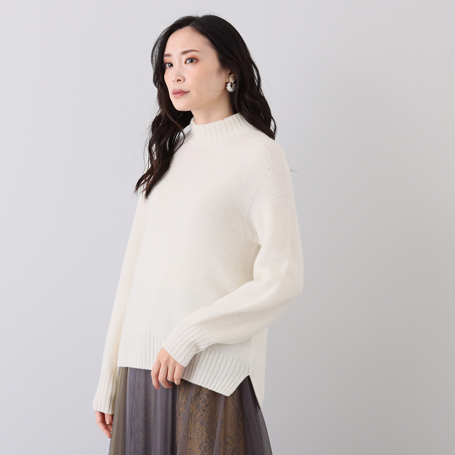 カシミヤをたっぷりと使用して凹凸感がありボリューミーなパール編みベースで編み立てました。