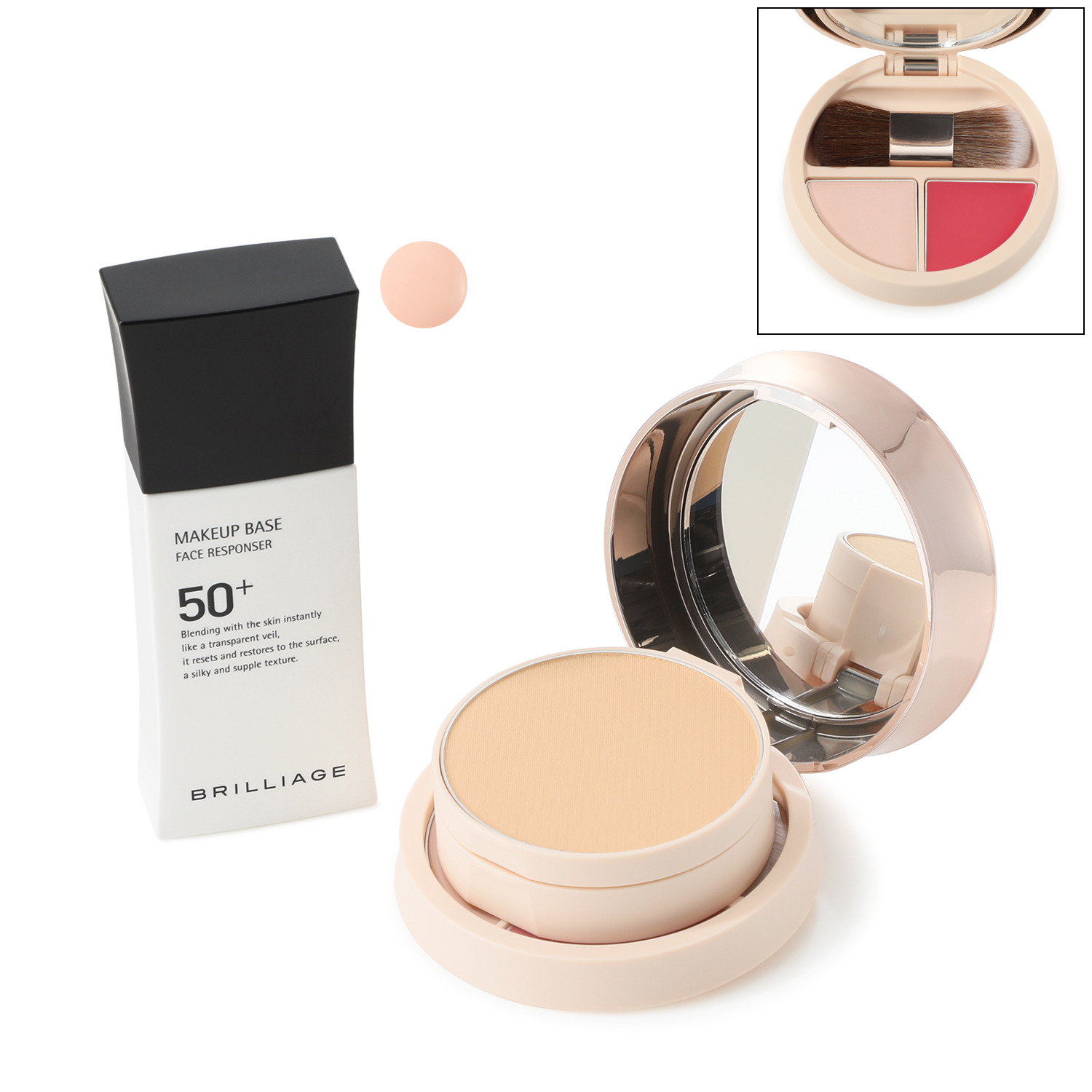 <ブリリアージュ>より、SPF50+、PA++++のパウダリーファンデーション、チーク&リップ、ハイライト、スポンジ、ダブルブラシをセットしたマルチファンデーションパレット、軽やかに伸びるテクスチャーでサーッとなじんで、素肌の上に薄く透明なフィルムベールを形成したように毛穴や乱れたキメなどのお肌の凹凸をカバーしてつるりとなめらかなお肌に整えるSPF50+、PA++++のUV化粧下地のセットです。
