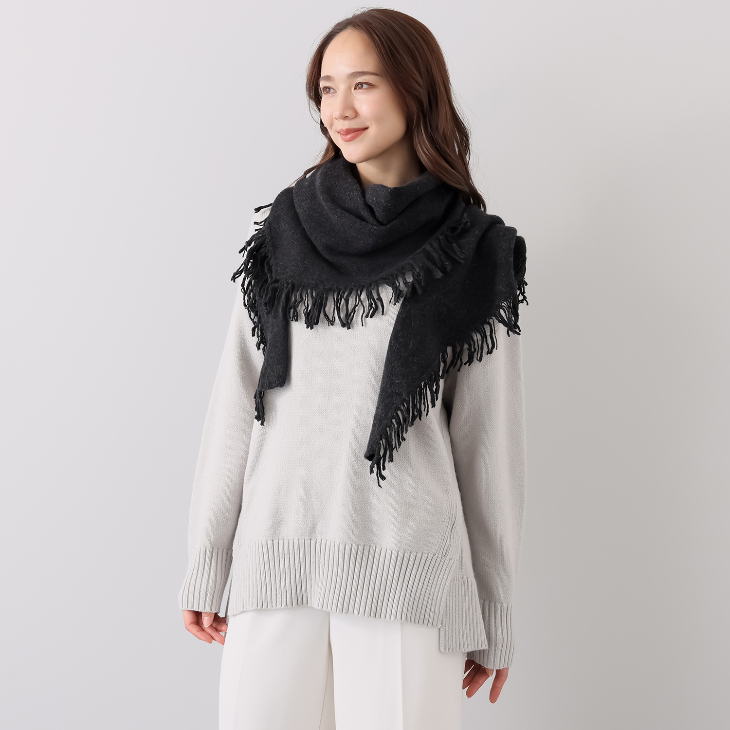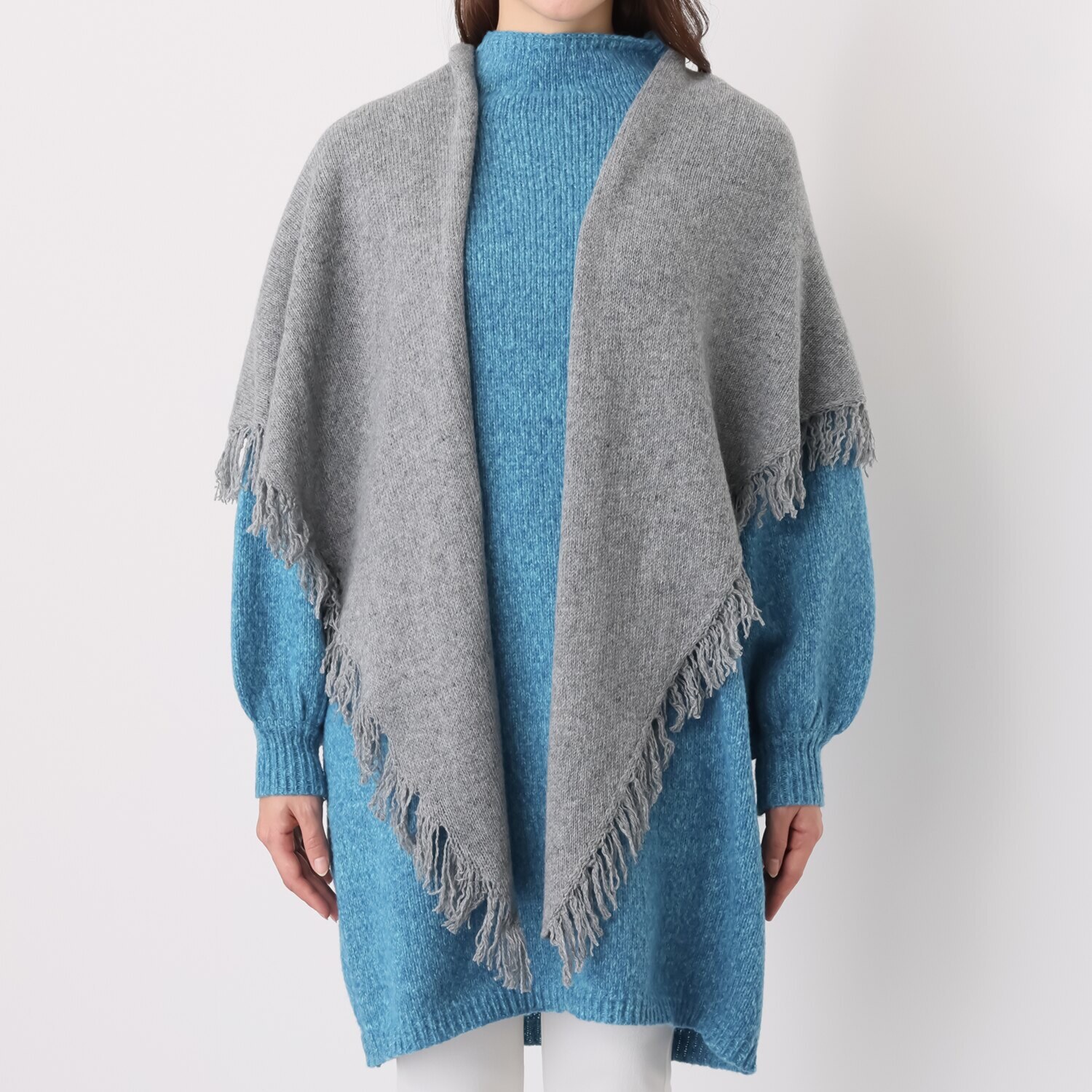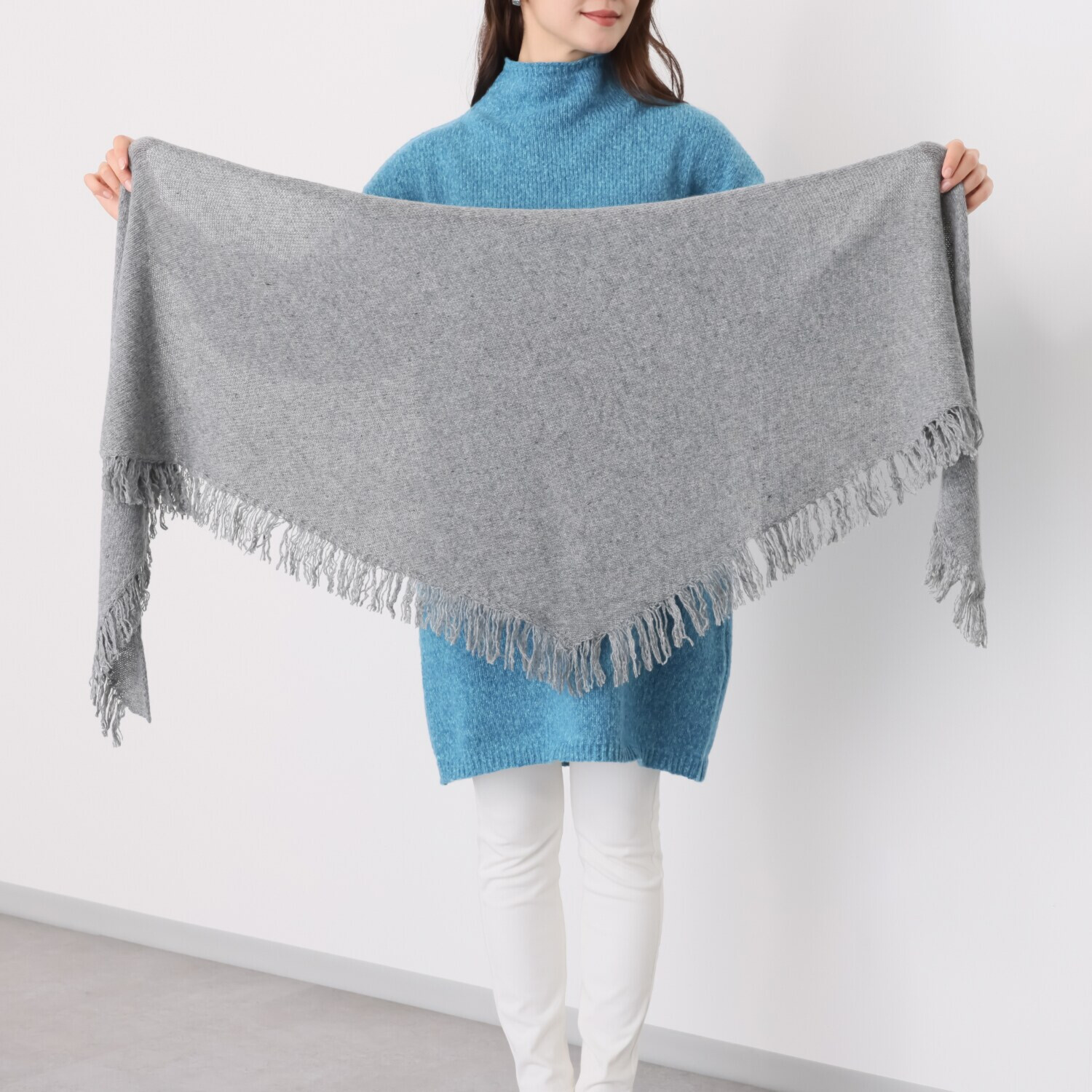 肩に掛けやすい三角形のフリンジ付きストールです。