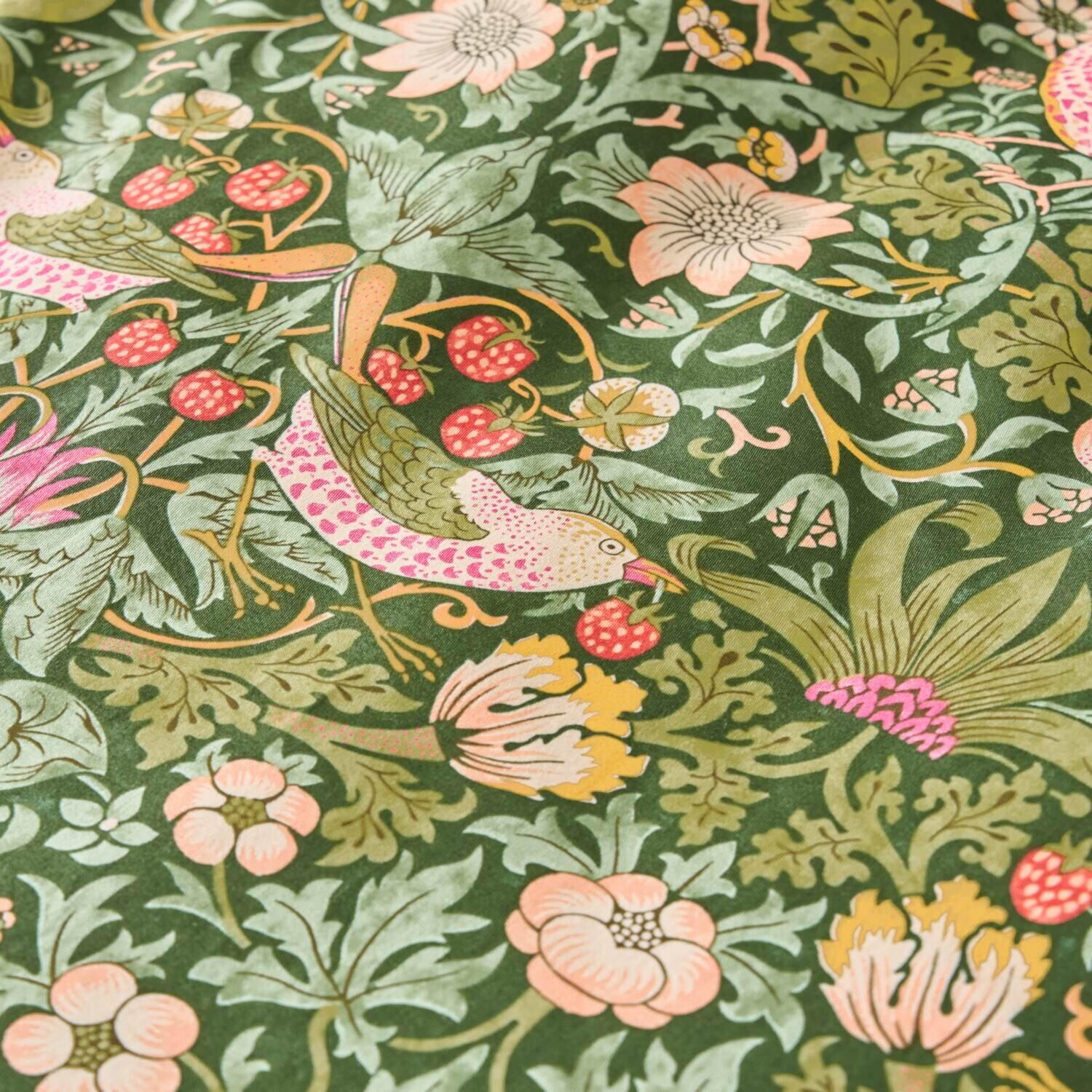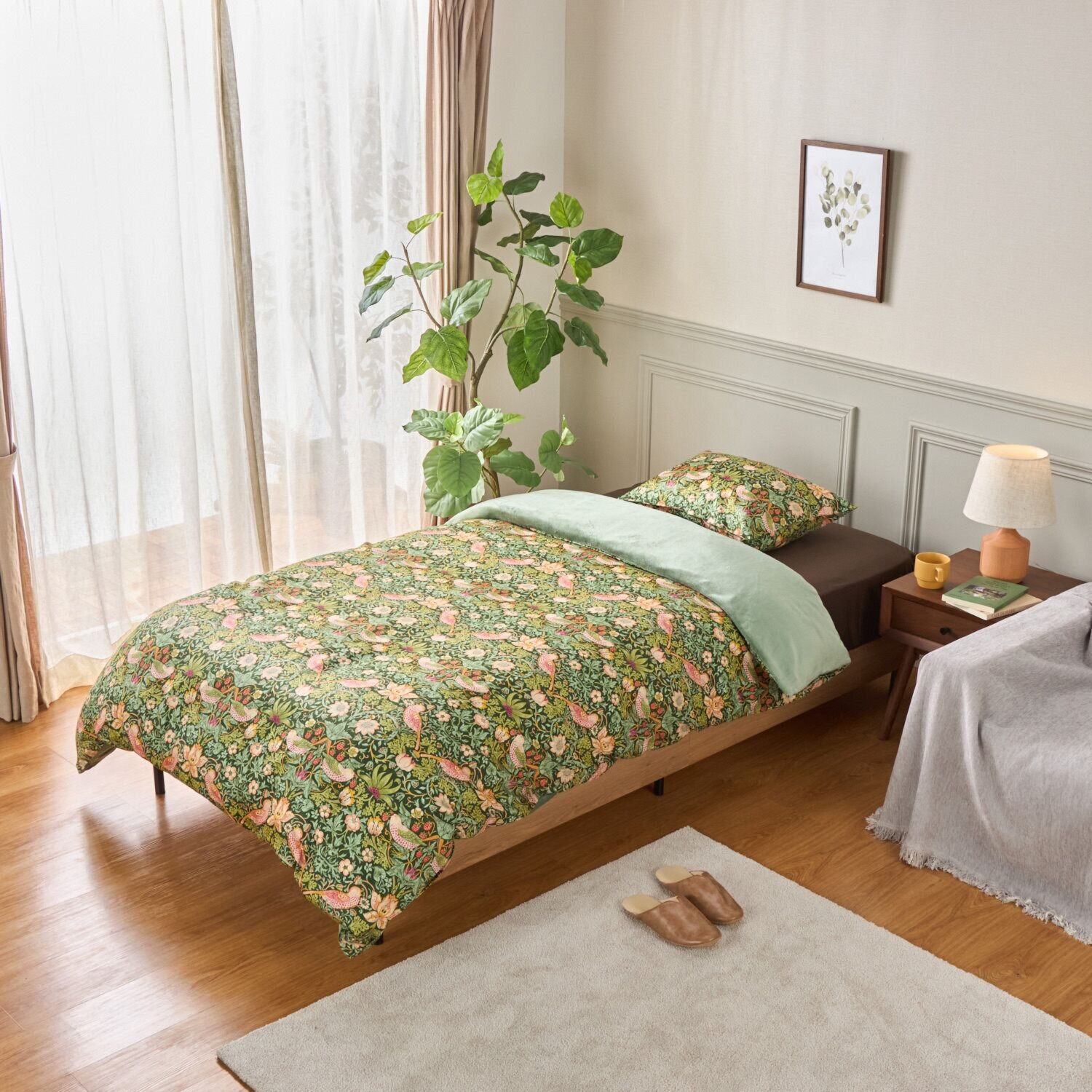 “いちご泥棒”のデザインの掛けふとんカバーは、一気に寝室をおしゃれでアート感あふれる空間にしてくれます。
