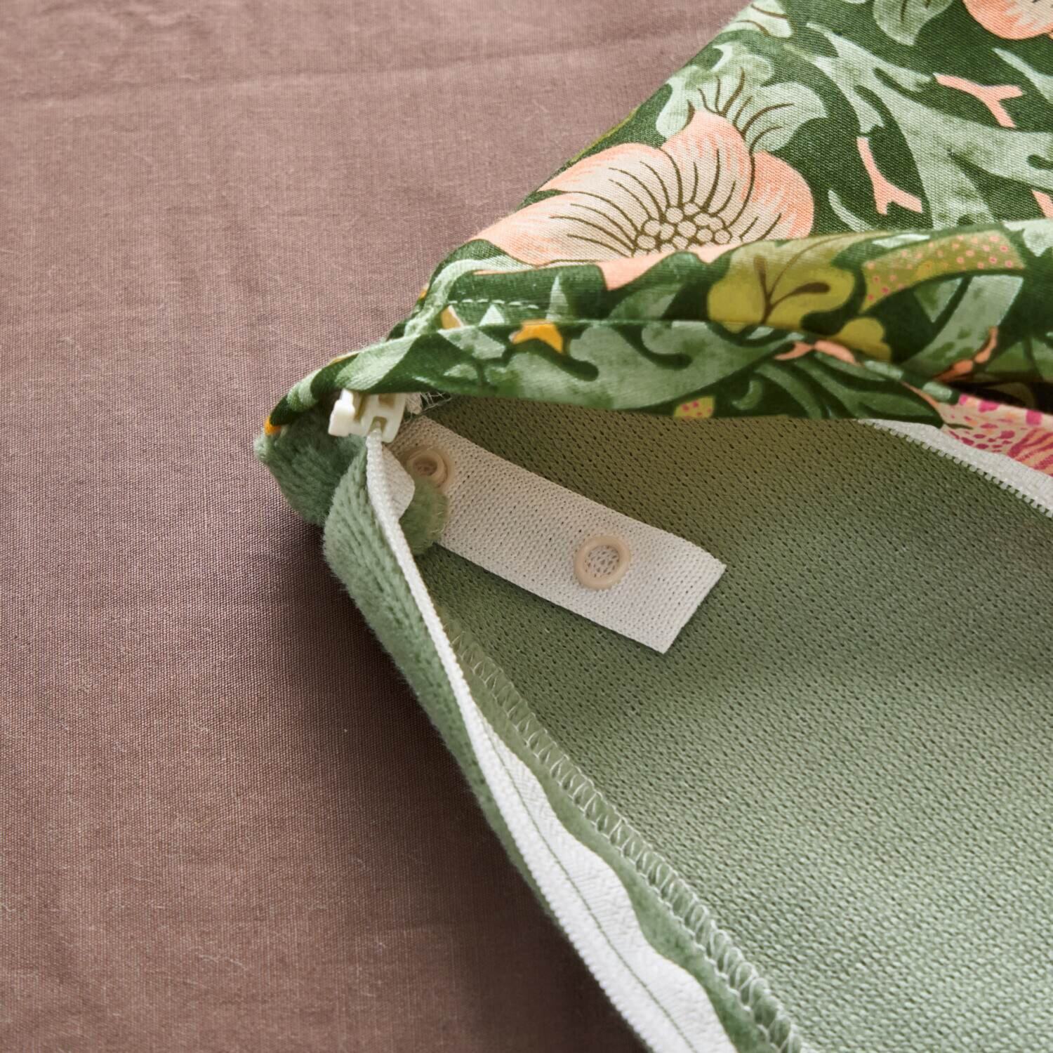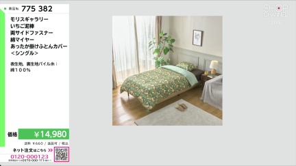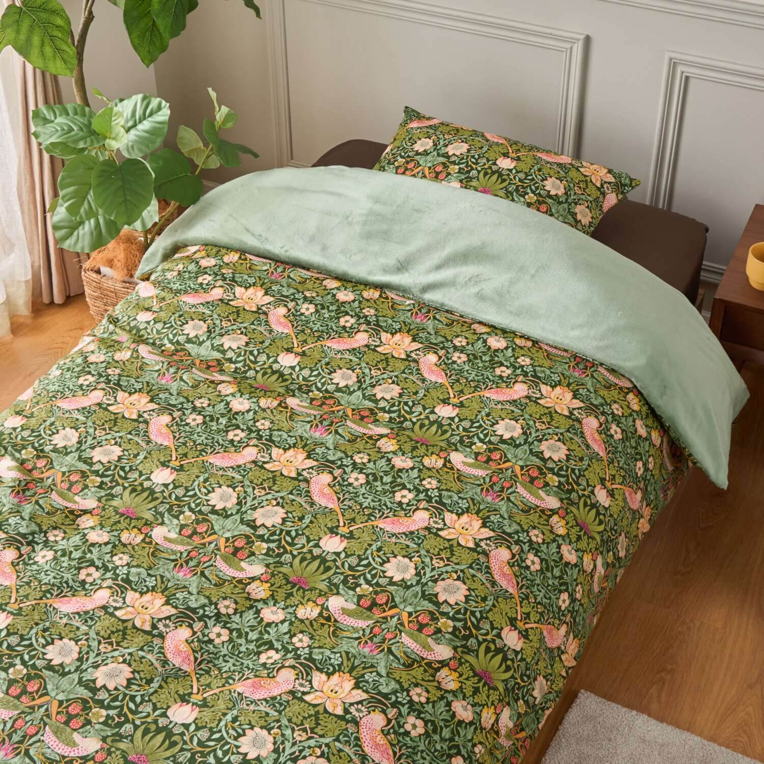 ウィリアム・モリスの人気のデザイン、“いちご泥棒”を表生地にほどこした、毛布とカバーを一体化した、日本製の綿マイヤー掛けふとんカバーです。