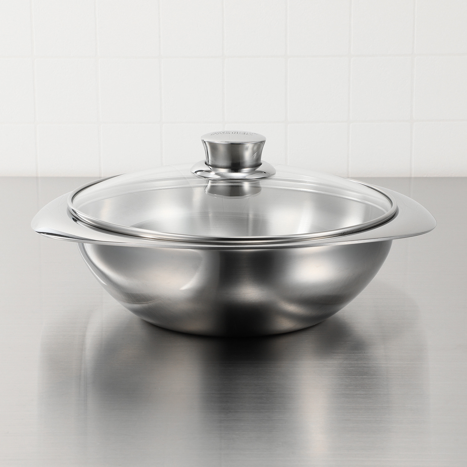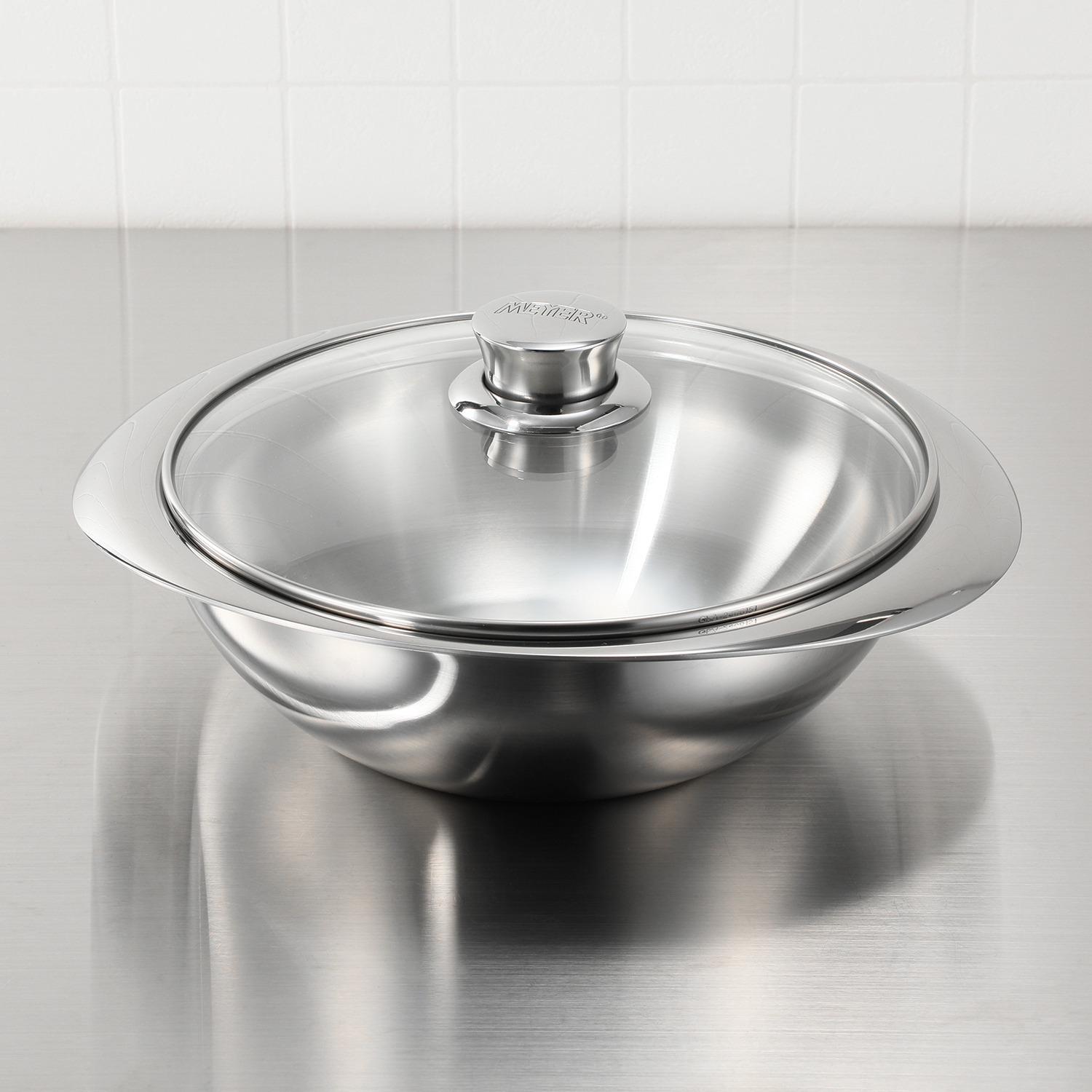 液体(水や汁)が鍋側面に沿って上昇し、中心に戻るような対流がしやすいので吹きこぼれしにくい形状になっています。