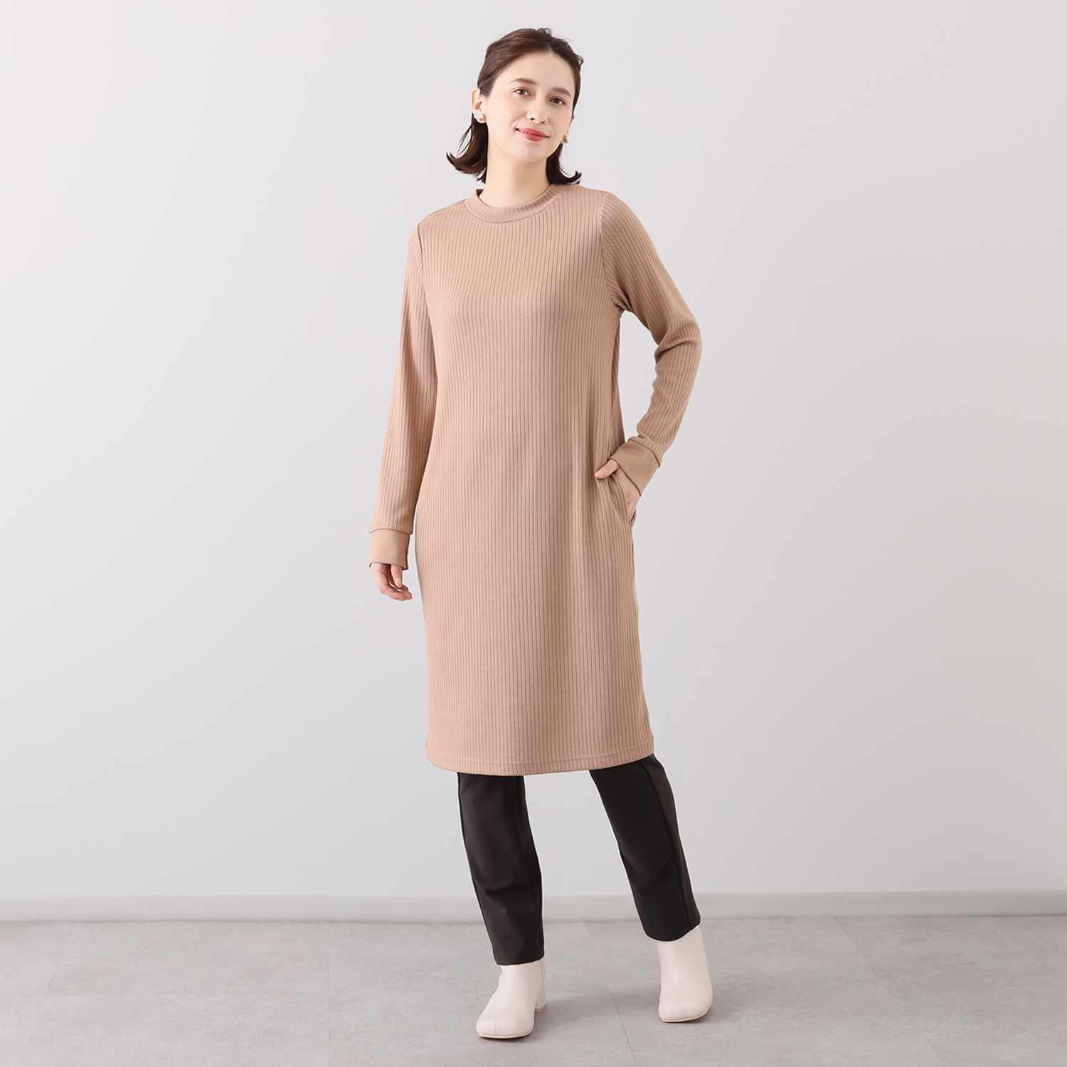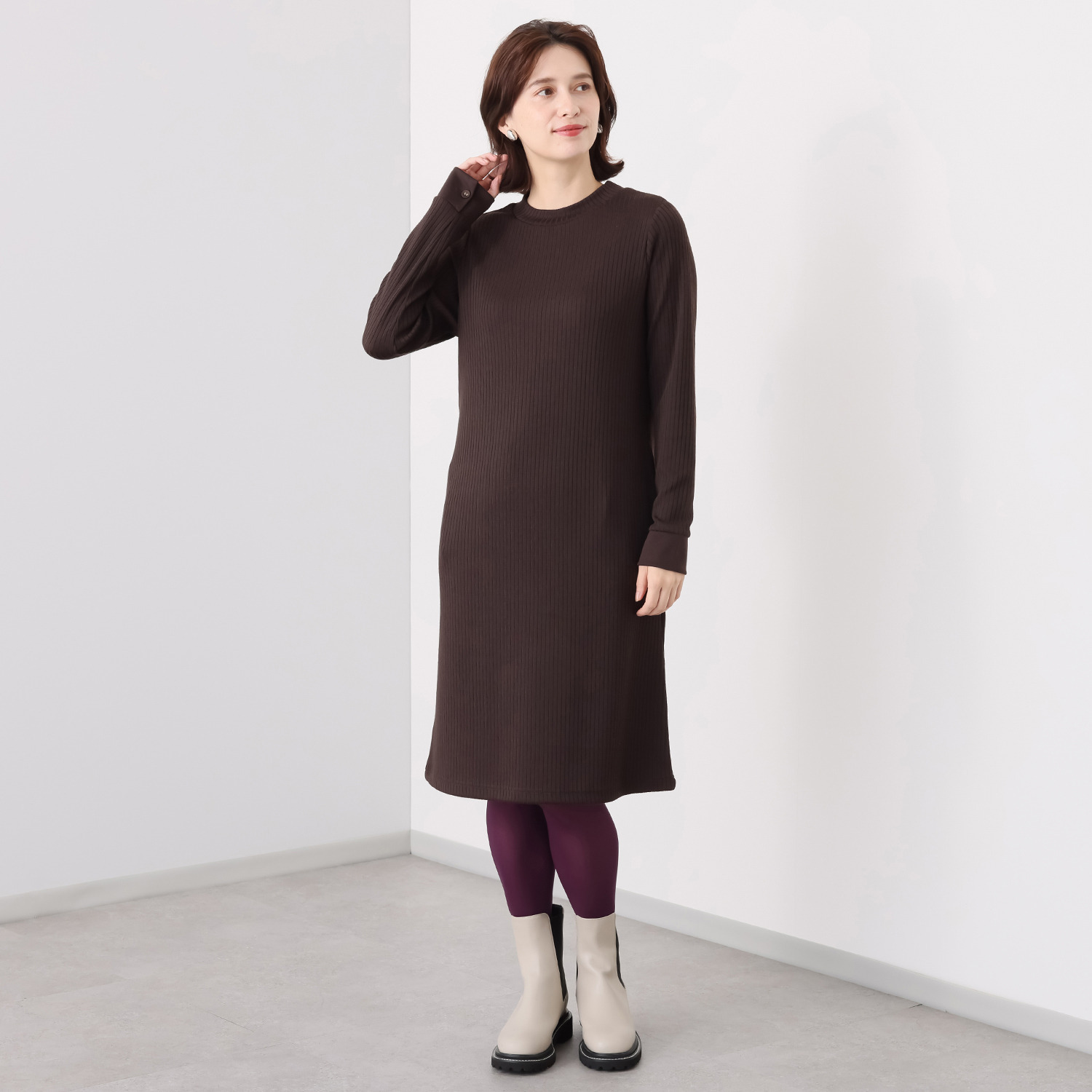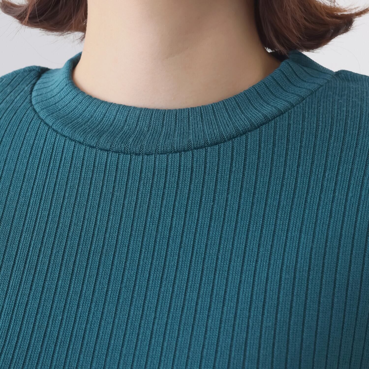 テレコ編みの特性により、適度なかさ高感と高い伸縮性、柔らかさがあり、タイトなクルーネックながら、着脱がスムーズです。
