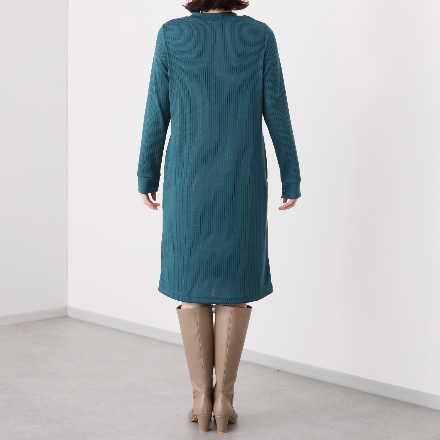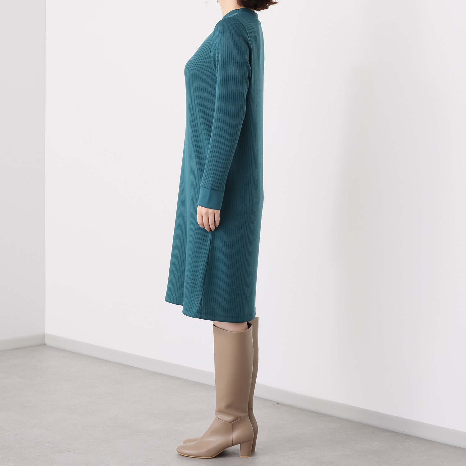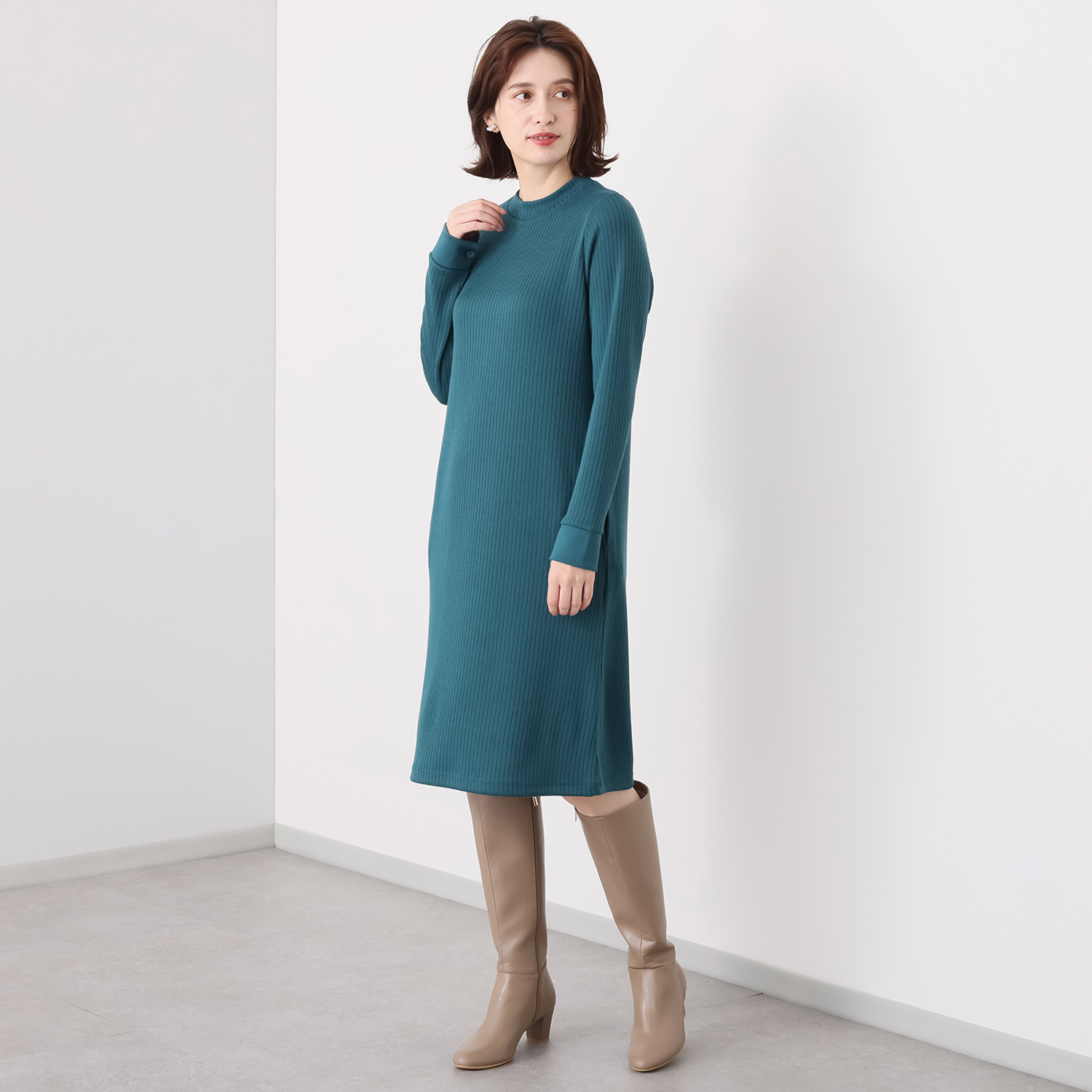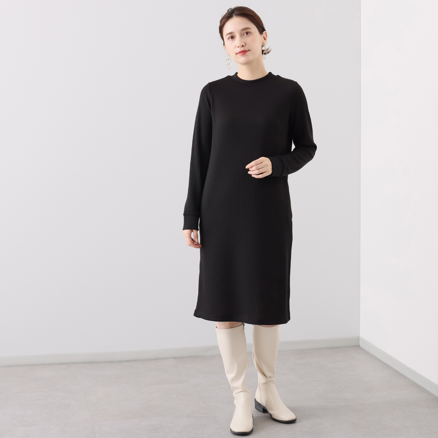 テレコ編みの特性により、適度なかさ高感と高い伸縮性、柔らかさがあり、タイトなクルーネックながら、着脱がスムーズです。