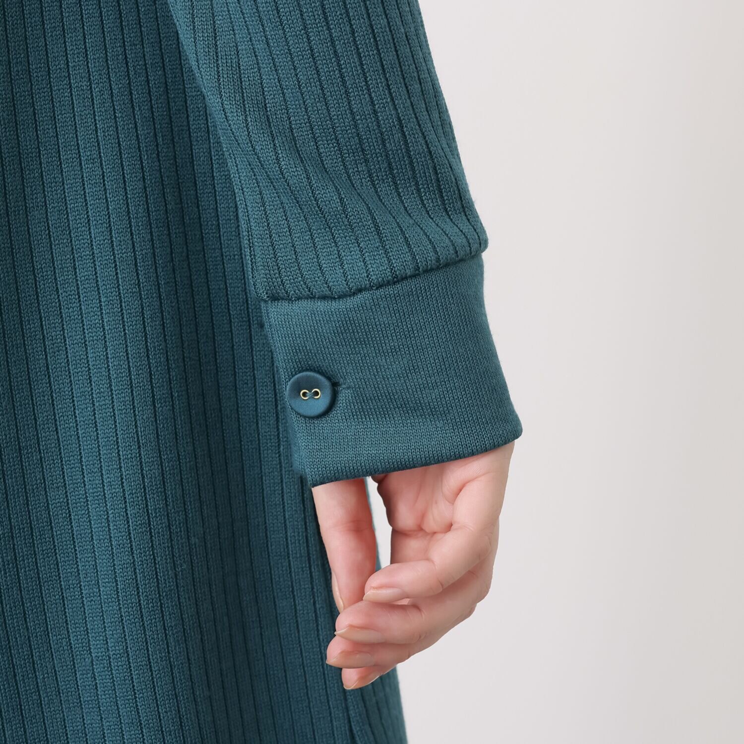 袖口のカフスには同じ糸で編み立てた天竺生地を用い、デザイン性のある包みボタンをアクセントにあしらいました。