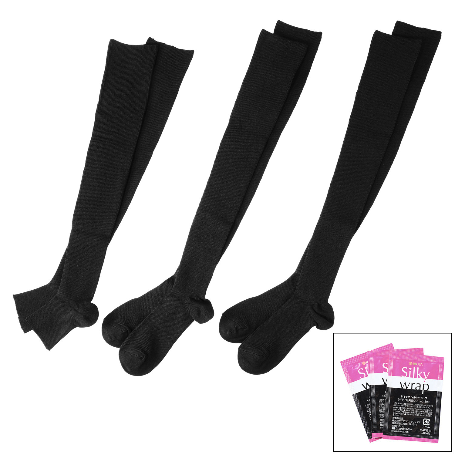 お肉は動きます!”をモットーとするボディケアブランド、<リオッサ>より、隠れ家的サロンを経営するビューティマスター小野砂織(おの さおり)さんが、現場で得た経験をもとに美脚を目指して一から開発した、寝ている間も脚をケアできる、着圧タイプの「寝るときソックスV 3足セット シルキーラップ パウチ付」のご紹介です。