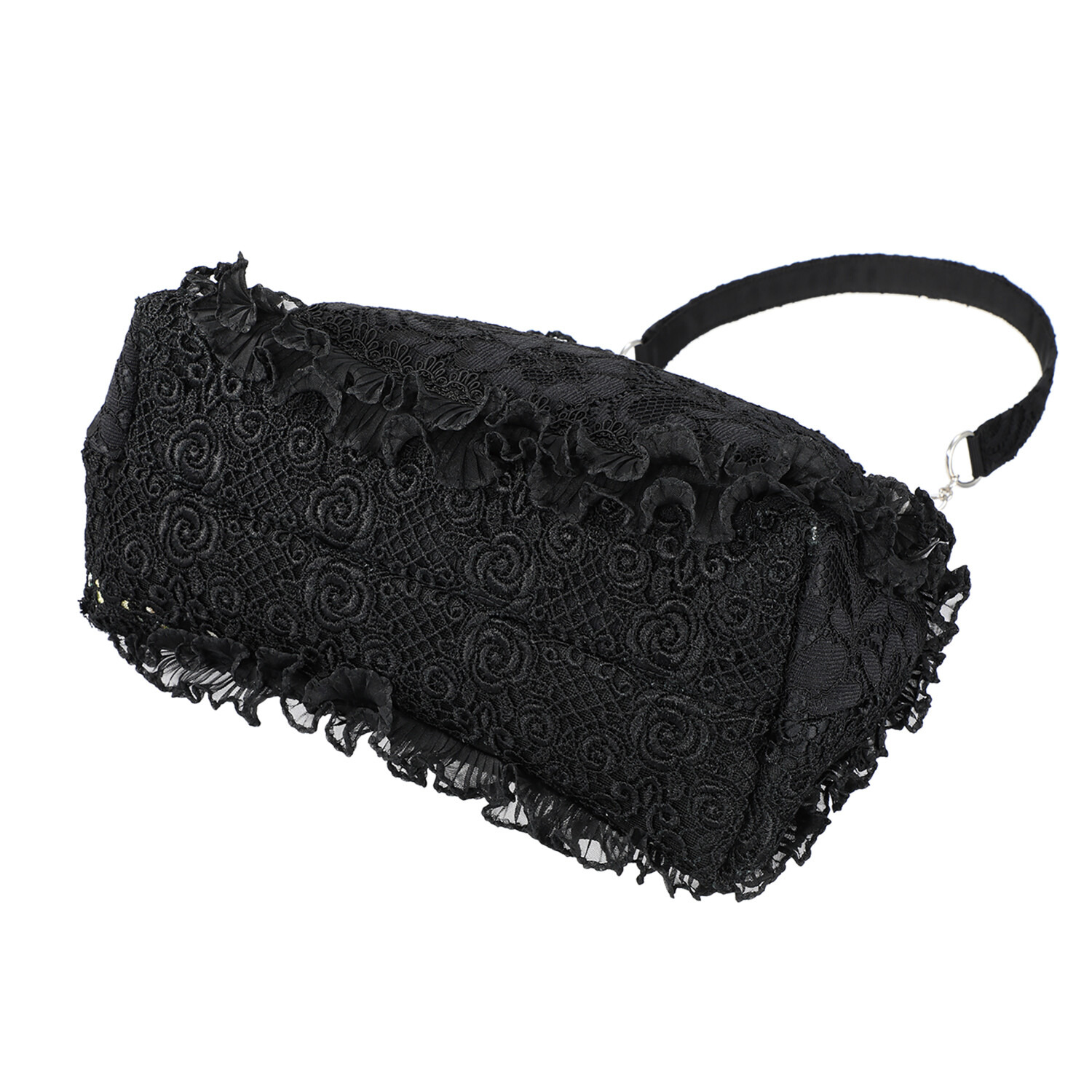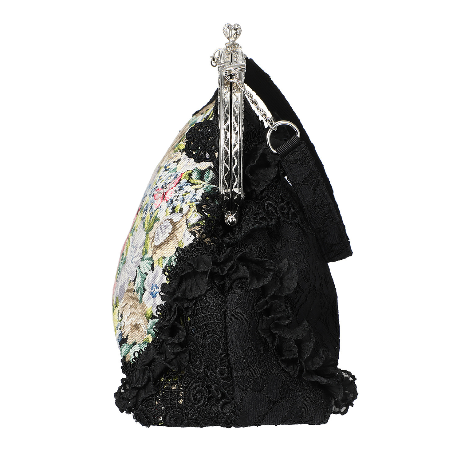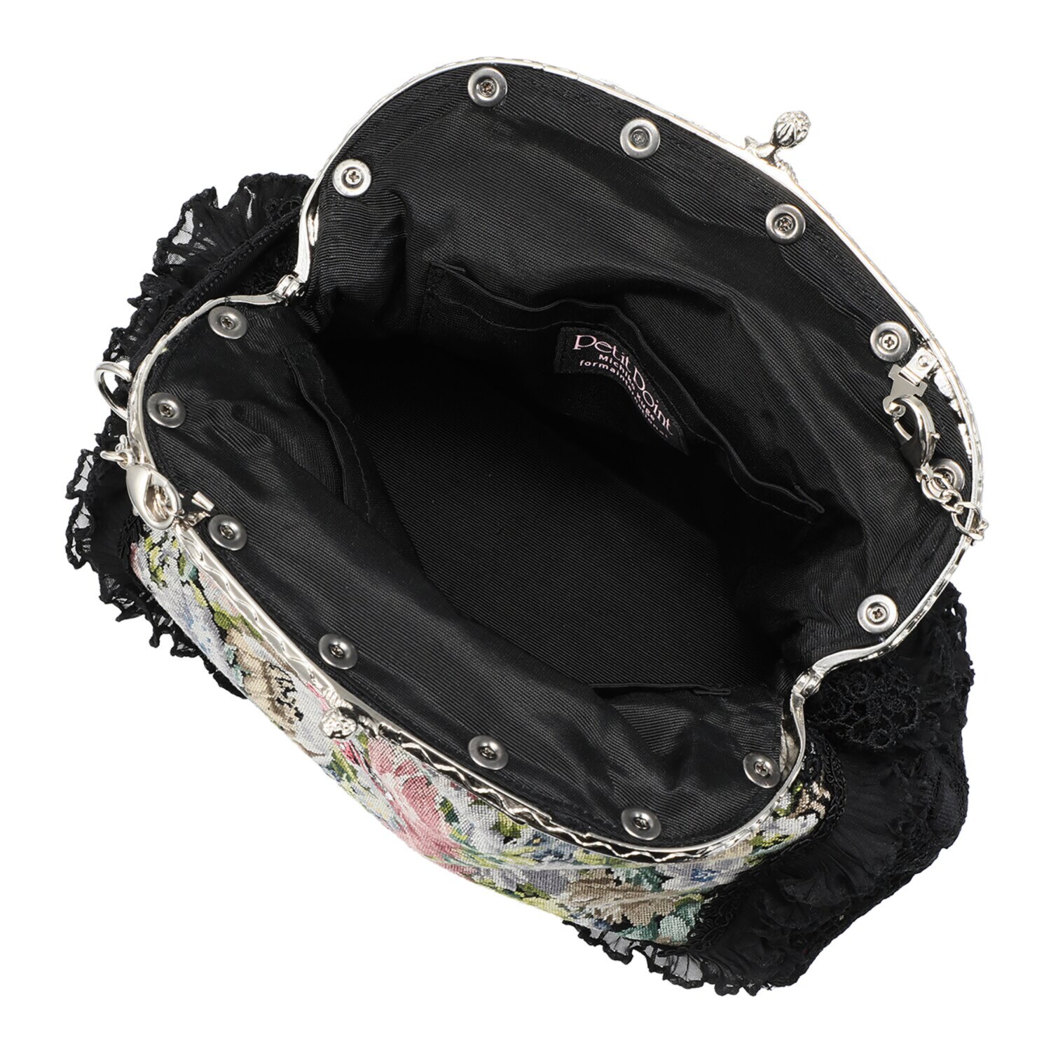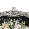 芸術的なプチポアン刺しゅうと、複数のレース&ブレードを巧みに組み合わせた口金バッグです。