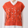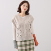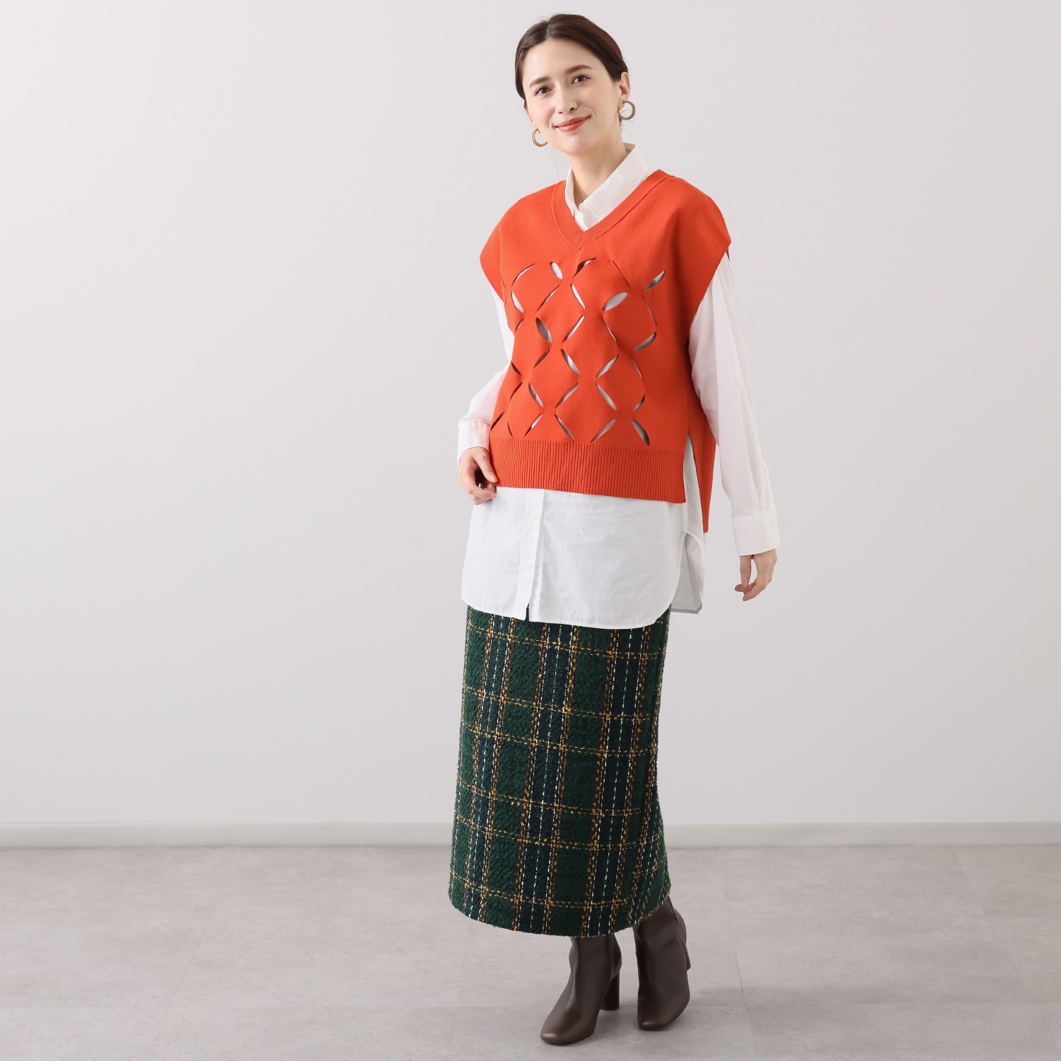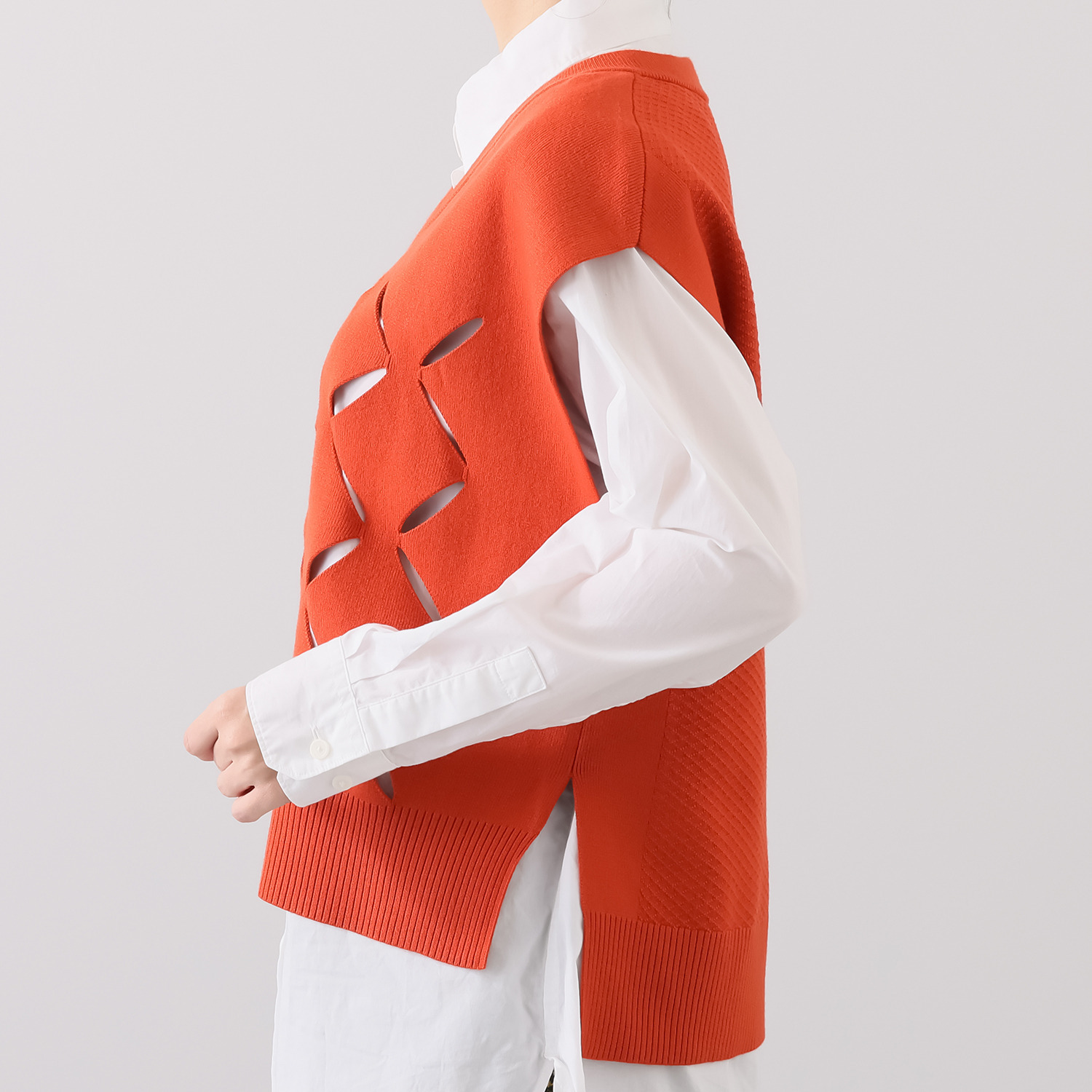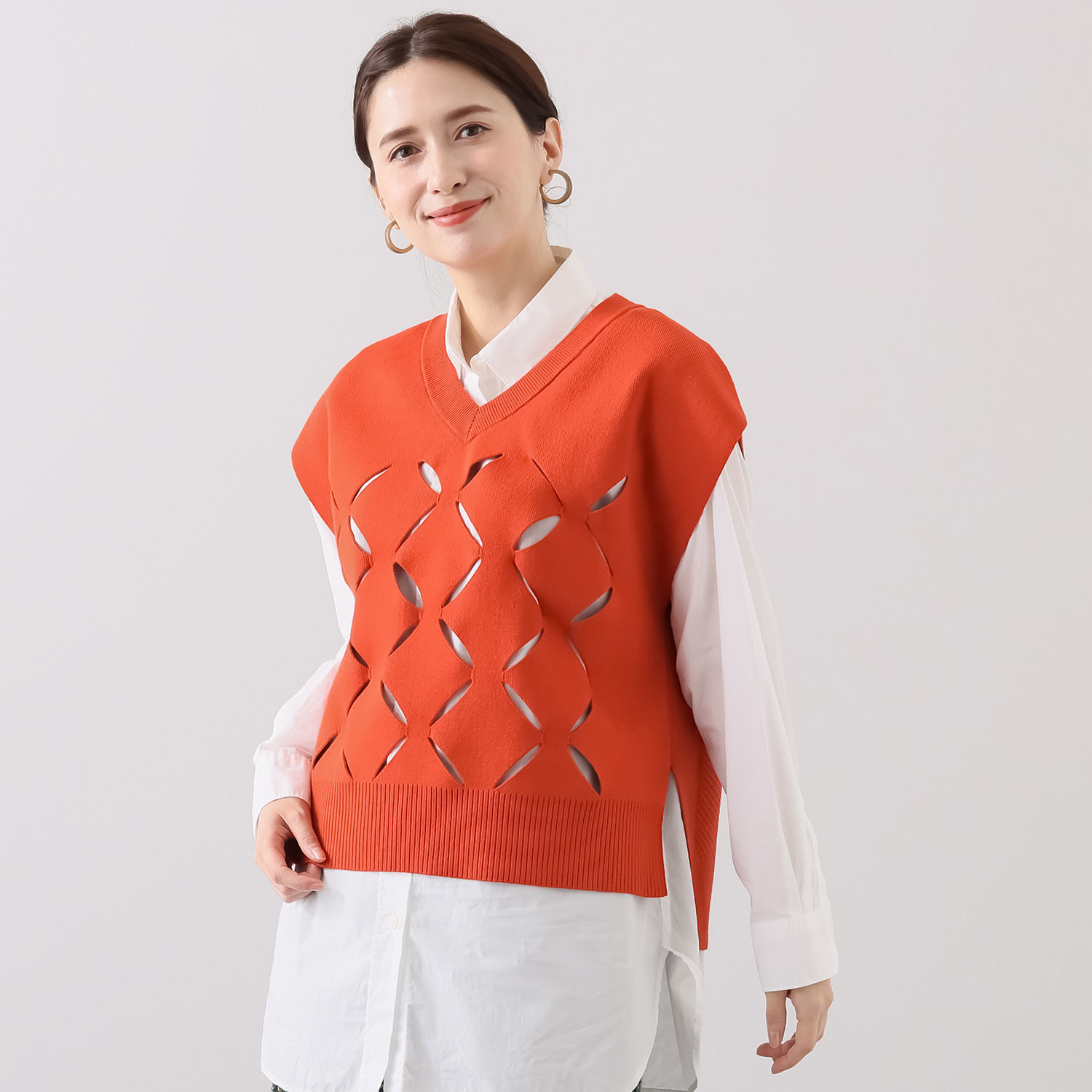 リーフやフラワーモティーフを思わせる穴開きデザインが目を惹くニットベストです。