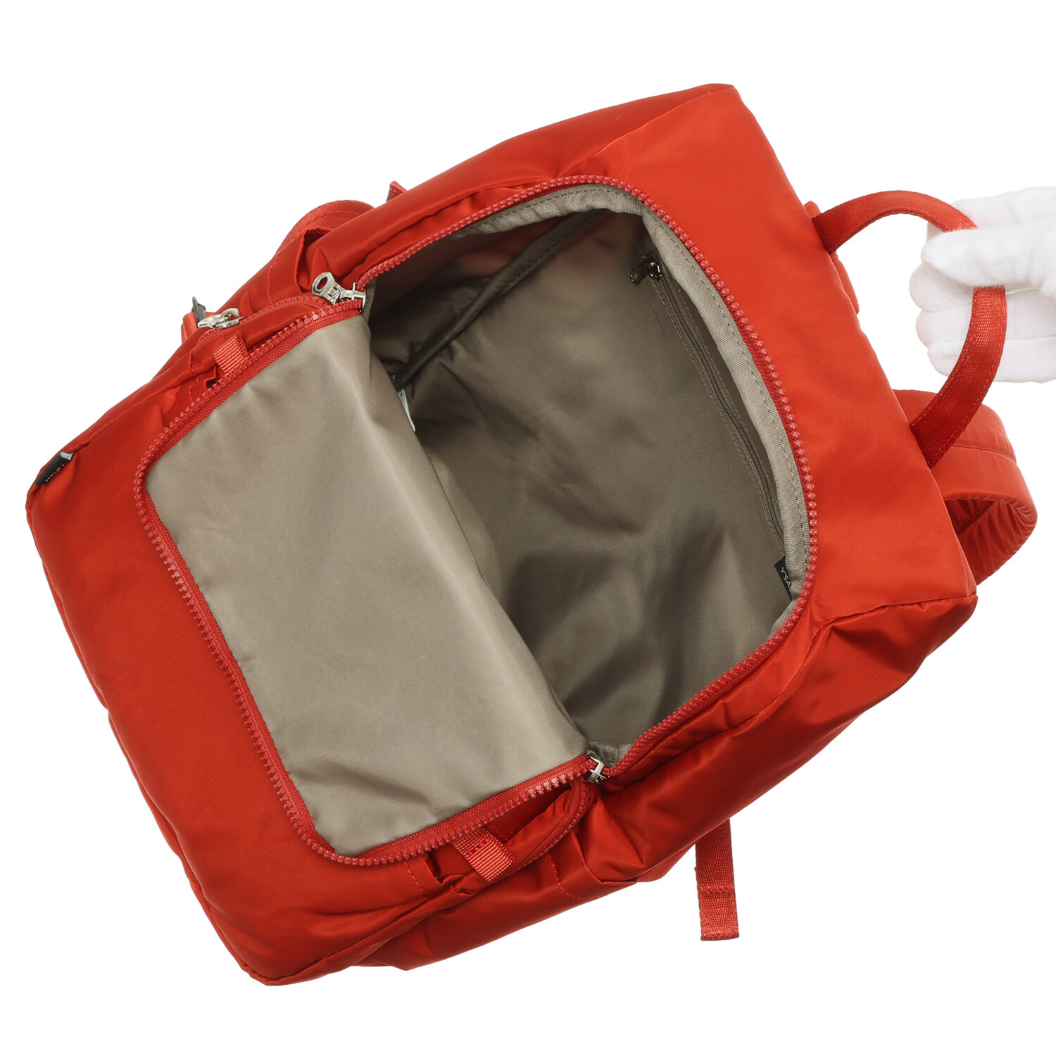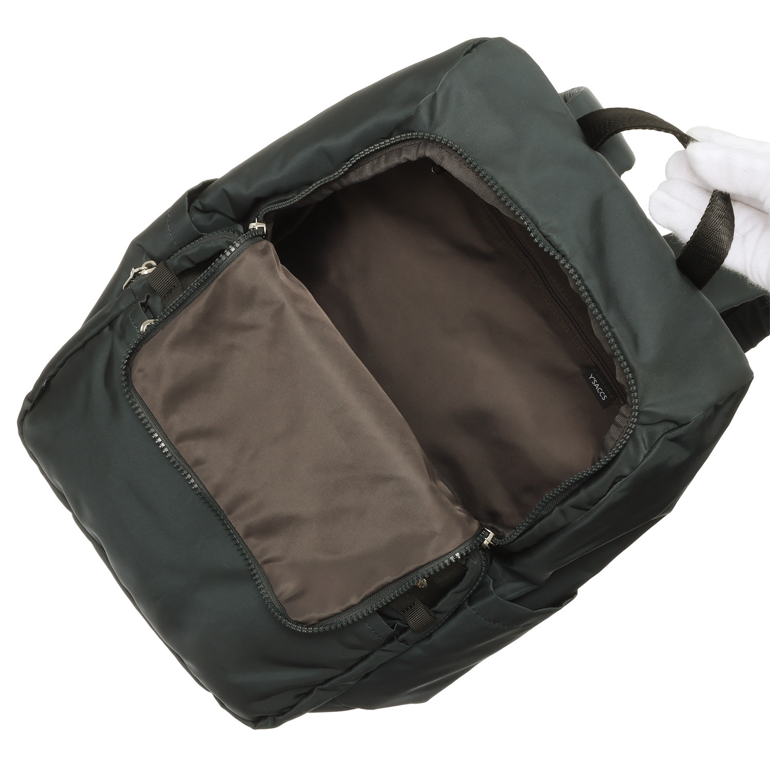 メインファスナーはサイドまで回り込み大きく開く設計で、荷物の出し入れがしやすいつくり。