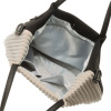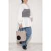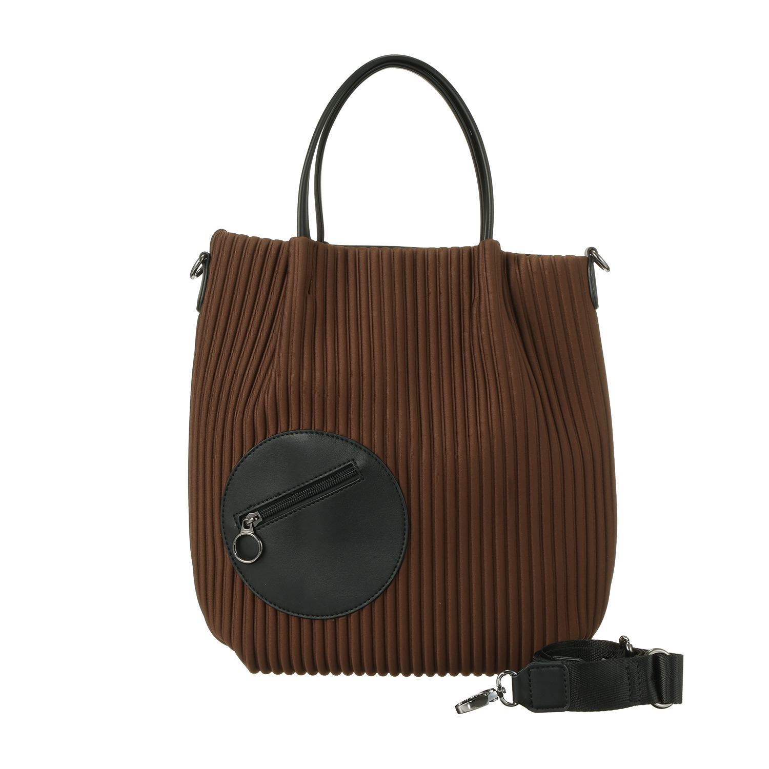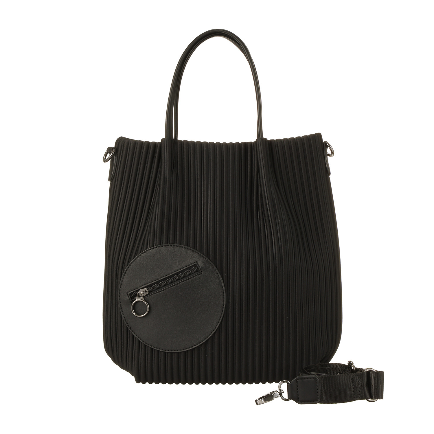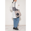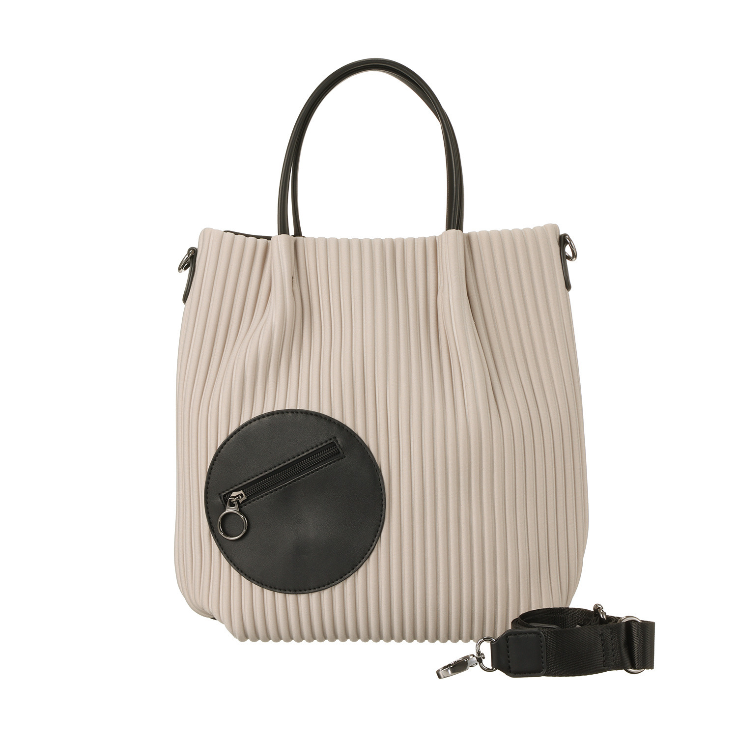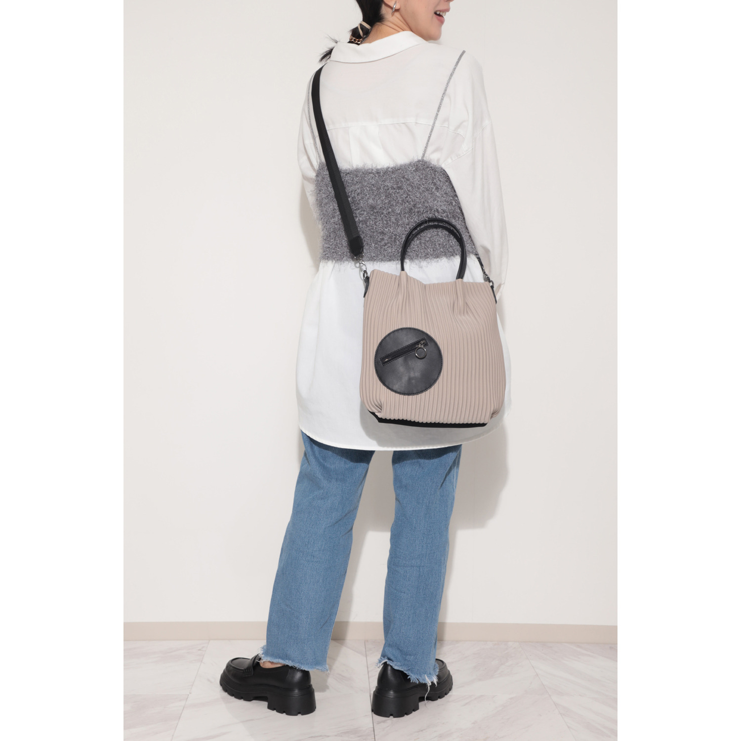 取り外し可能なストラップ付き。ストライプエンボスの上に丸いポケットを配し、かわいらしいアクセントに。