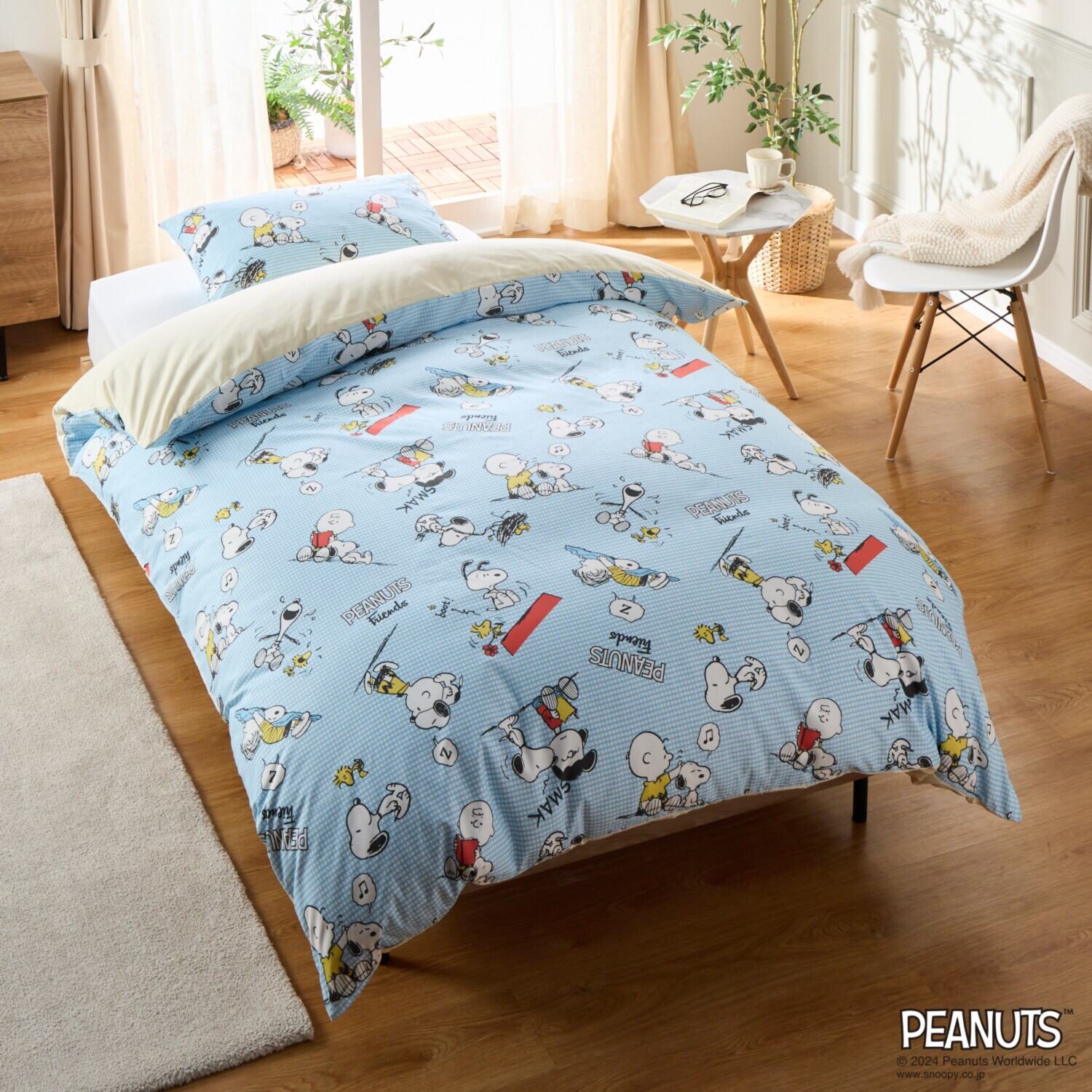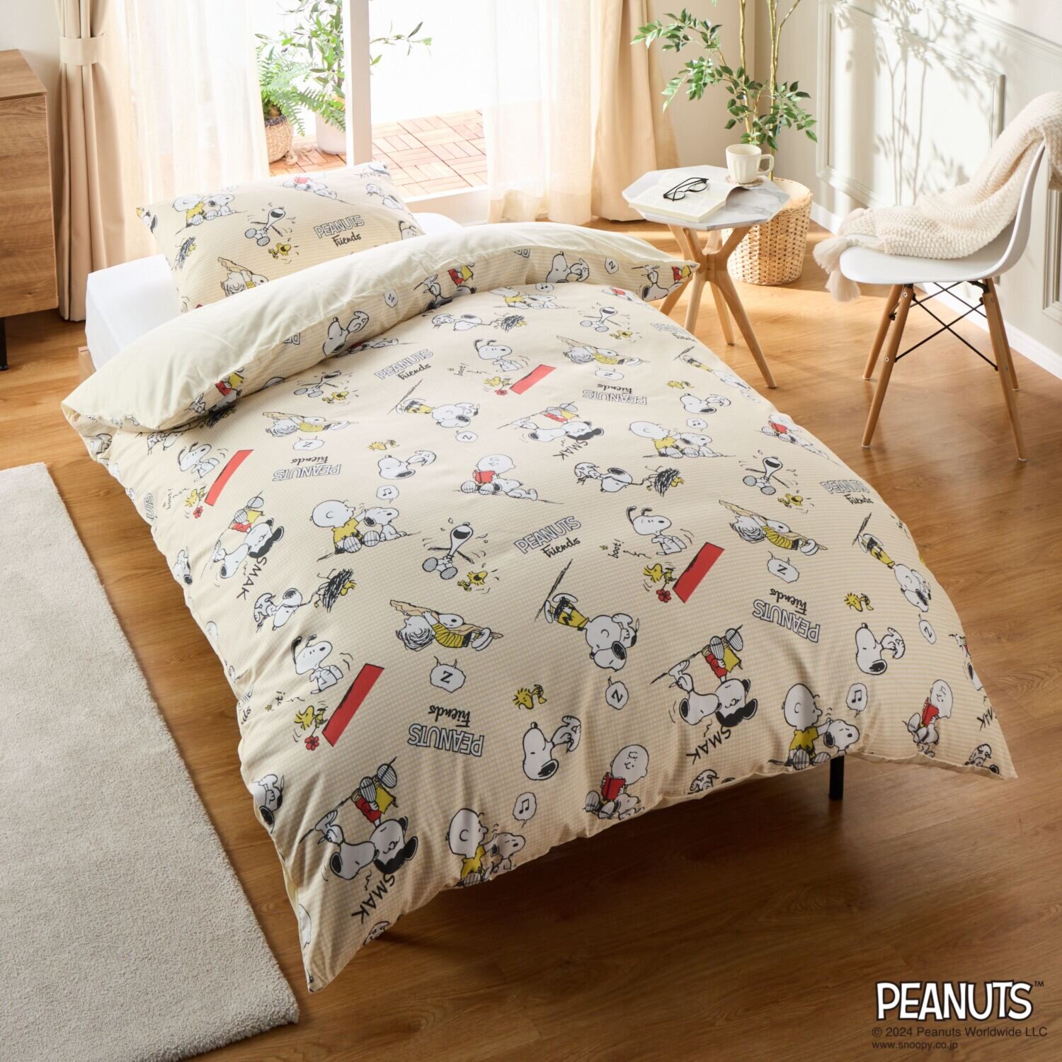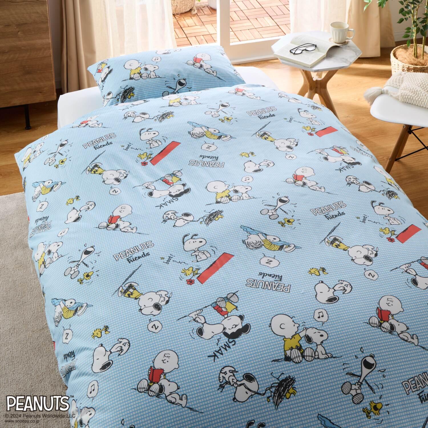 ピーナッツに登場する個性豊かで魅力的な仲間たちのデザインが楽し気な雰囲気の、掛けふとんカバーとピローケースです。