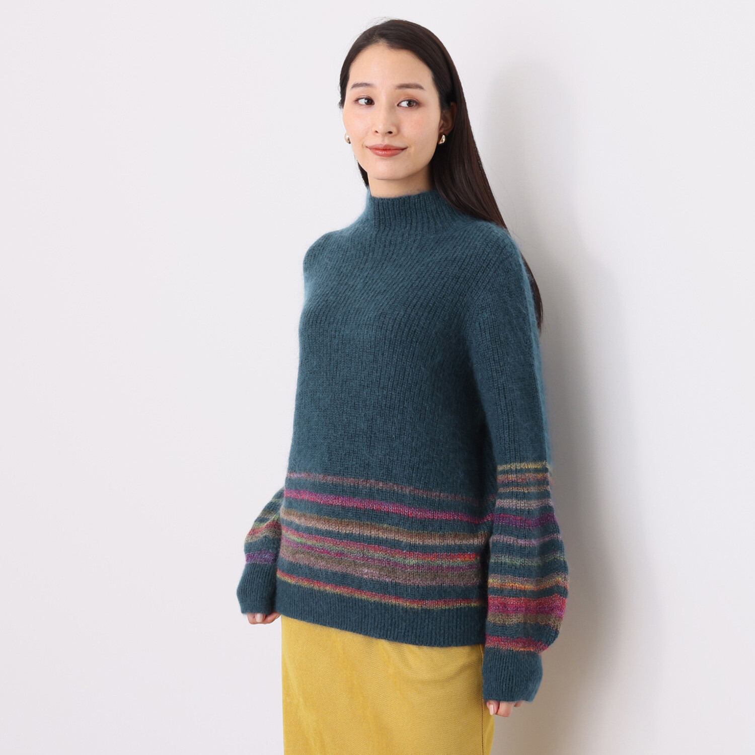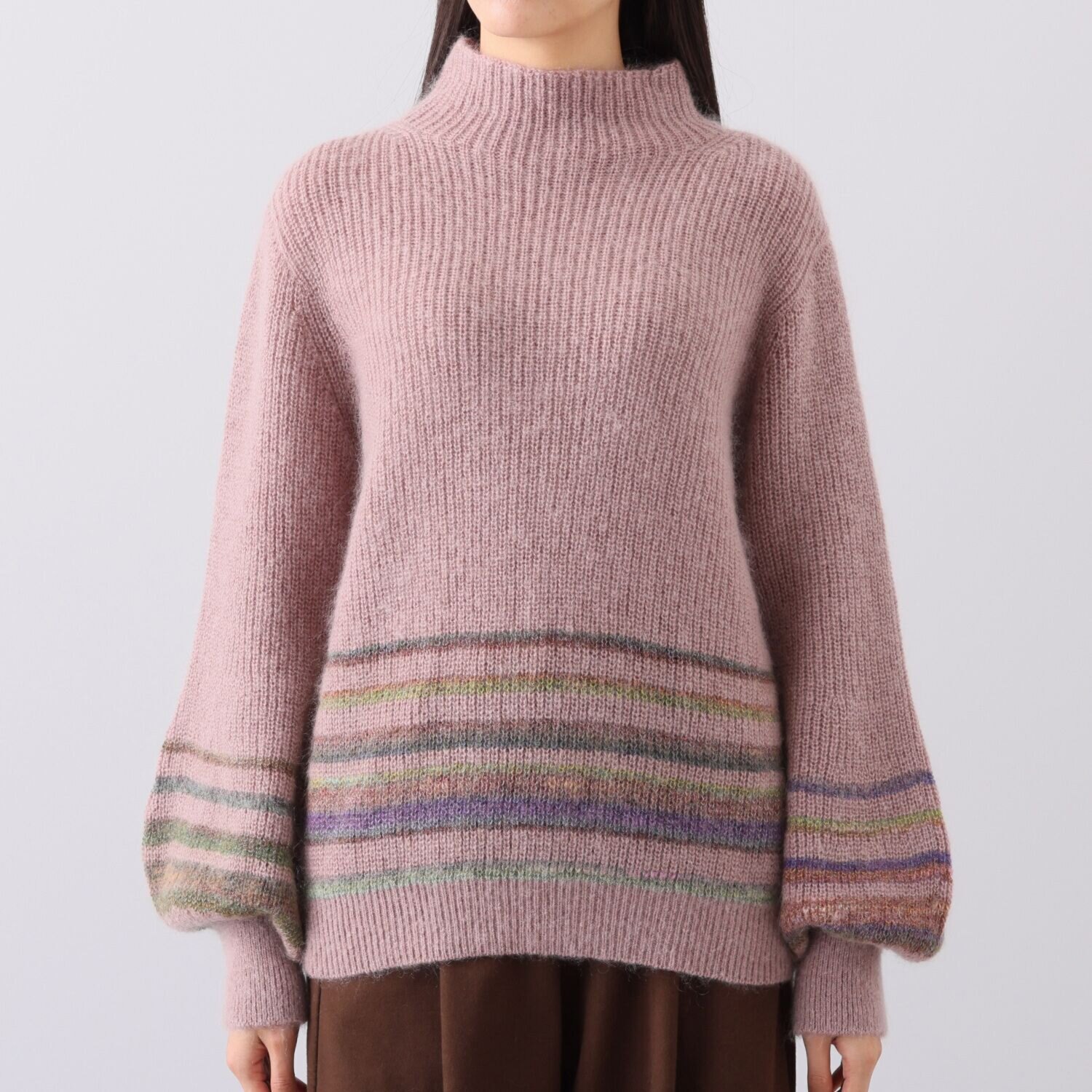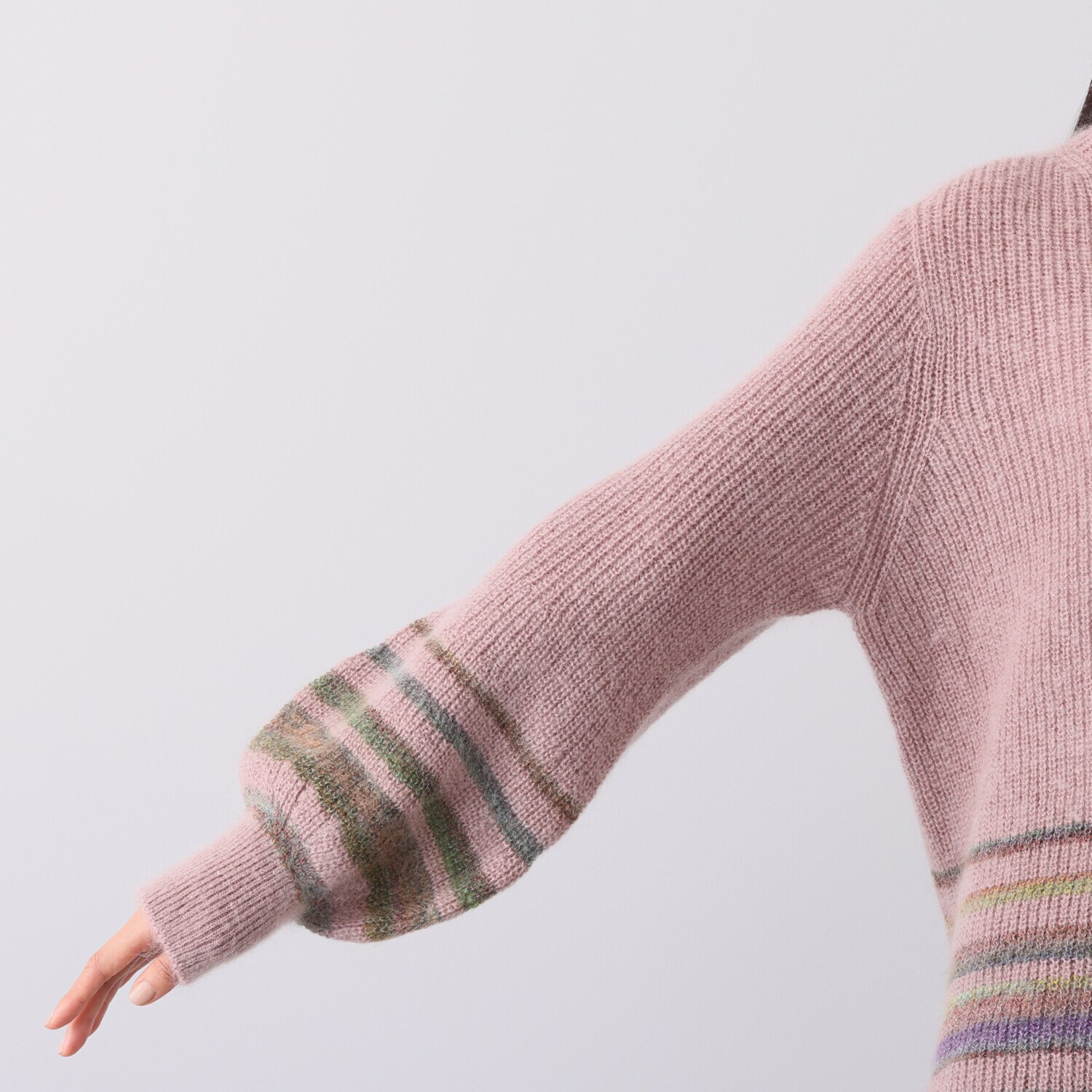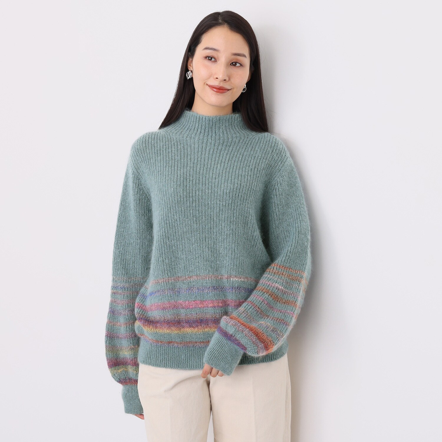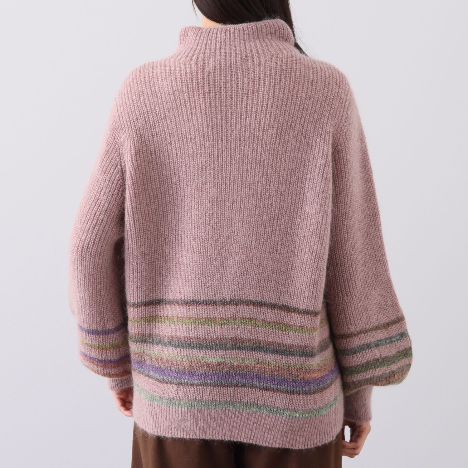 ポイントのボーダー部分には、モヘヤスラブグラデーション糸と、メリノウールの細番手のグラデーション糸を組み合わせ、テキスタイルの完成度にこだわりました。