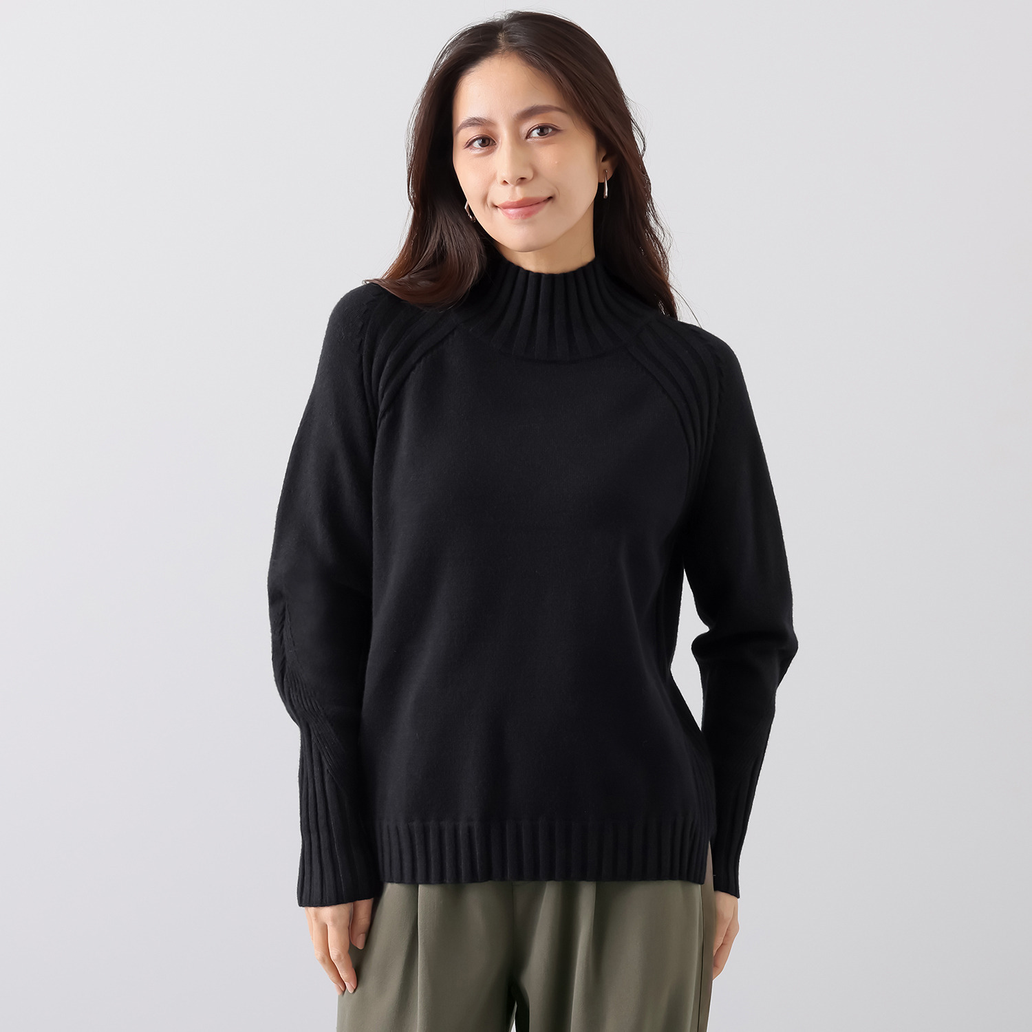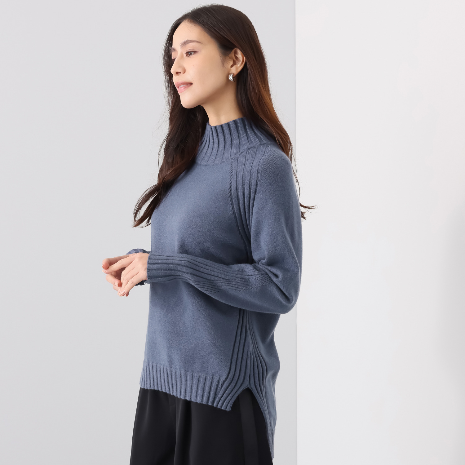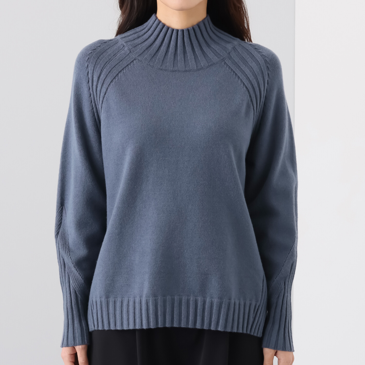 袖付け部分や脇部分にはワイドリブを部分的に切り替え、プレーンなニットとは差別化を図りました。