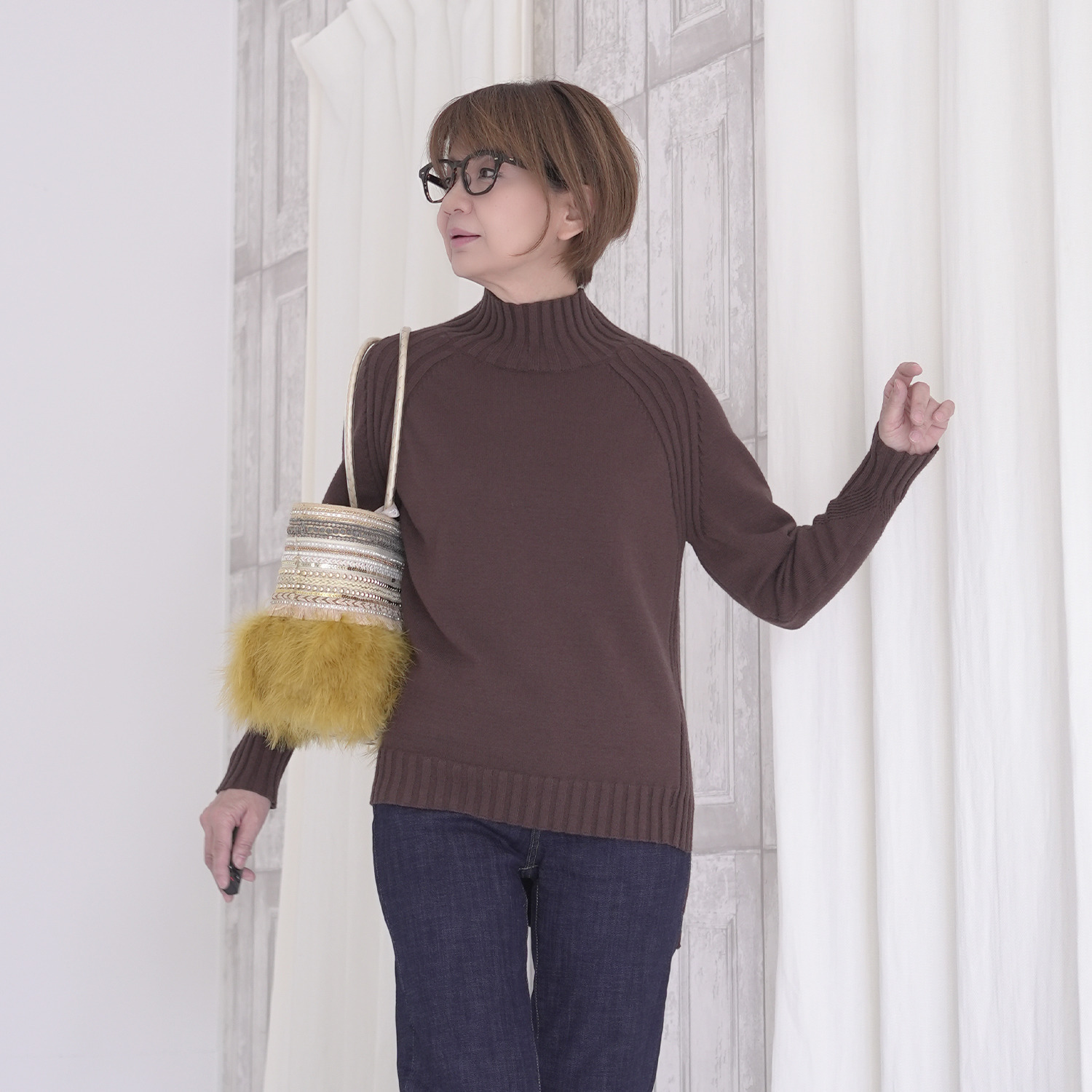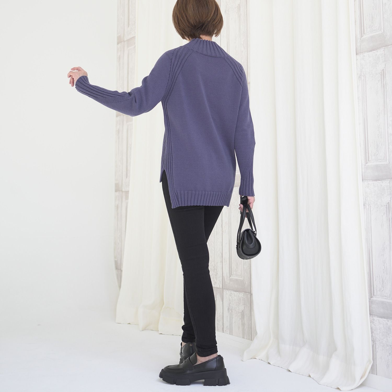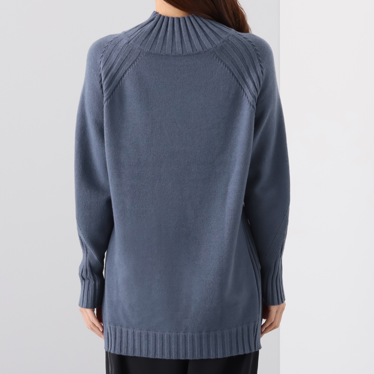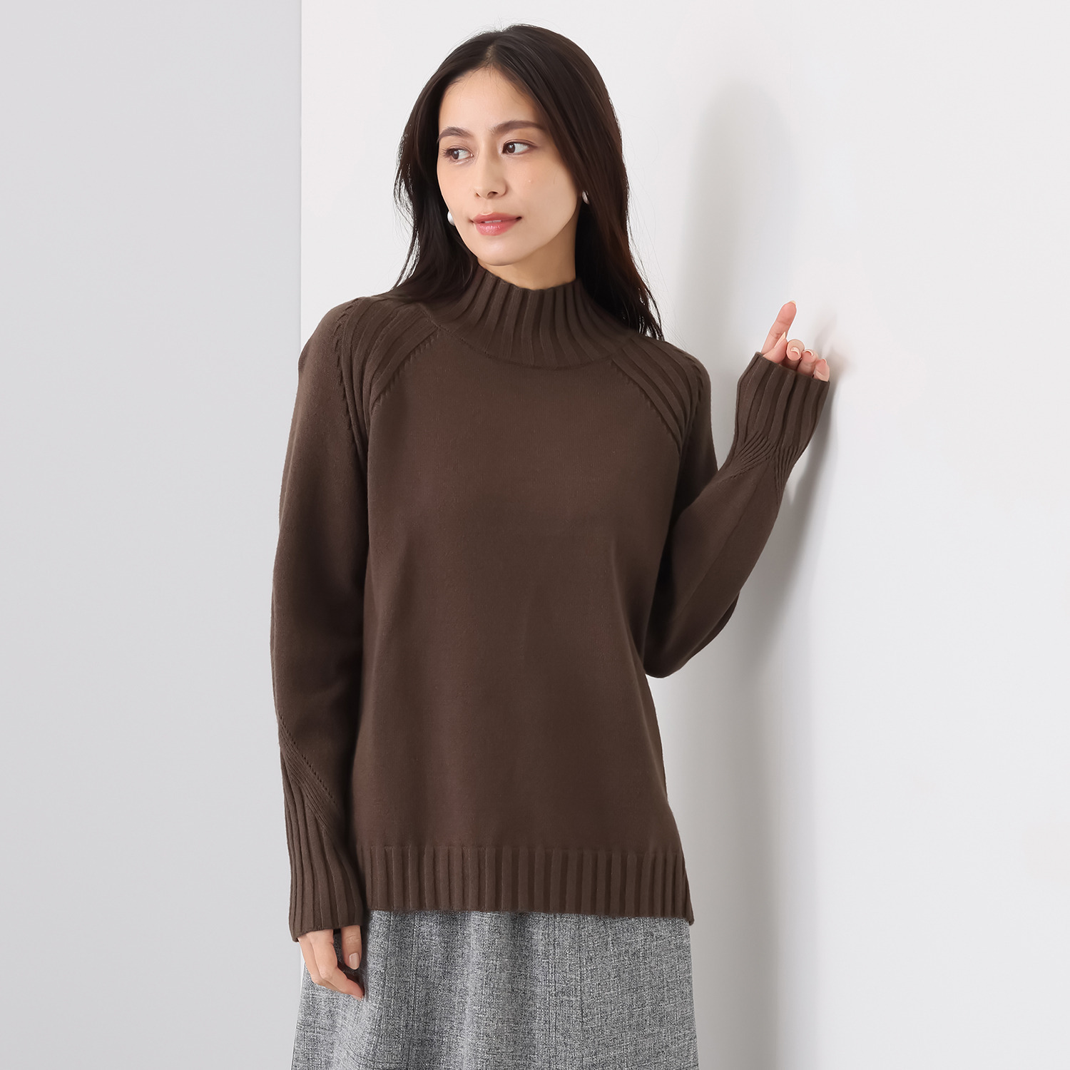 袖付け部分や脇部分にはワイドリブを部分的に切り替え、プレーンなニットとは差別化を図りました。