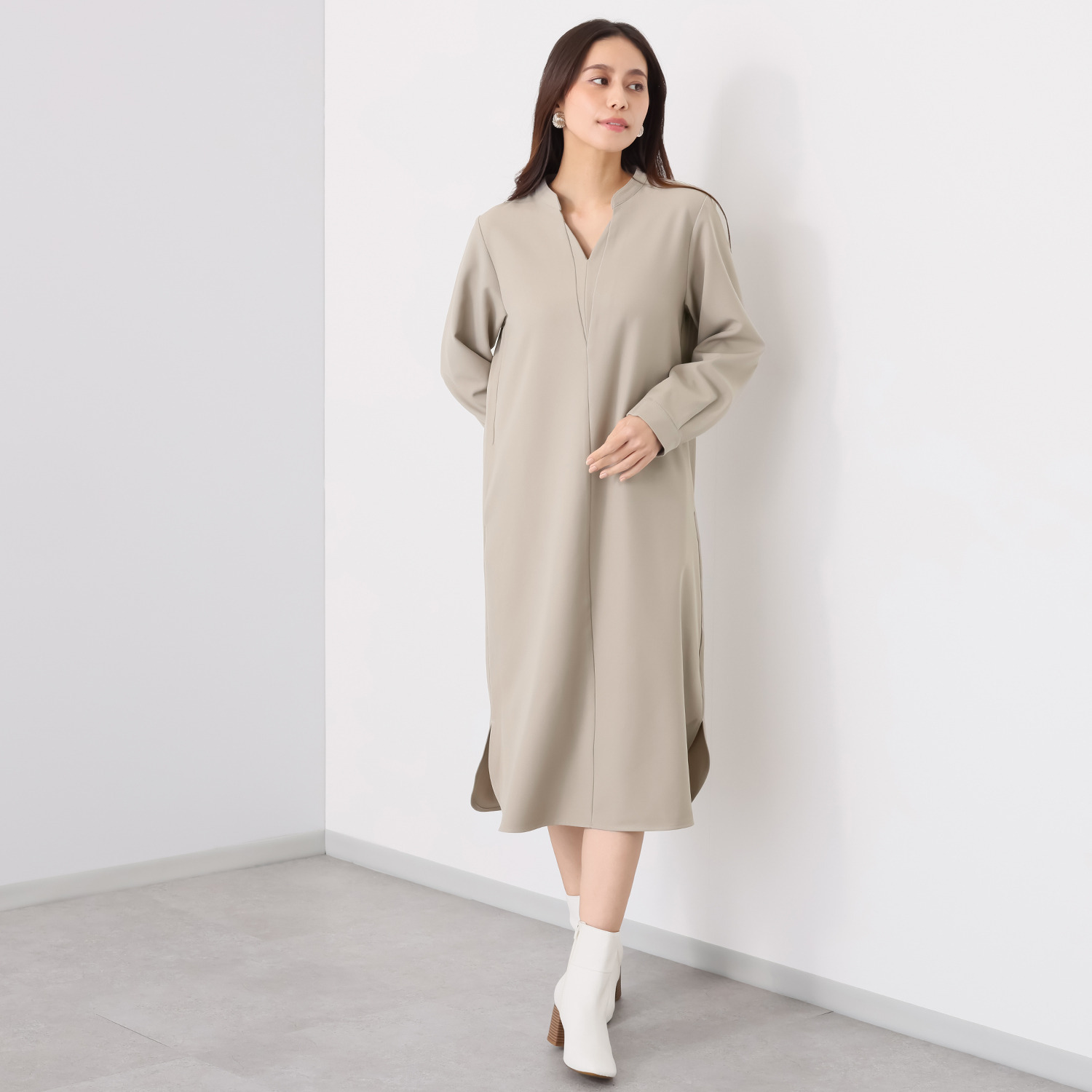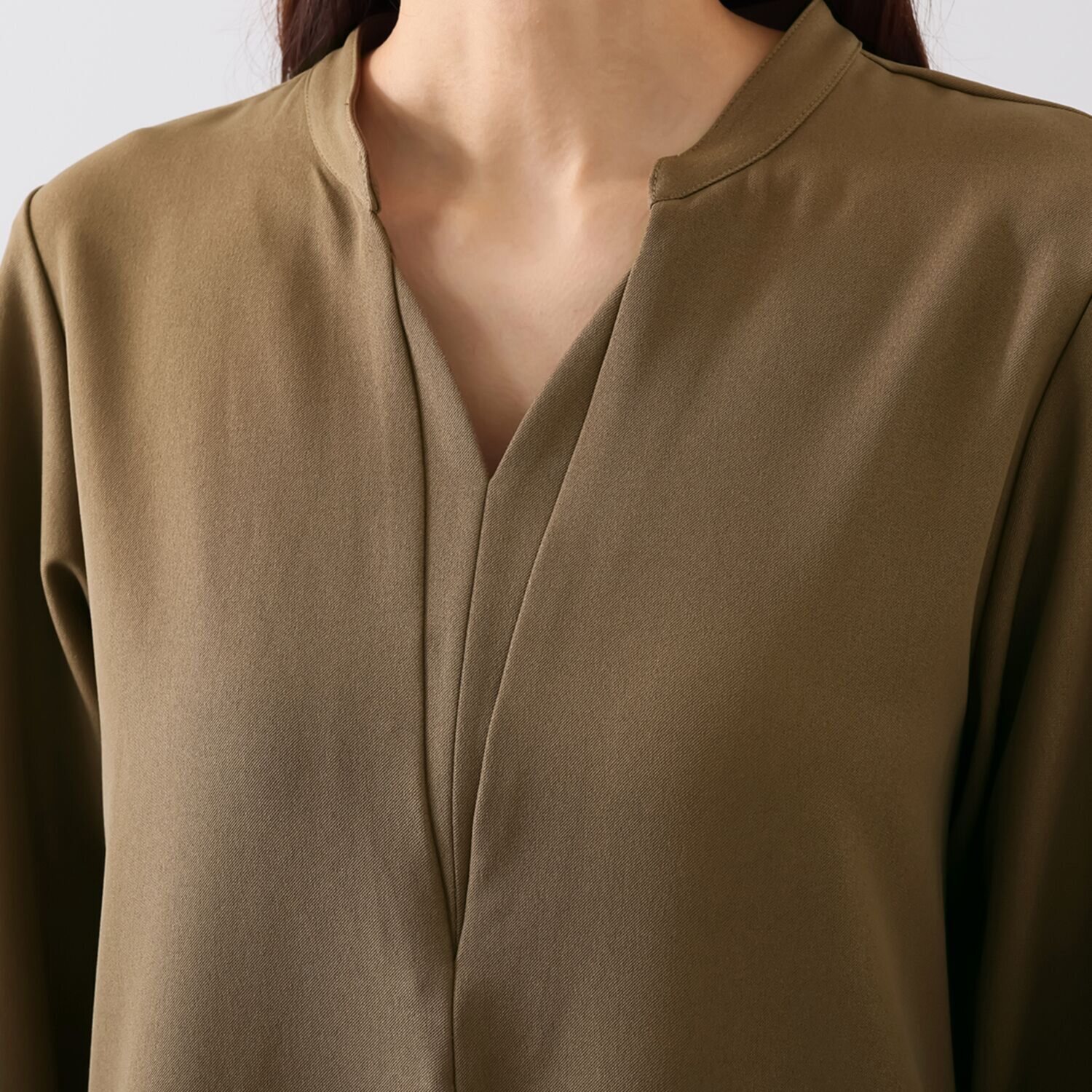 変形キーネック風に胸元を開けたスキッパーデザインが、お顔周りをすっきりと演出。