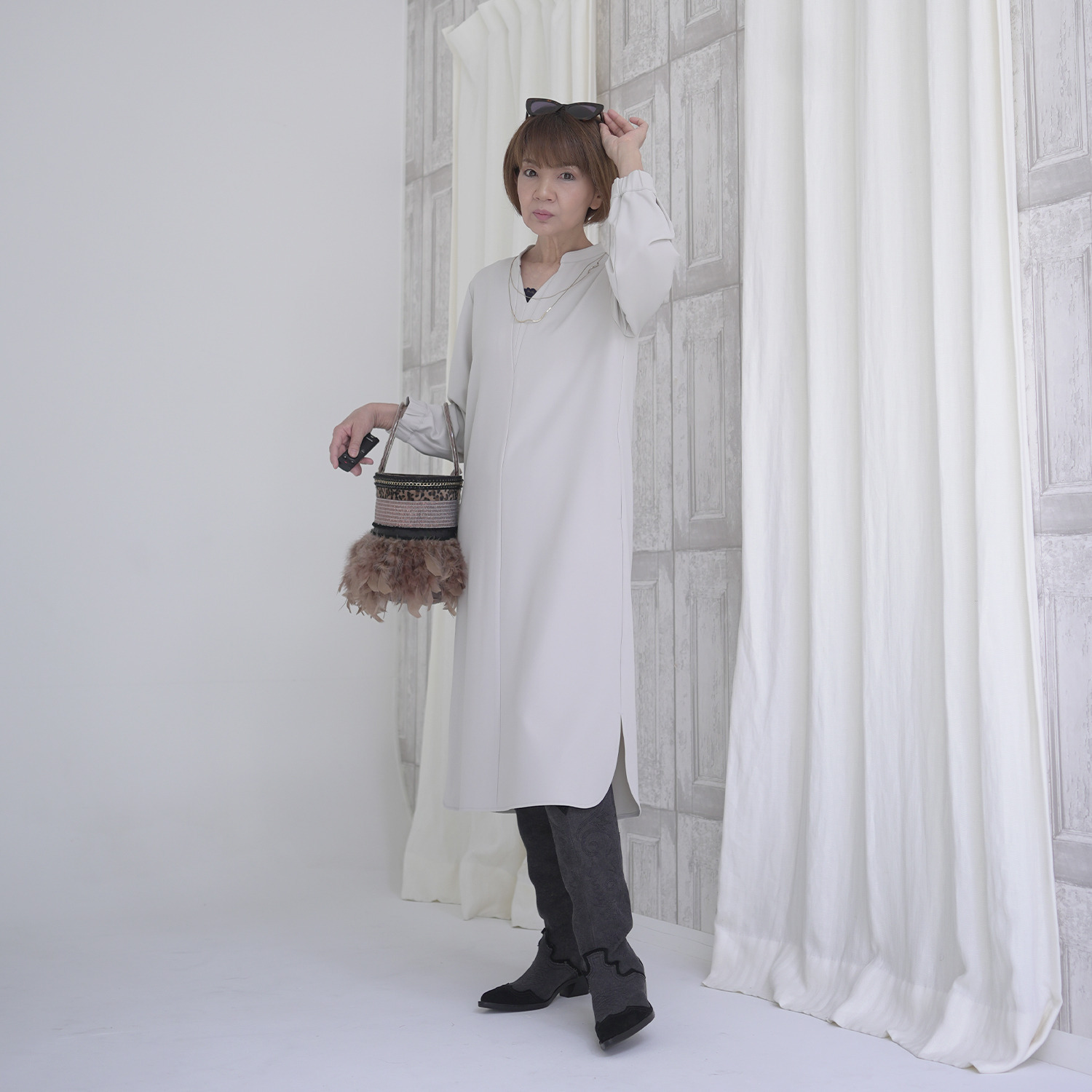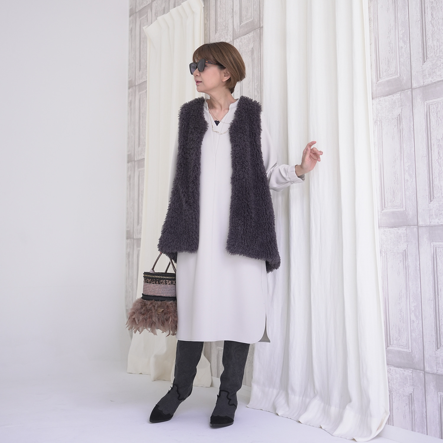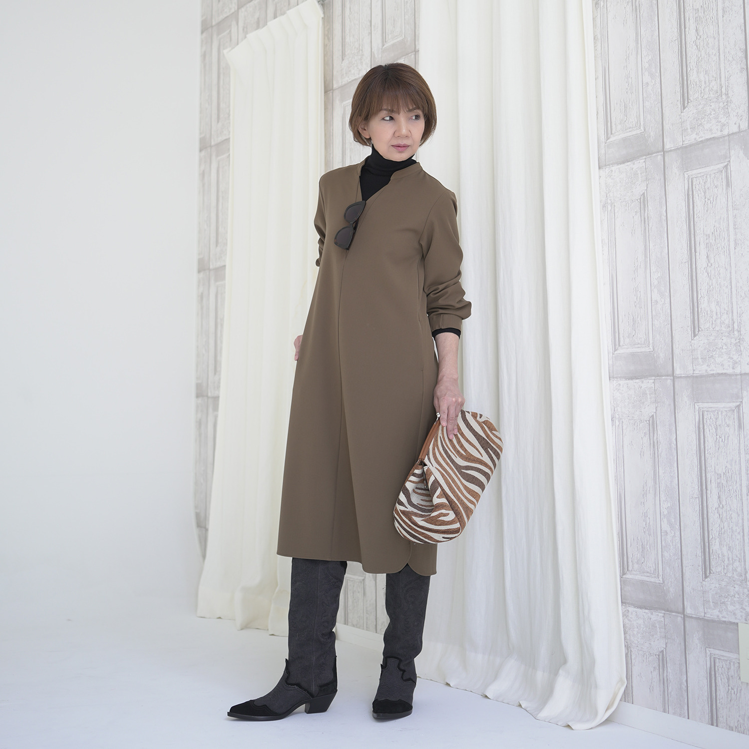 インナーをタートルやレイシーなものやスカーフなどいろいろVネックなので楽しめそうで、スニーカーやブーツなど