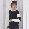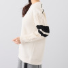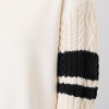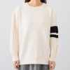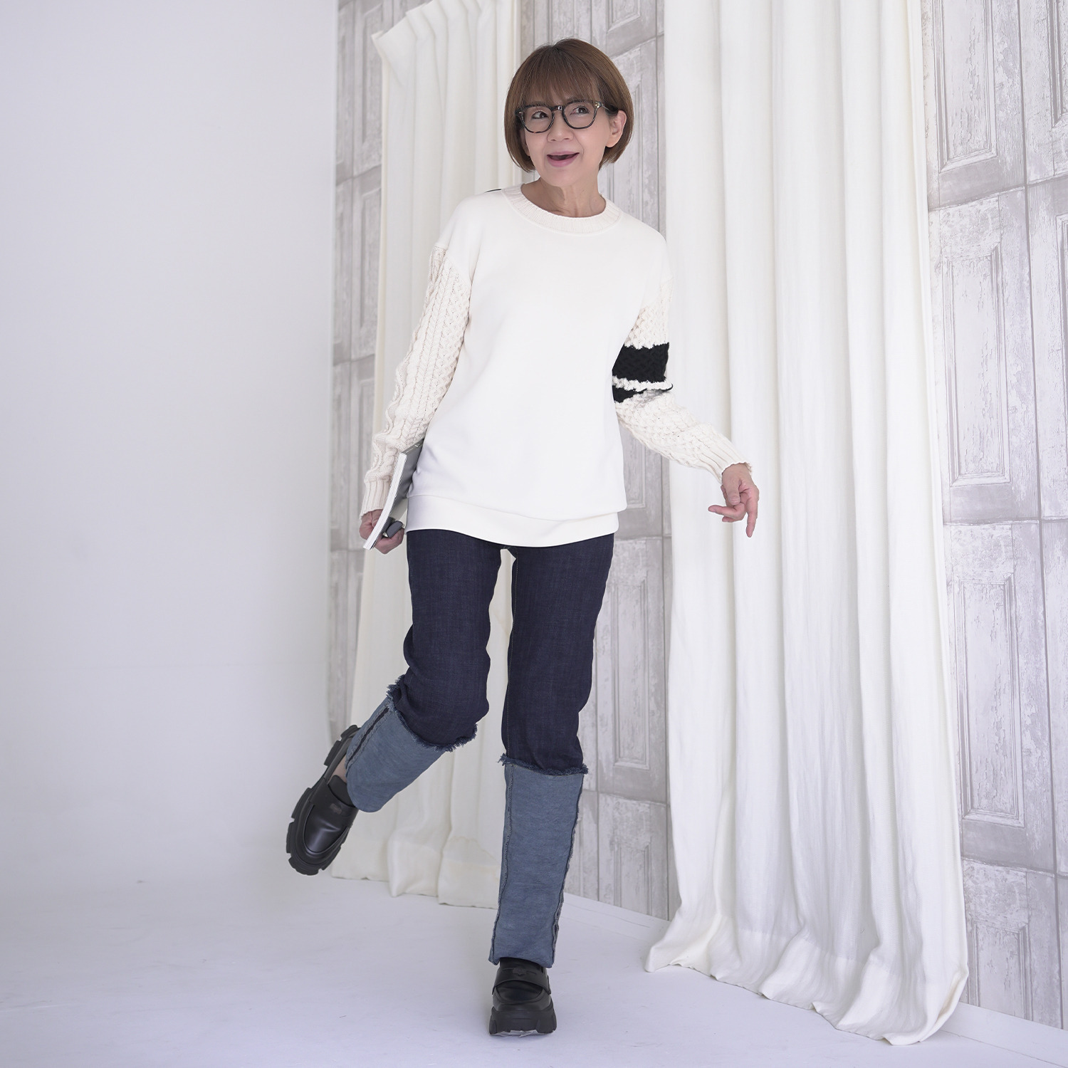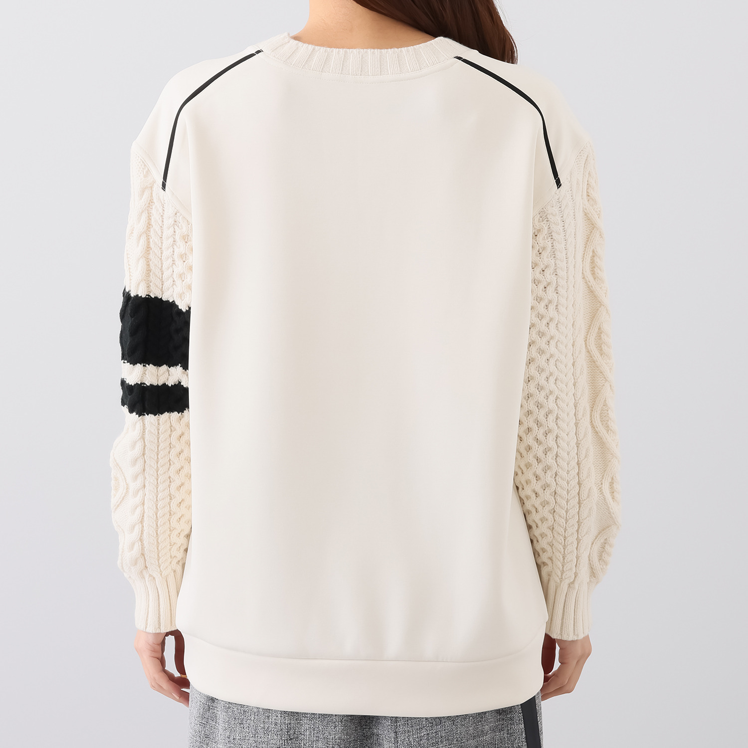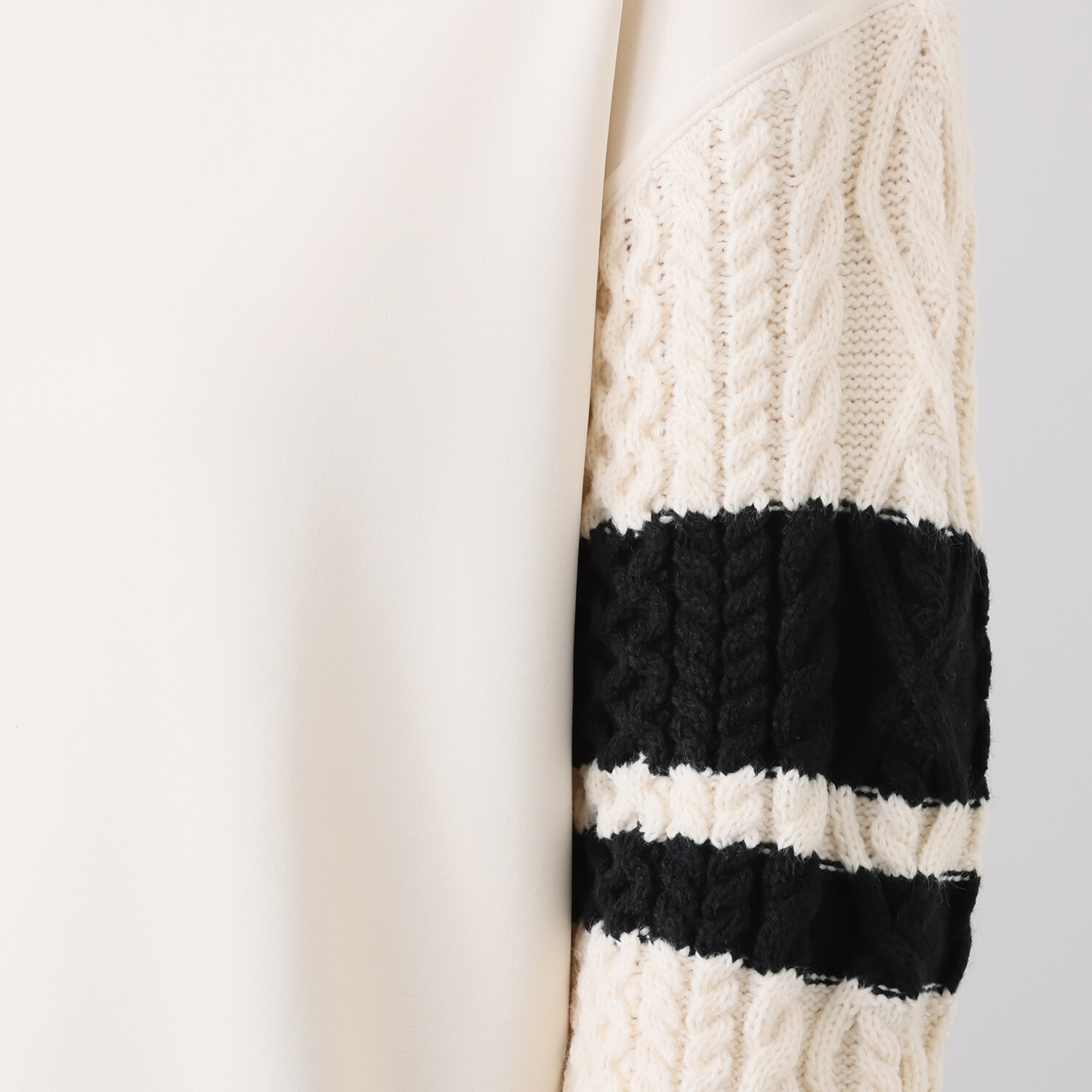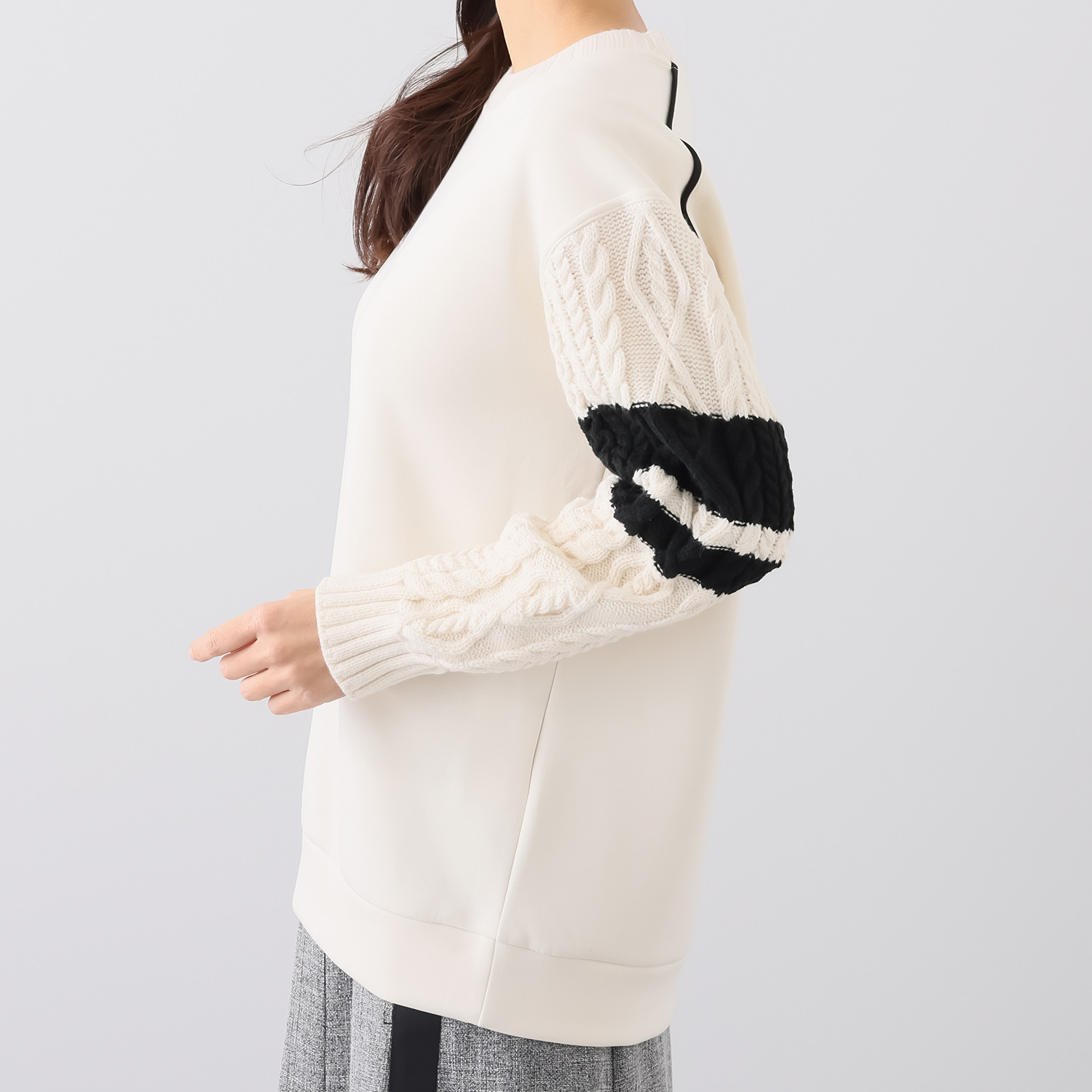 袖は、4種類の異なるケーブル柄を組み合わせた、独特な表情が目を惹くこだわりのニットを切り替えたデザイン。