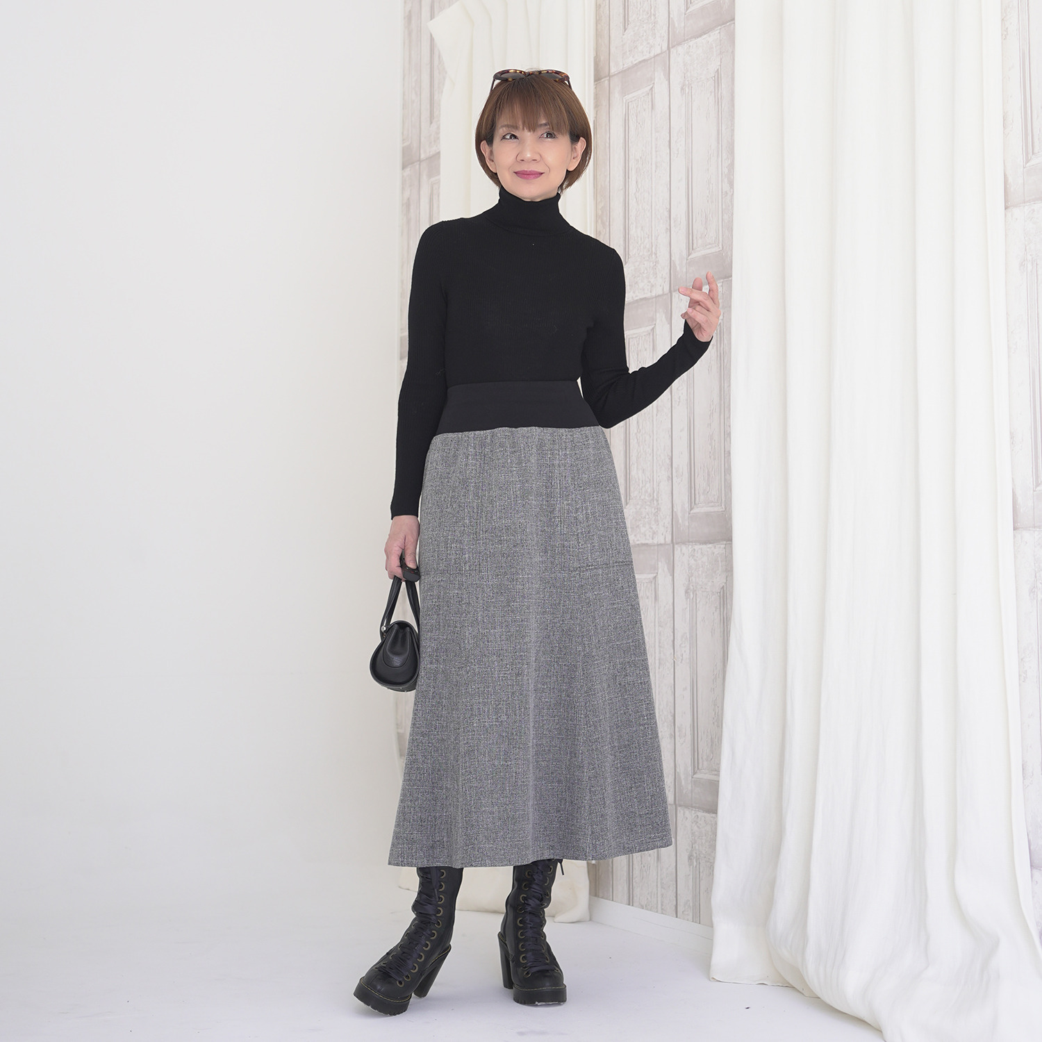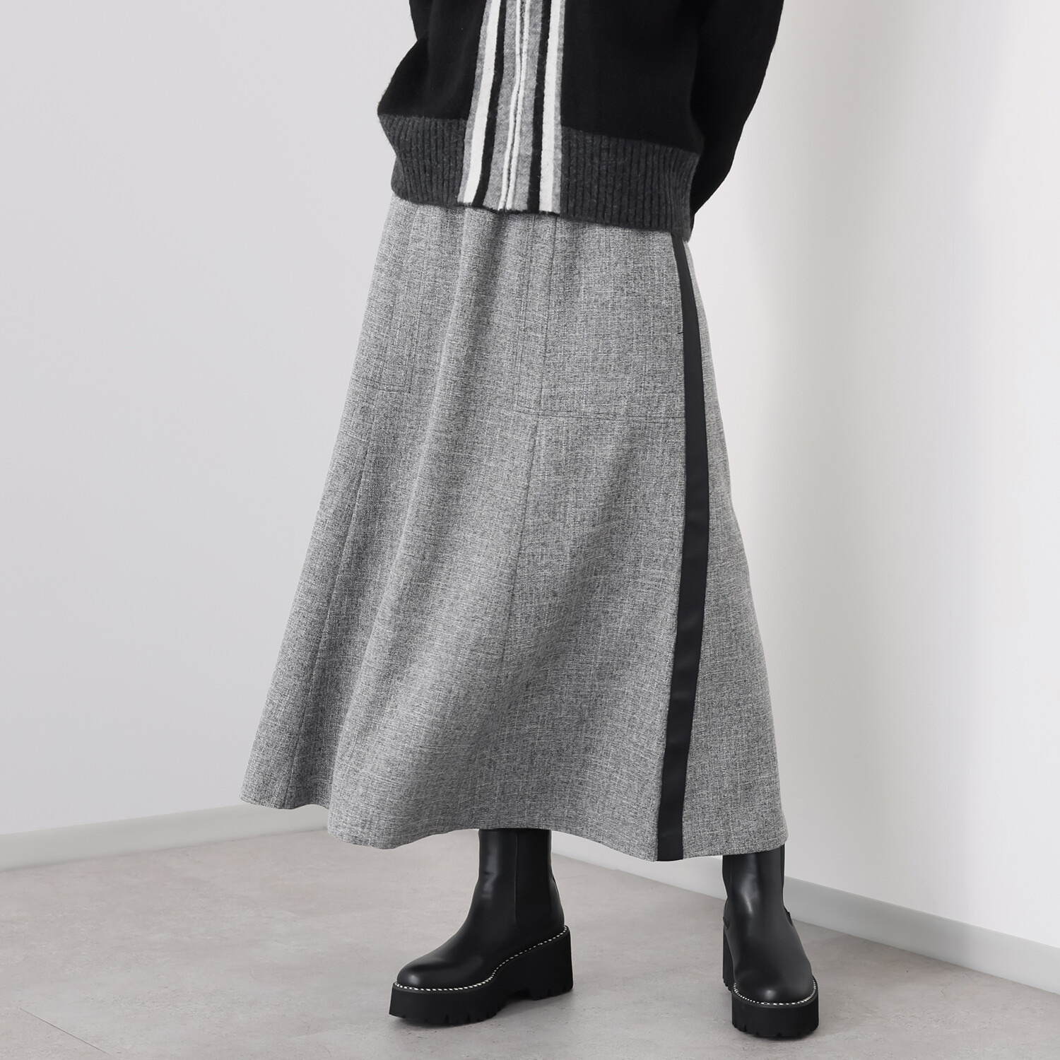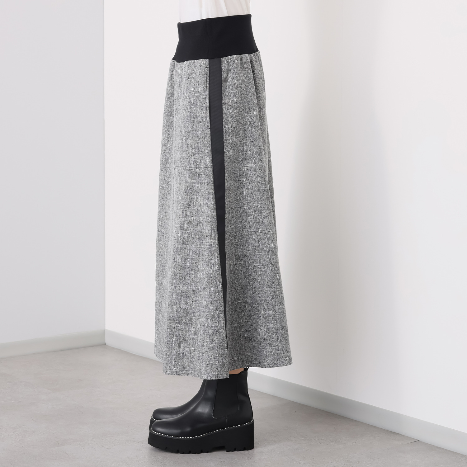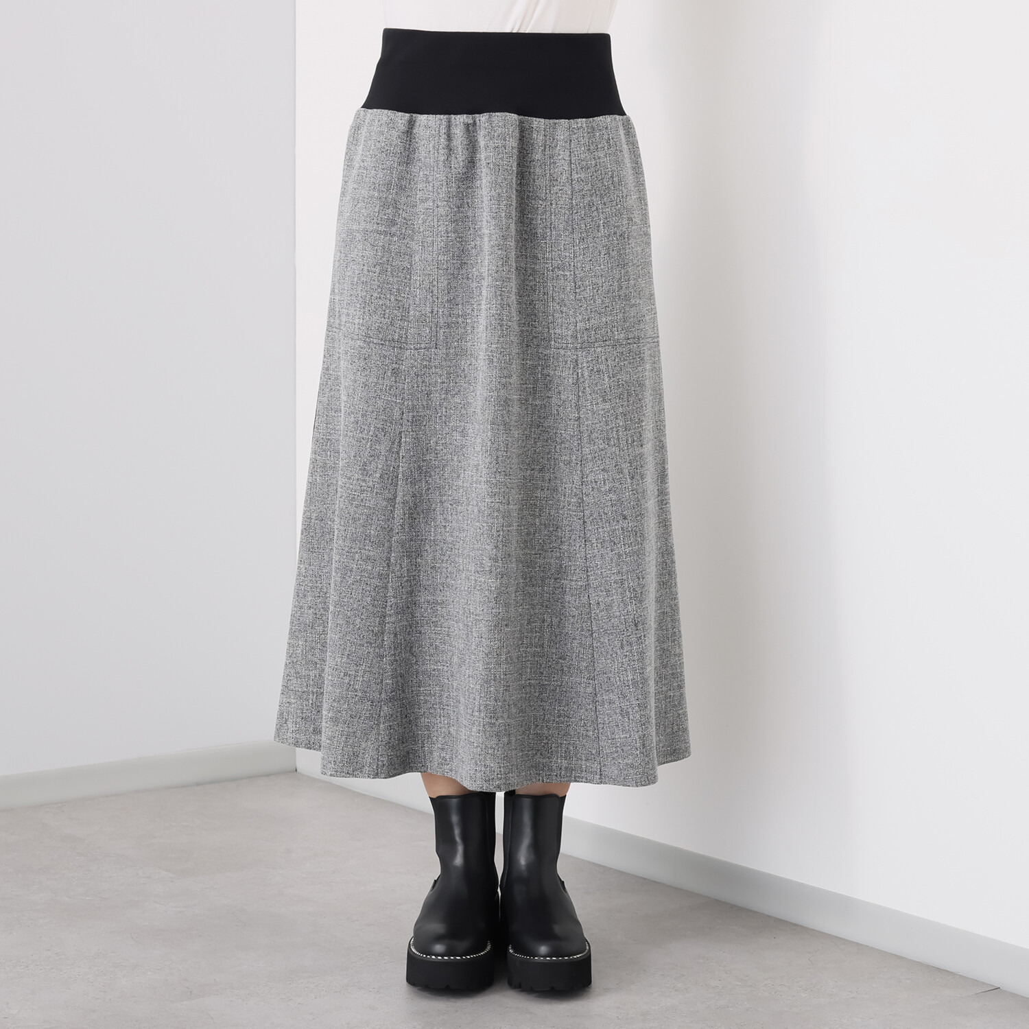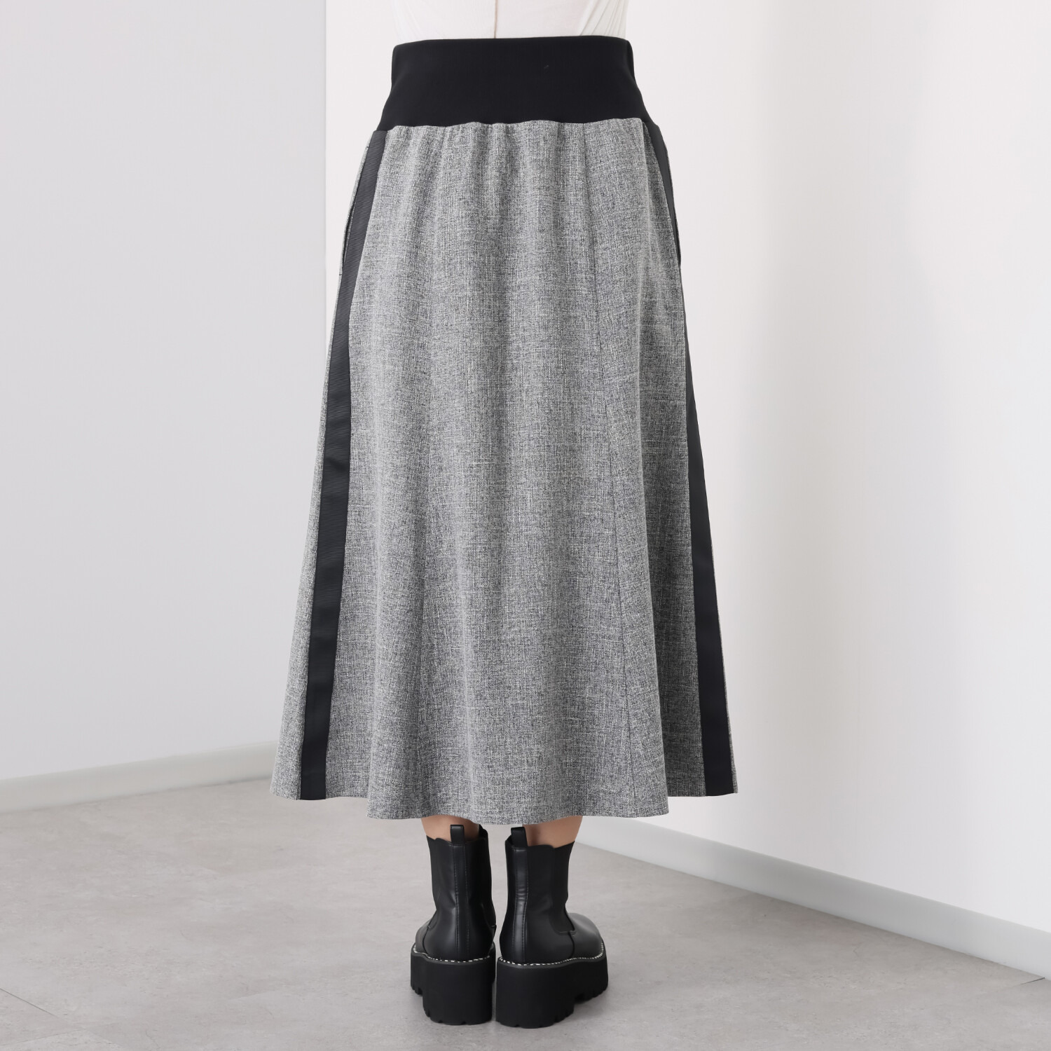 6枚接ぎで蹴回しをたっぷりと取った美しいセミフレアーシルエットが、歩く度に優雅に揺れ動きます。