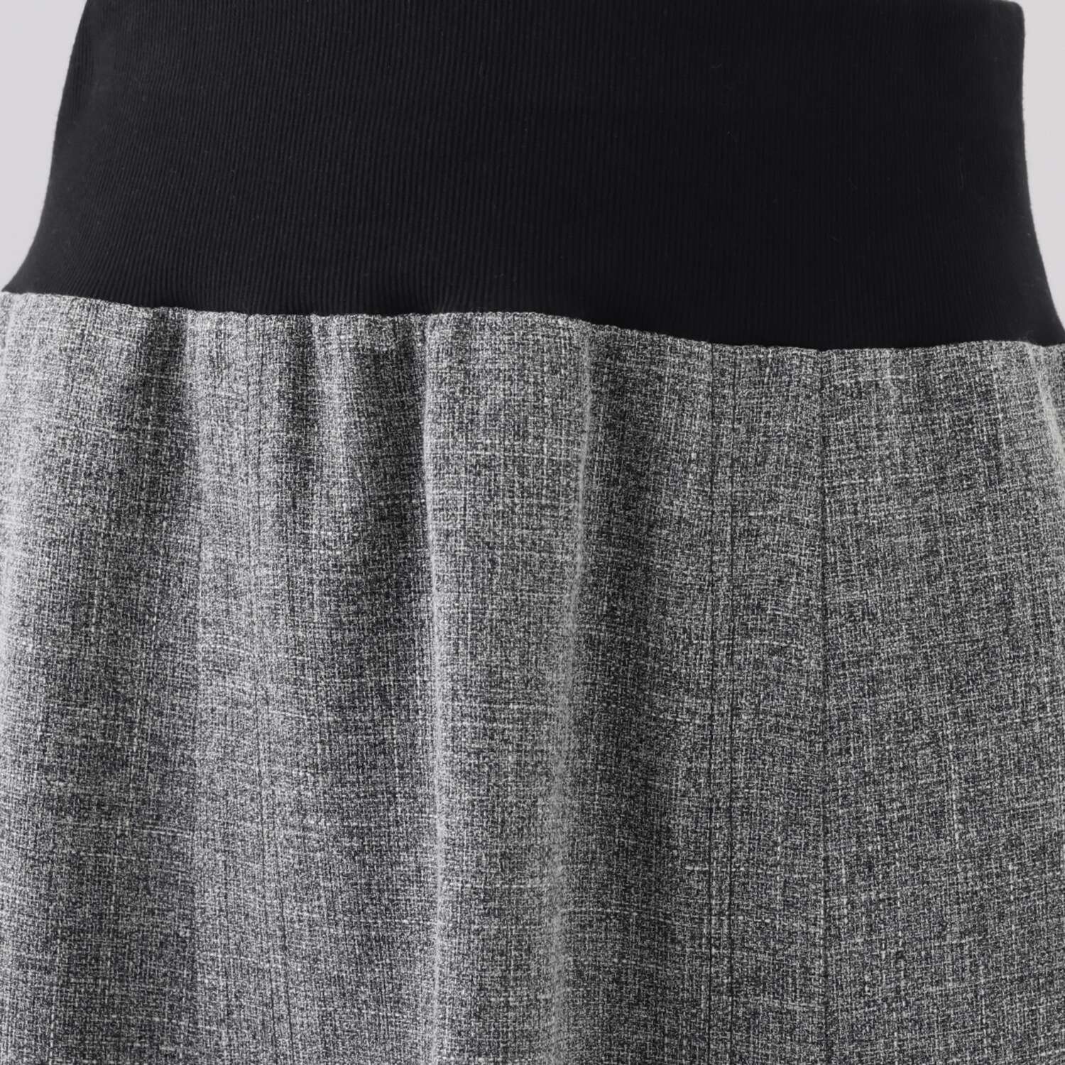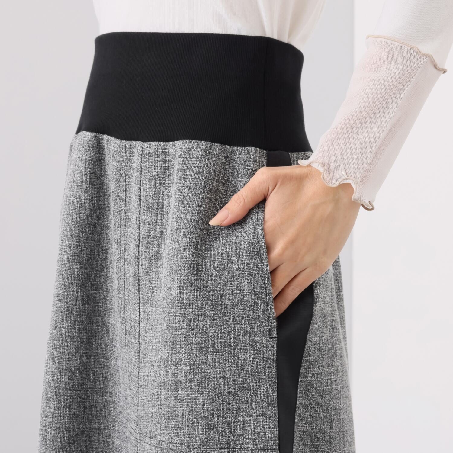 適度なハリ感がありながら美しいドレープがあり、上品な落ち感を演出するツイード調に織り上げた先染め生地を使用。