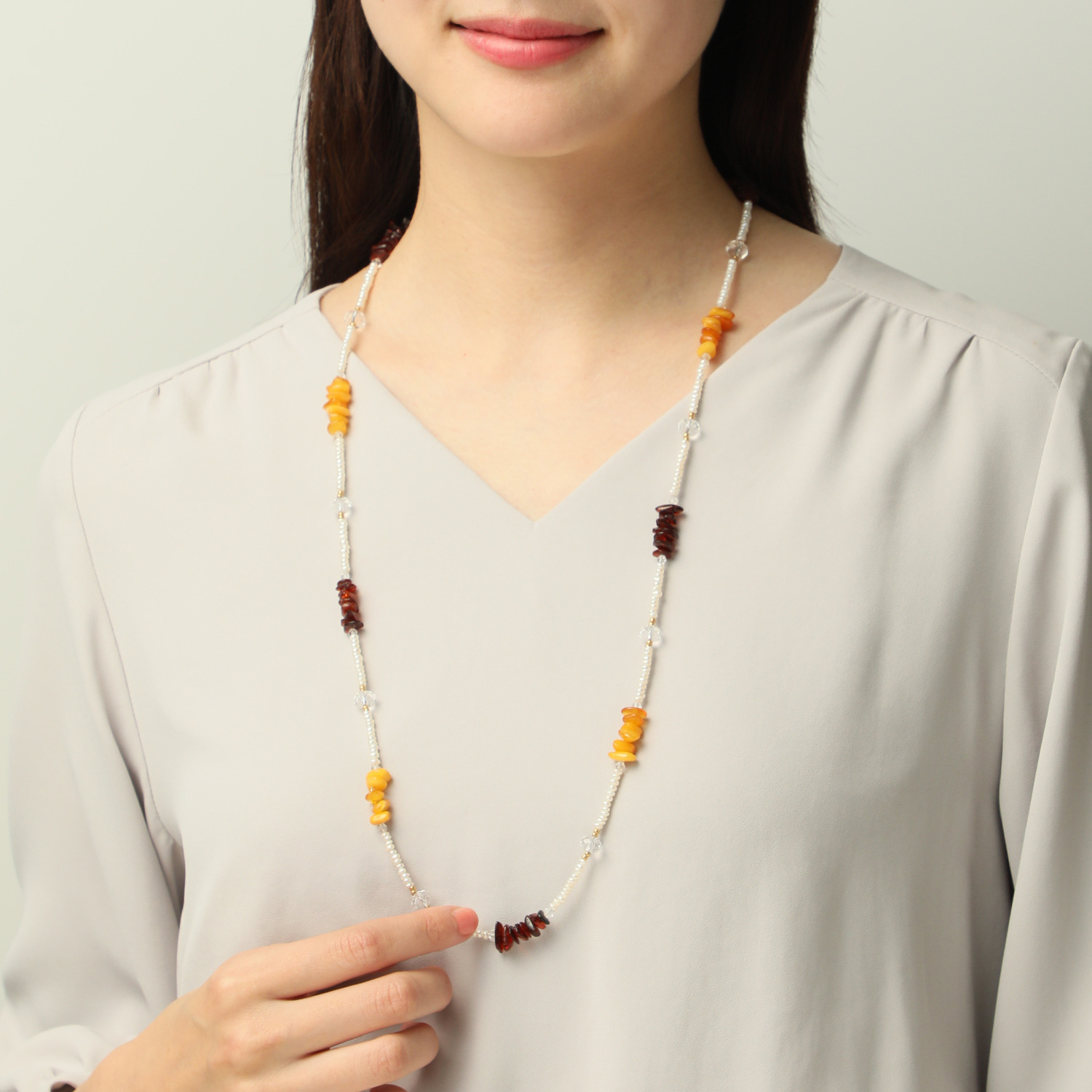 琥珀と淡水パールを組み合わせた、ツートンカラー仕立てのロングネックレスです。