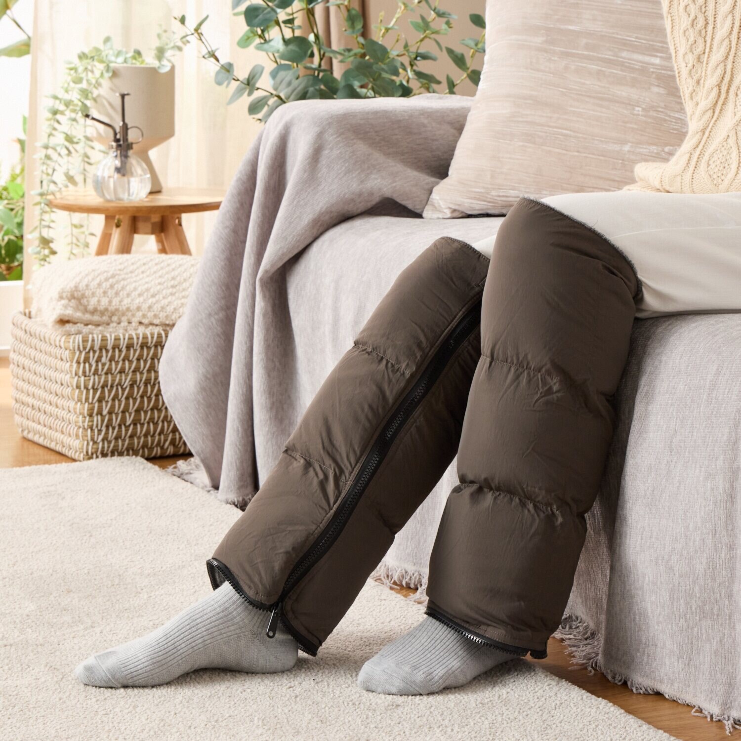 ファスナーを最後まで下ろすことで足先まで暖める保温ソックスとして使用可能