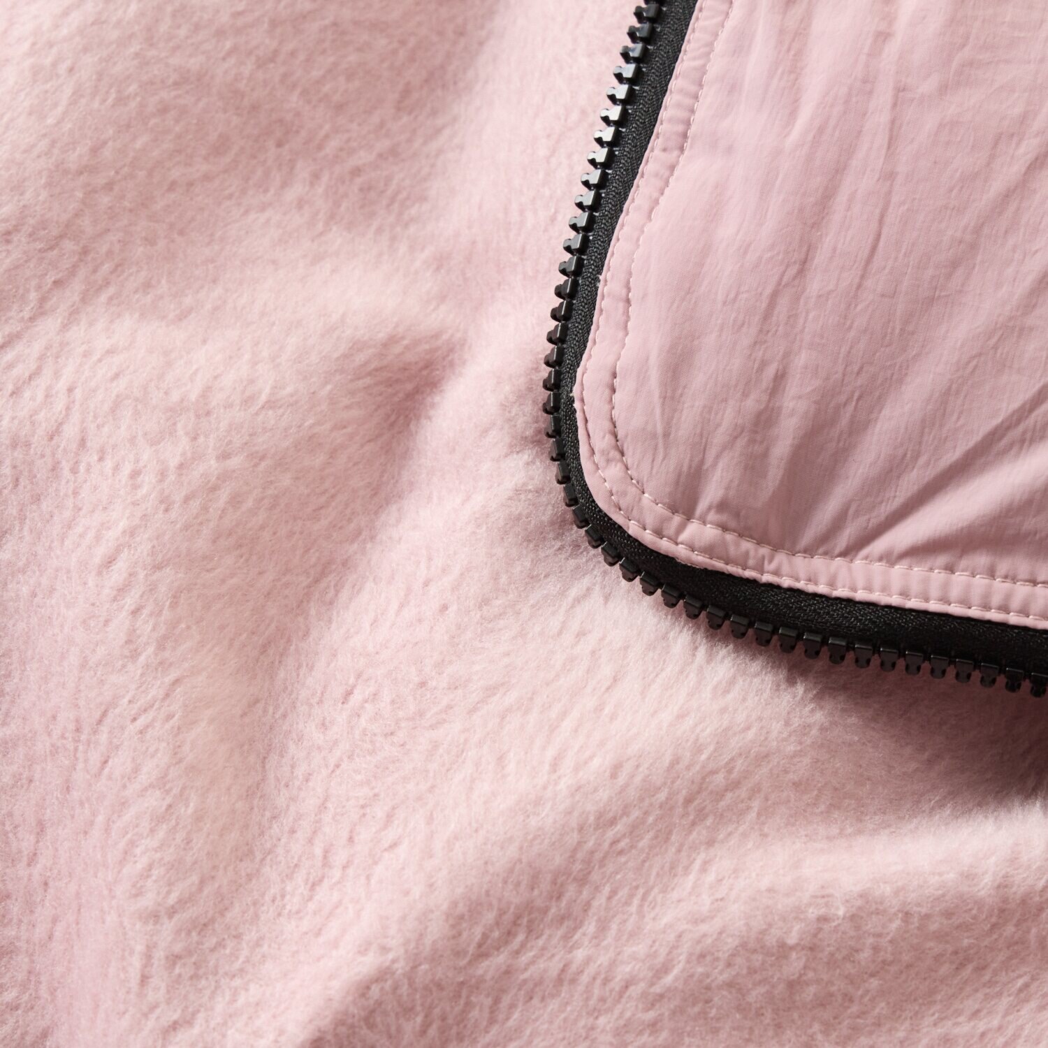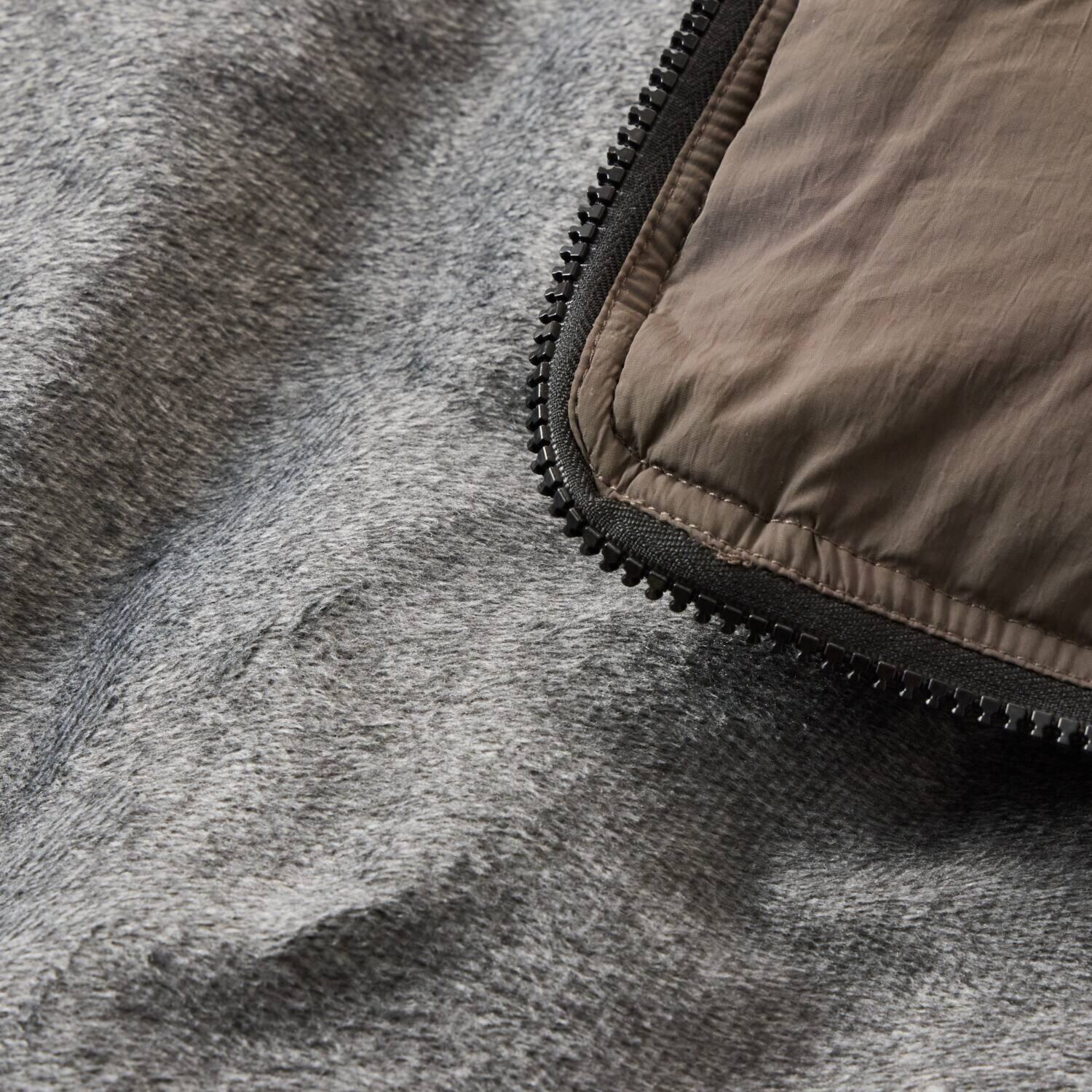 外側は冷気を通しにくく、はっ水加工・難燃加工の生地、内側はもこもこな起毛素材