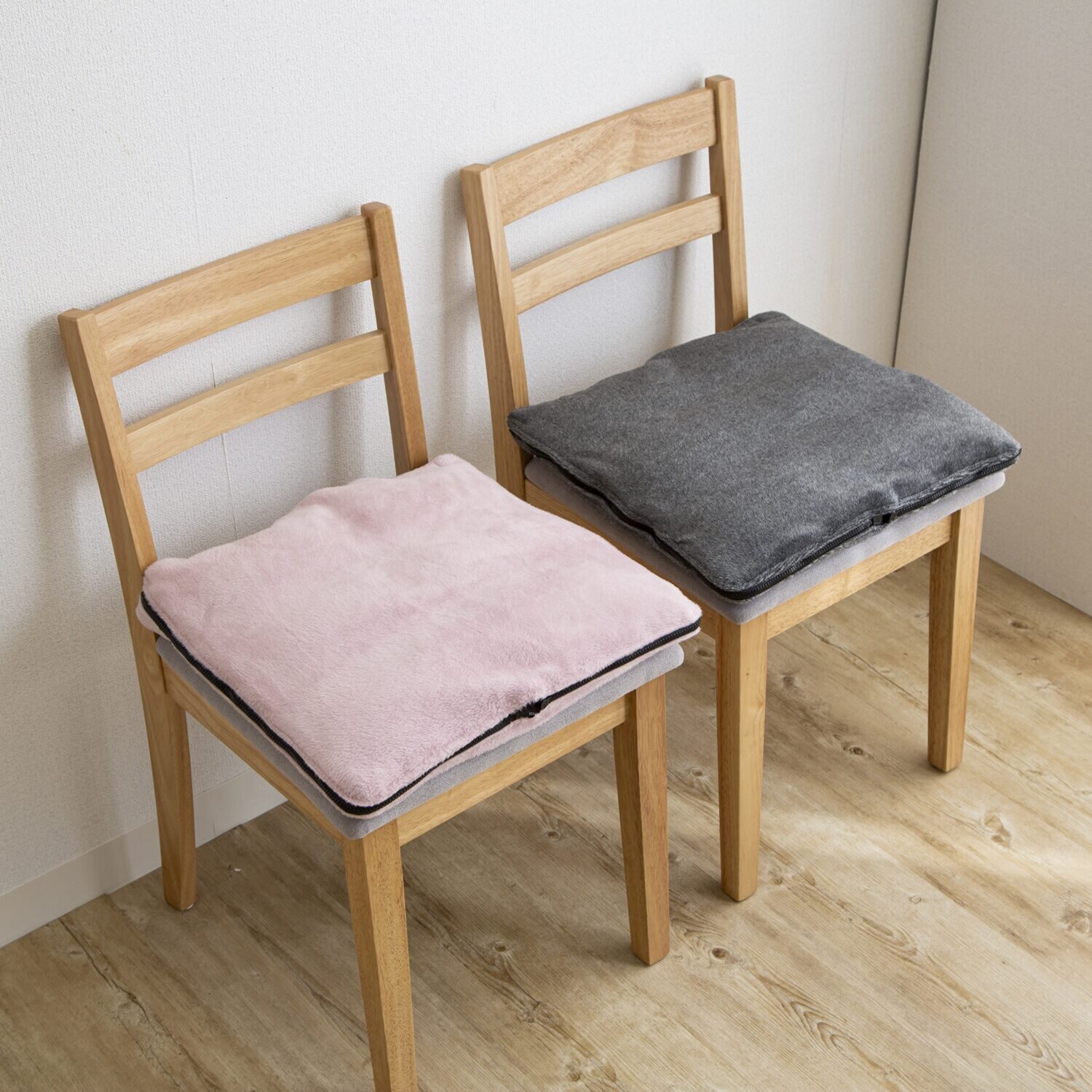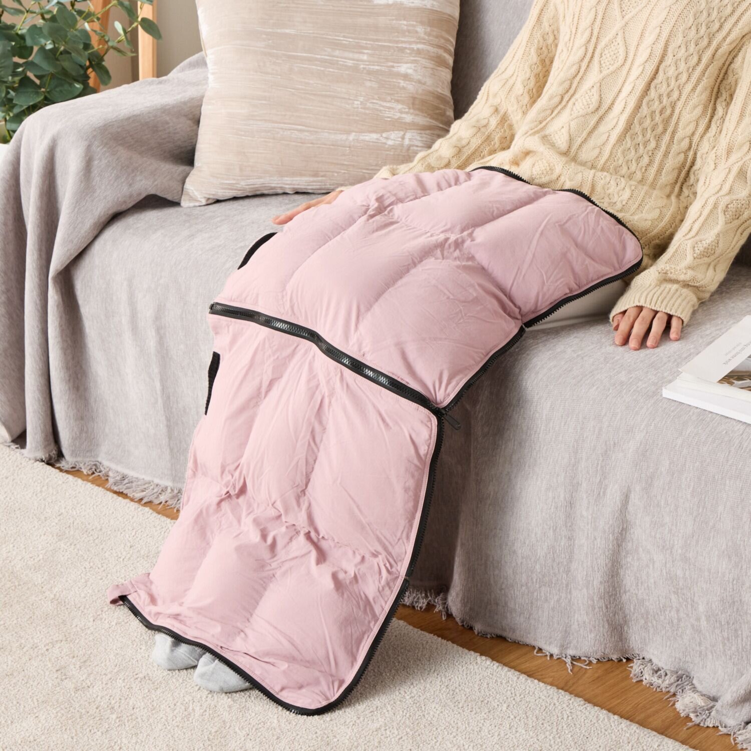 ひざ掛けの状態にした後、反対側のファスナーを連結させることで座布団に変身
