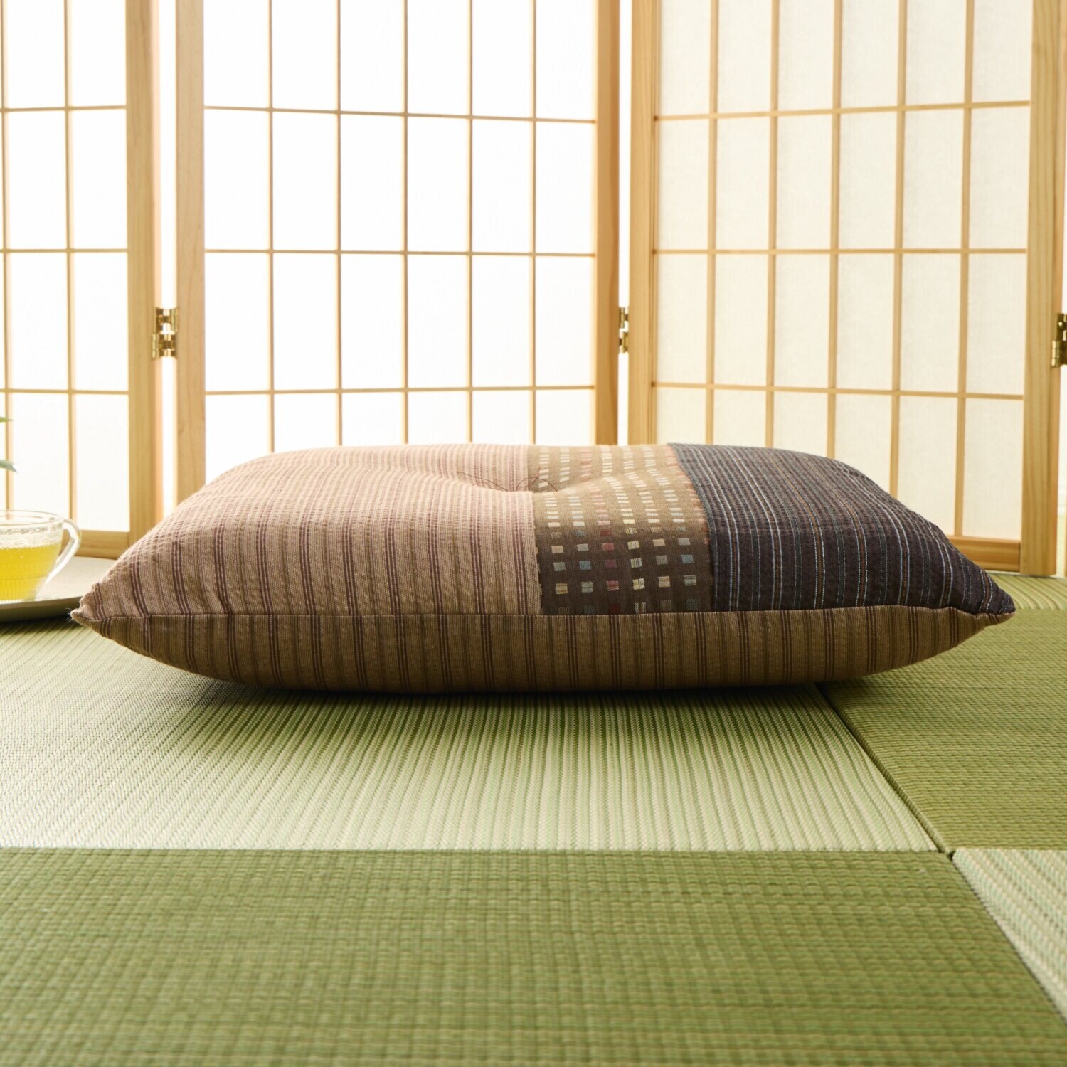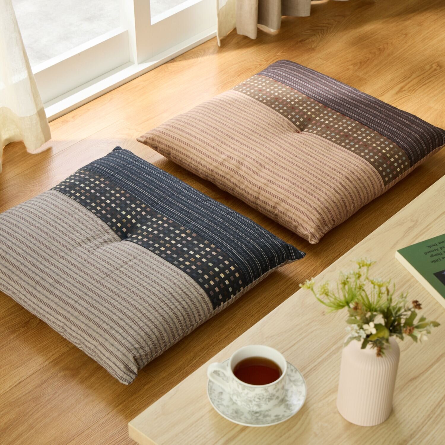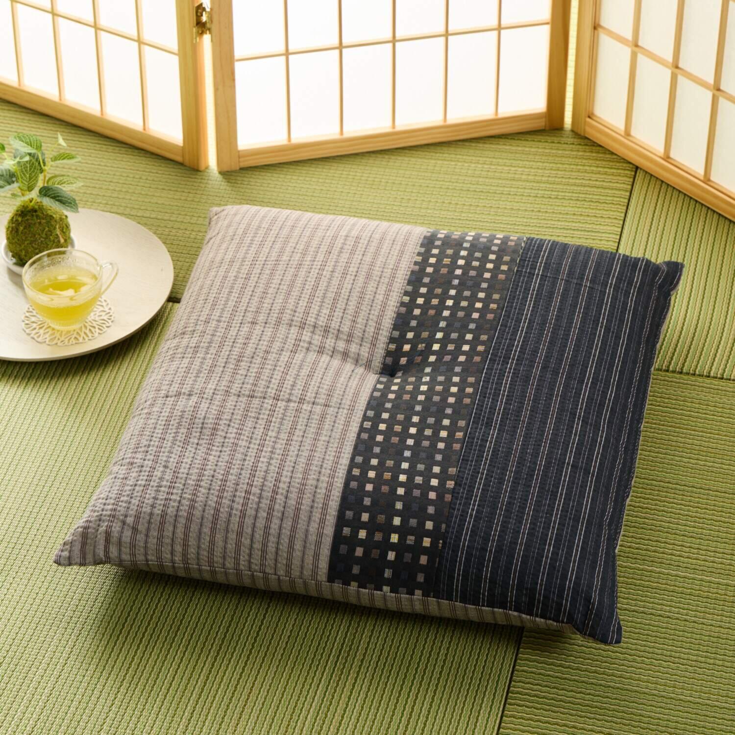 素材感のある先染め生地をパッチワークしてデザインに変化をつけた、和モダンテイストの座布団。