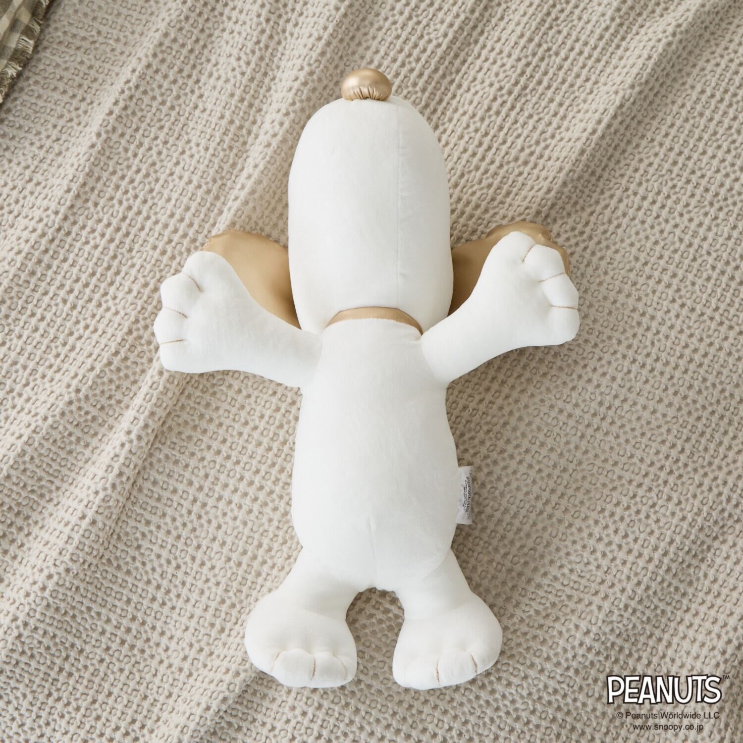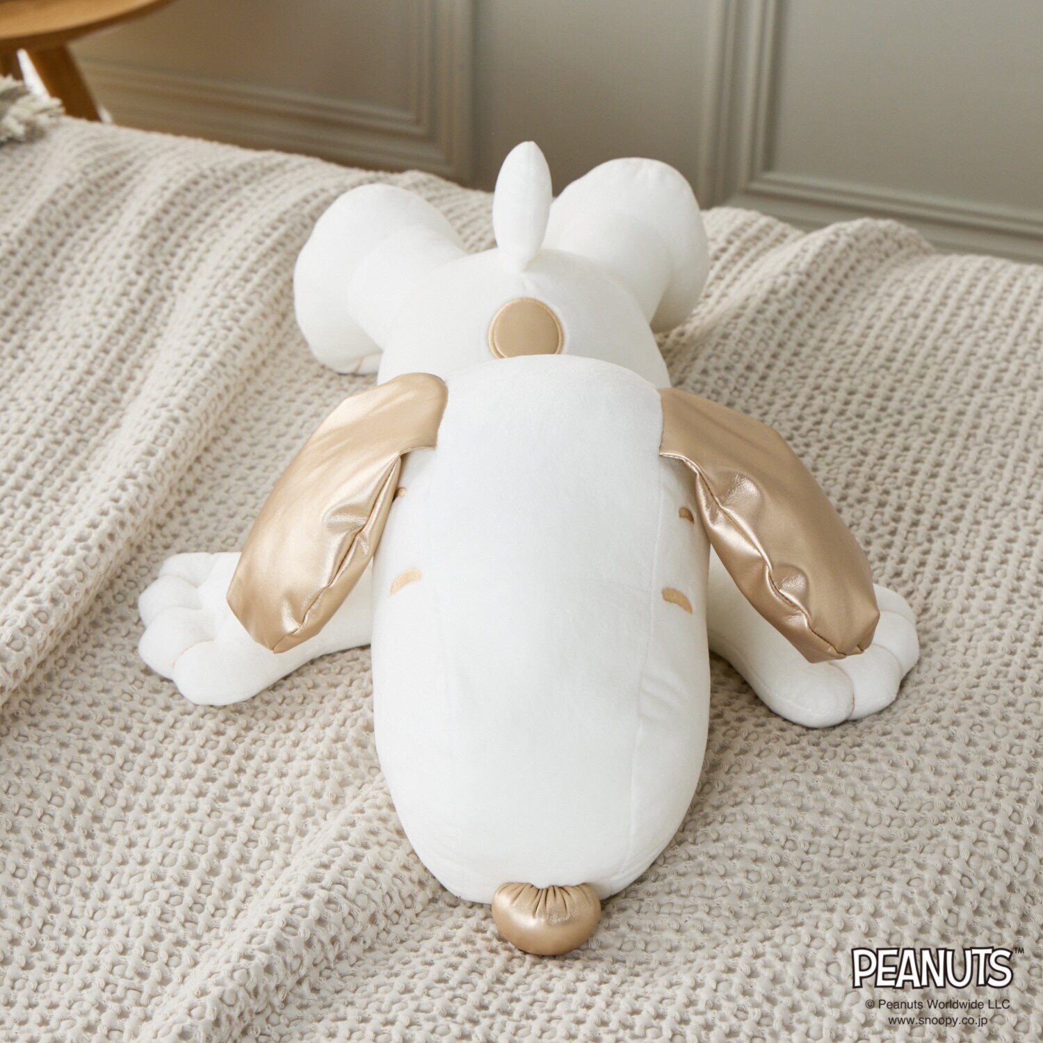 <西川>より、耳・鼻・首輪・背中の生地にゴールドカラーを配したゴージャスで、思わず抱きつきたくなる可愛らしいスヌーピーの抱きまくらです。