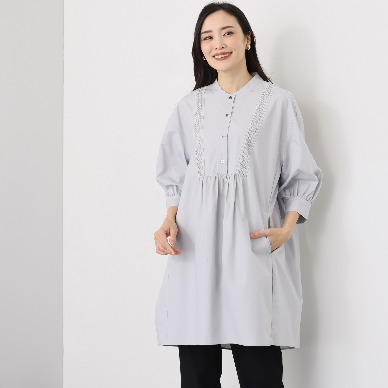 オーバーサイズシルエットと長めの着丈により身体のラインをカバーするため、細見えが期待できそう。