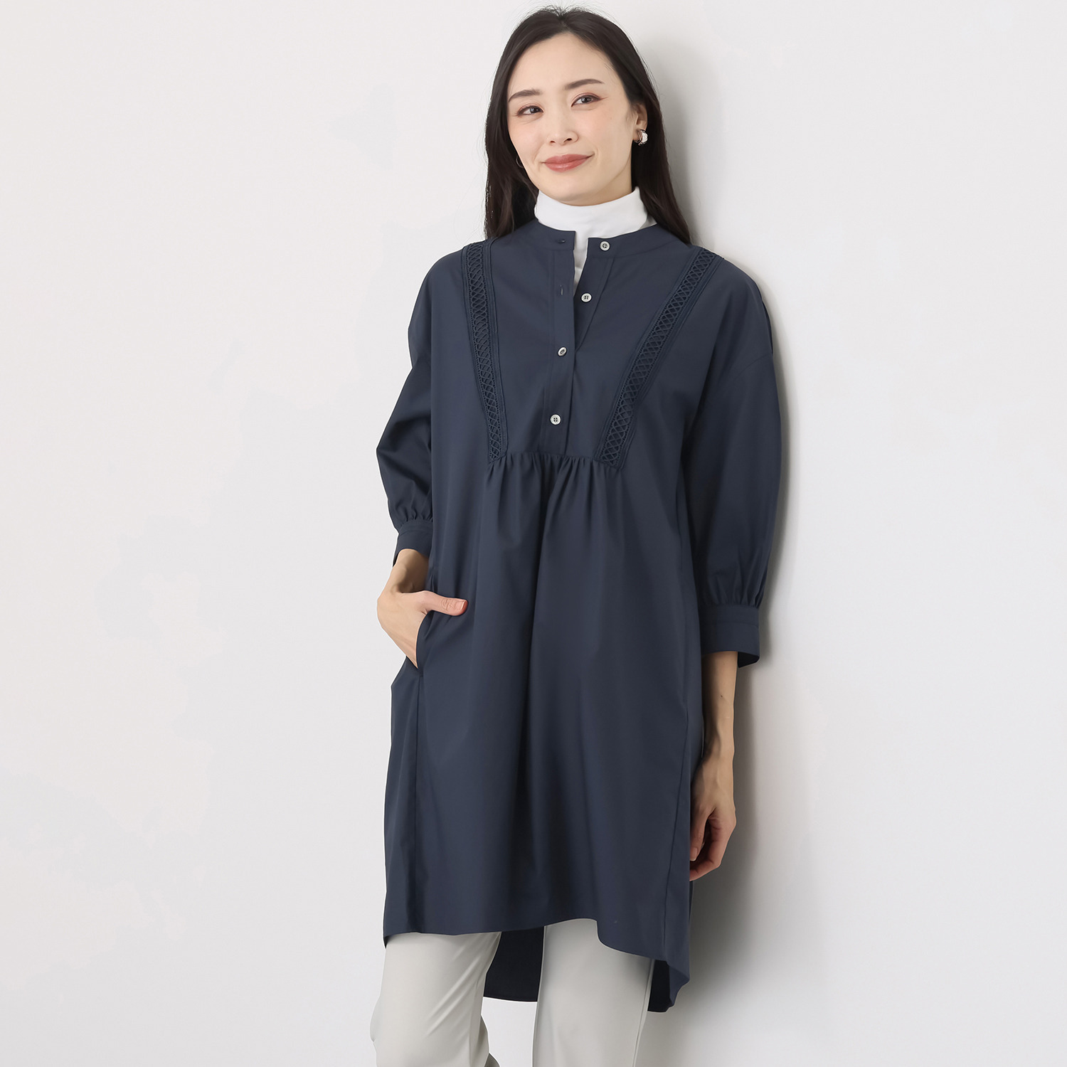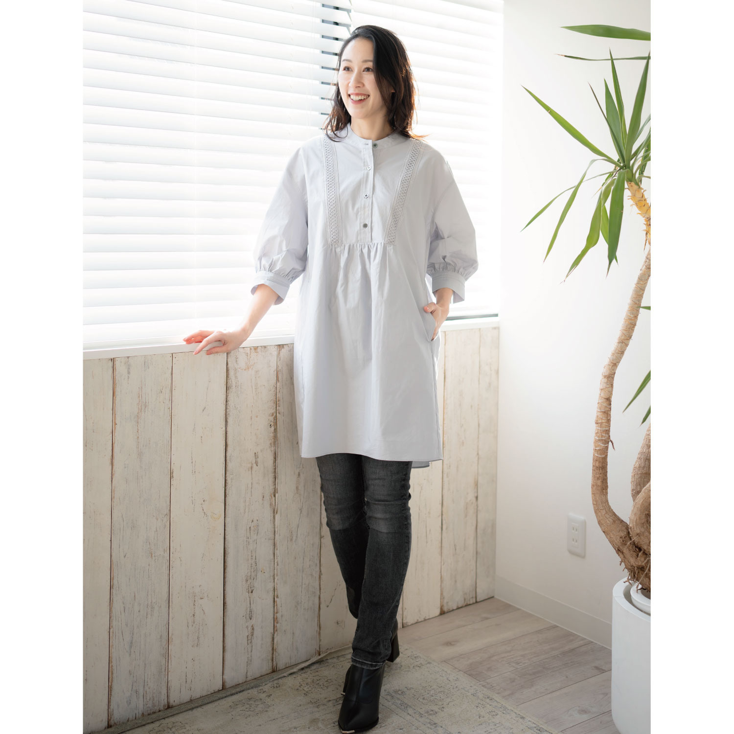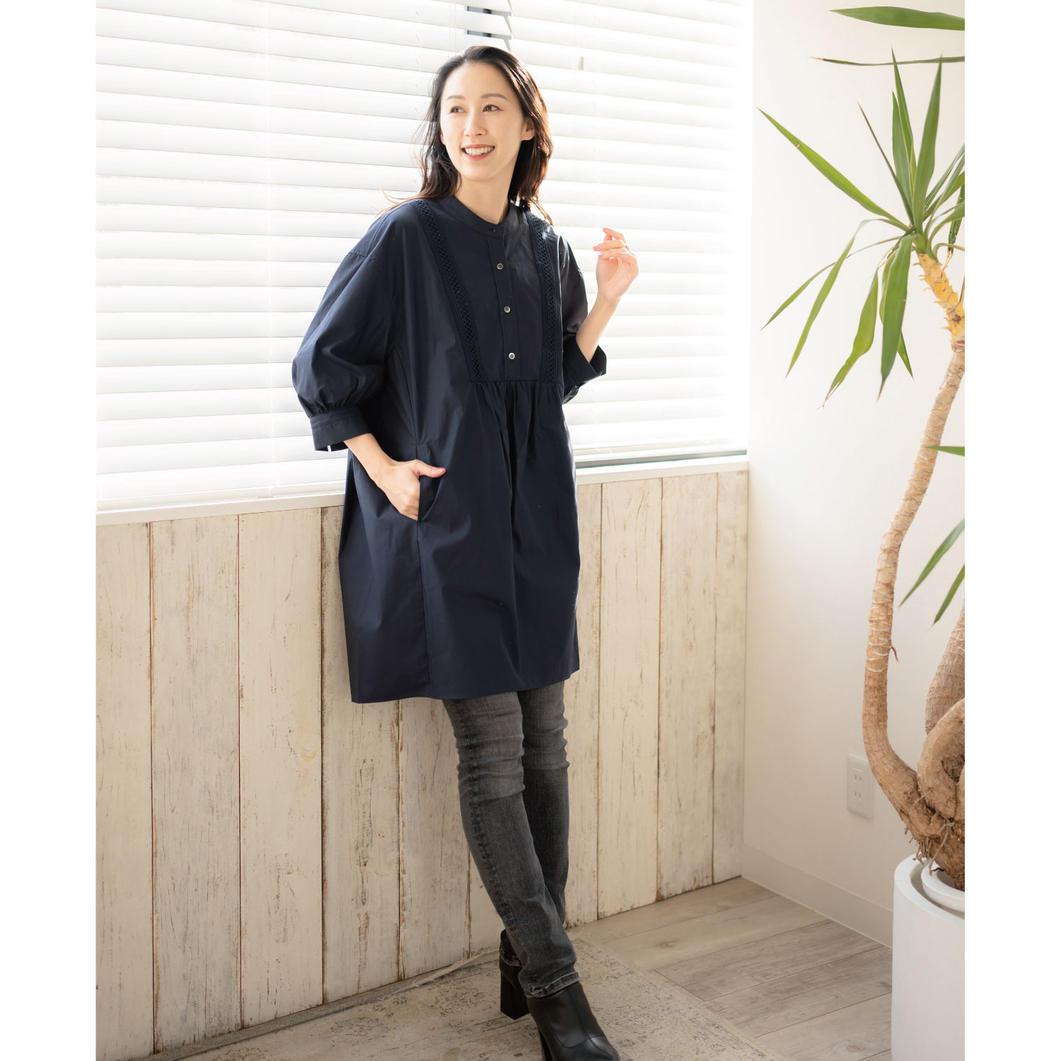 七分袖のため、長袖のインナーを覗かせるのも素敵です。