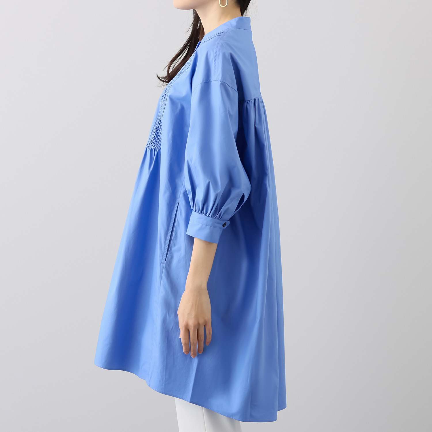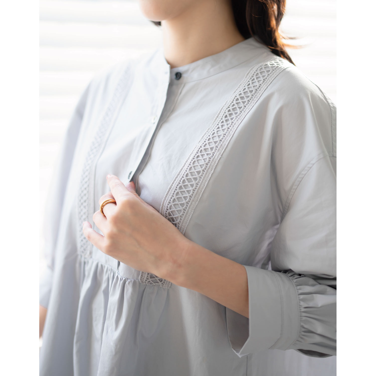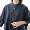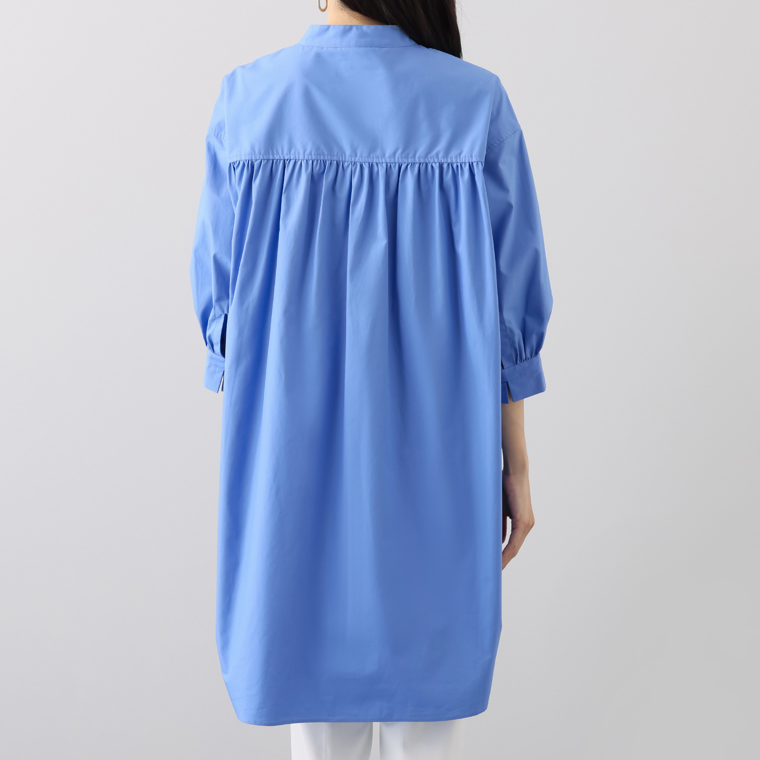 後ろ身頃はギャザーをたっぷりと入れ、トレンド感のあるスタイルに。