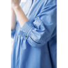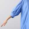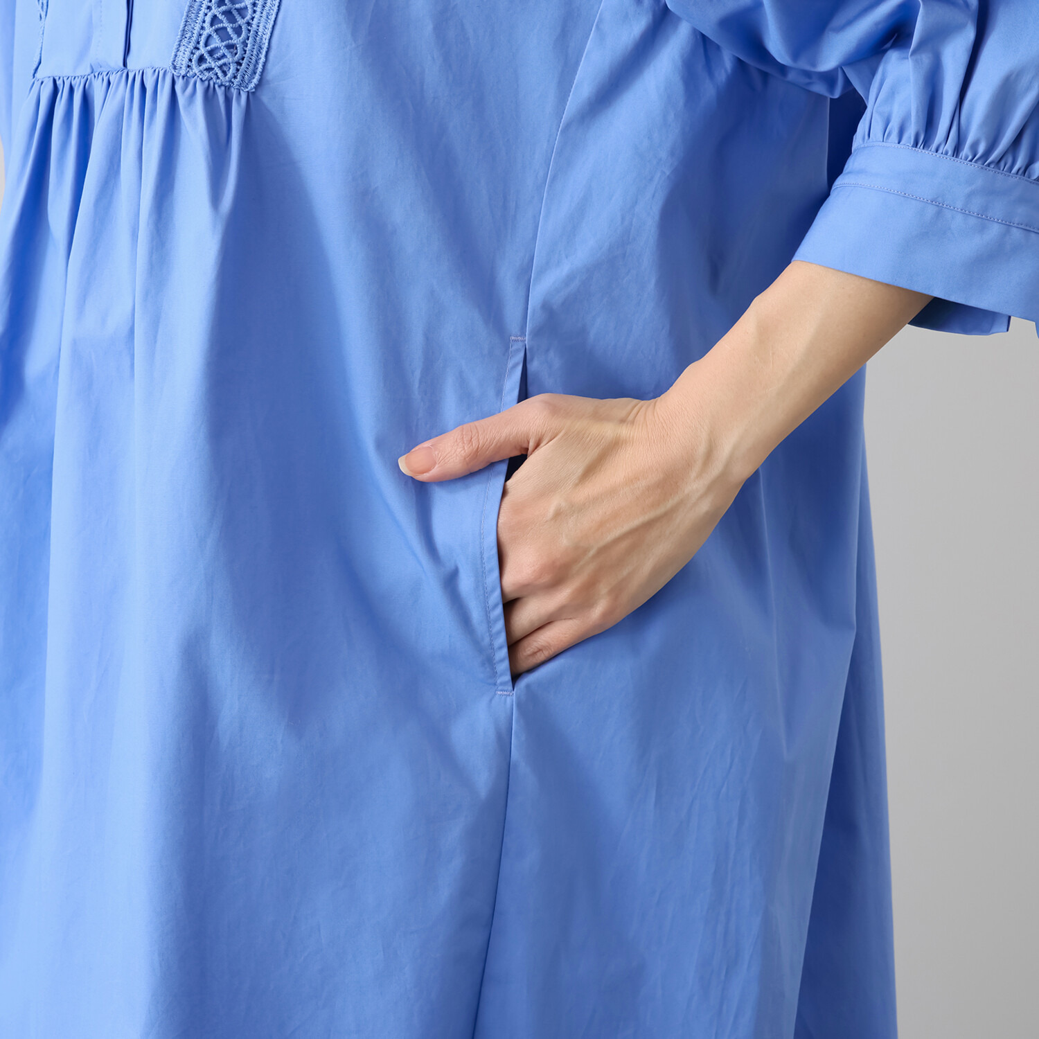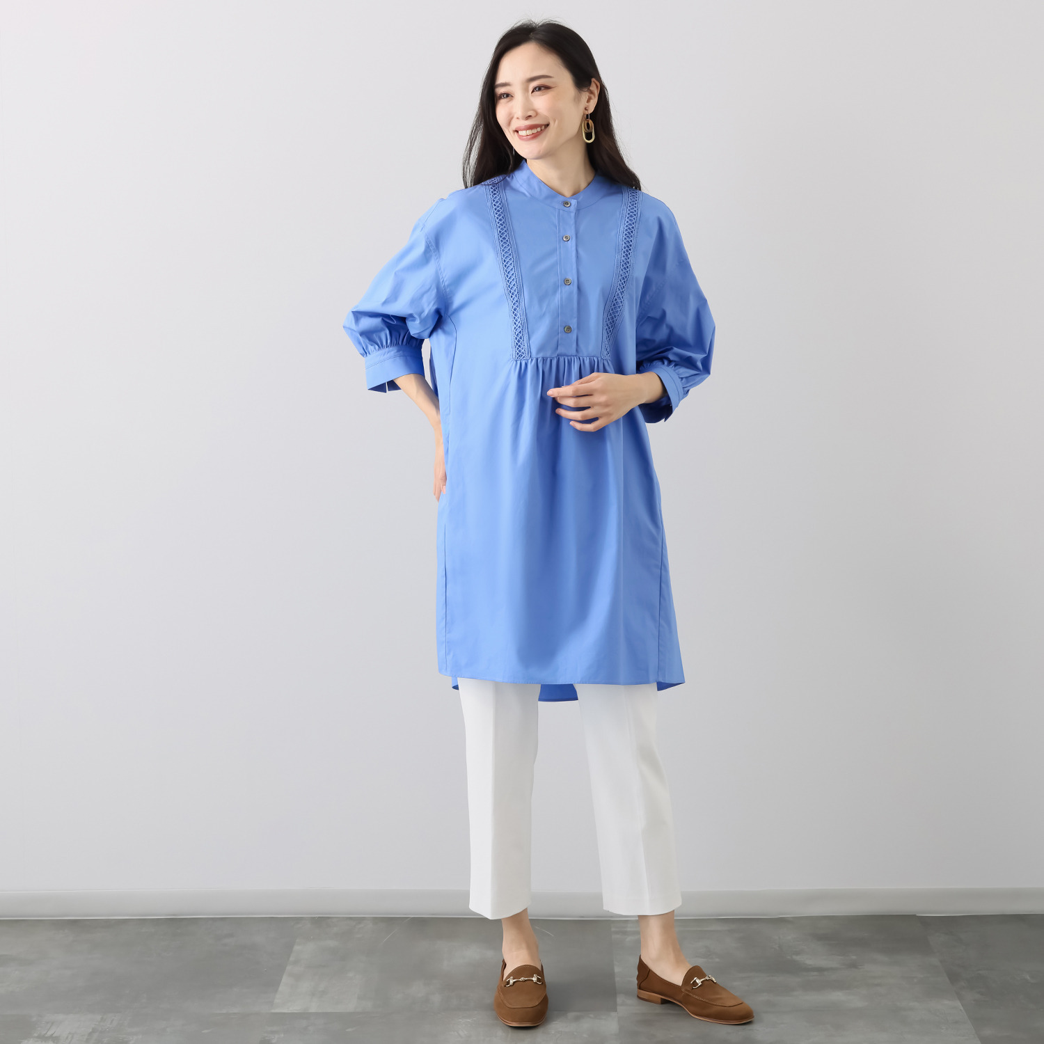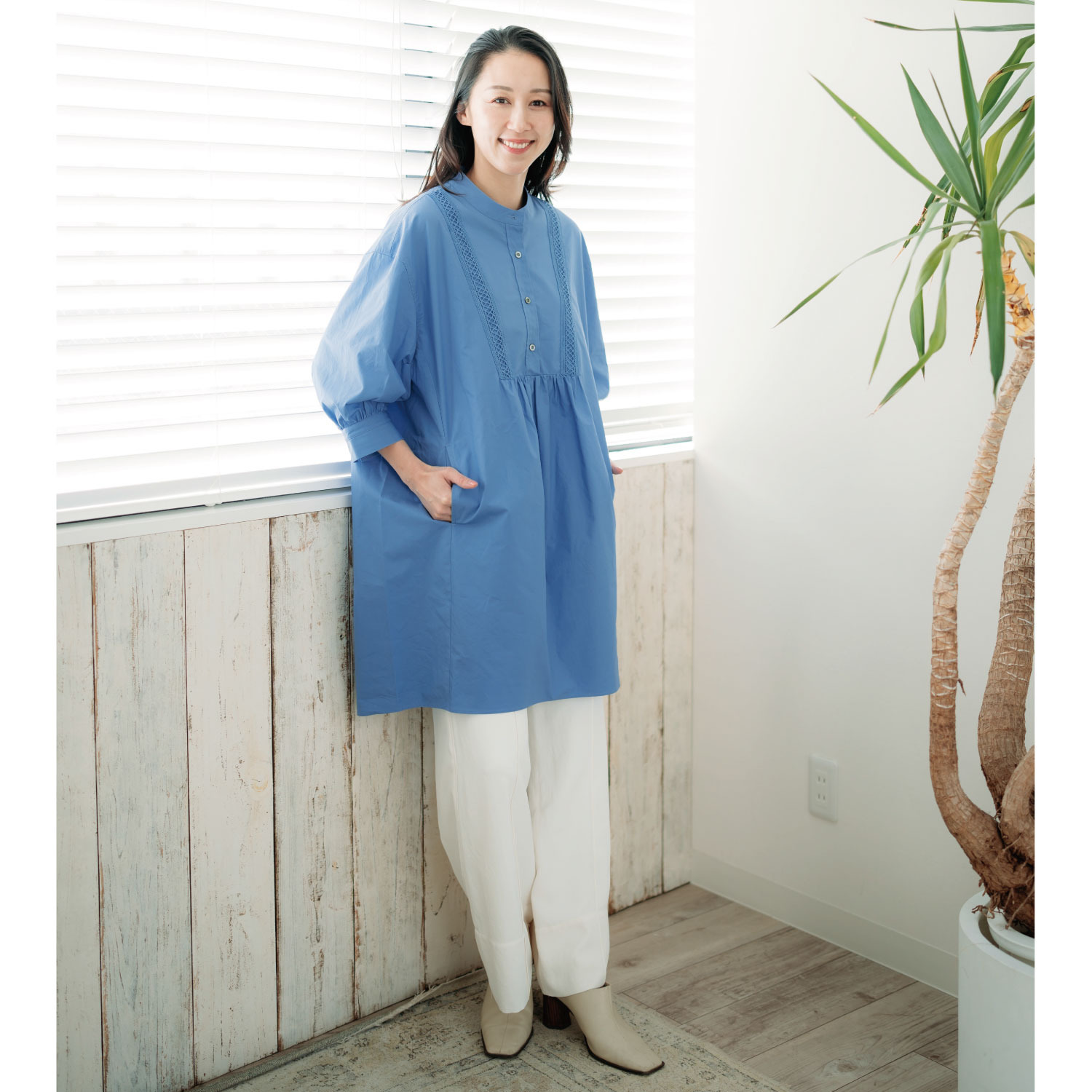 後ろ身頃はギャザーをたっぷりと入れ、トレンド感のあるスタイルに。