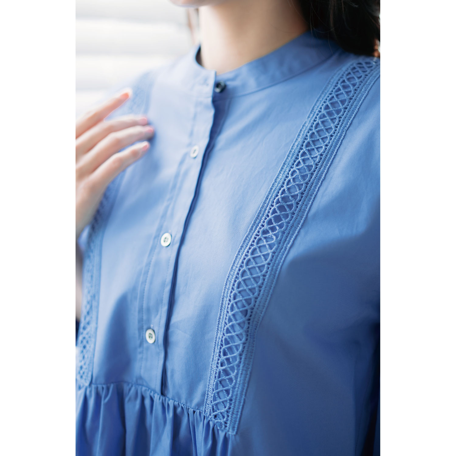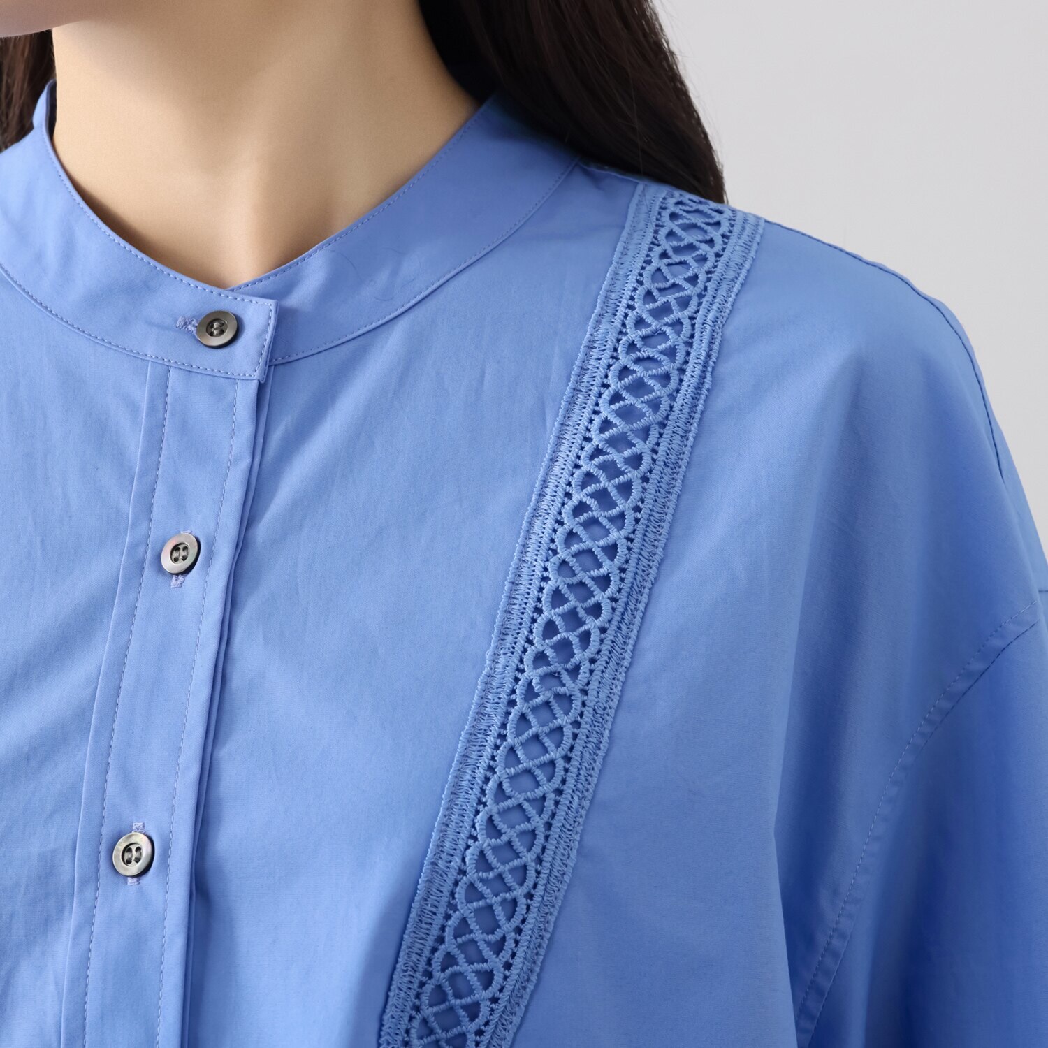 貝ボタンの使用や丁寧な縫製などこだわりの仕立てにもご注目。