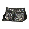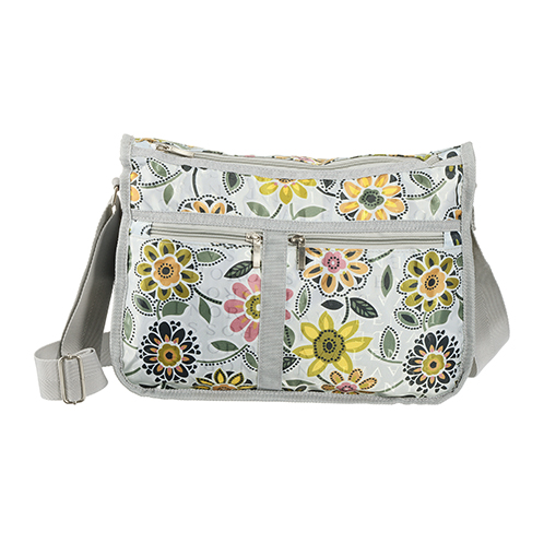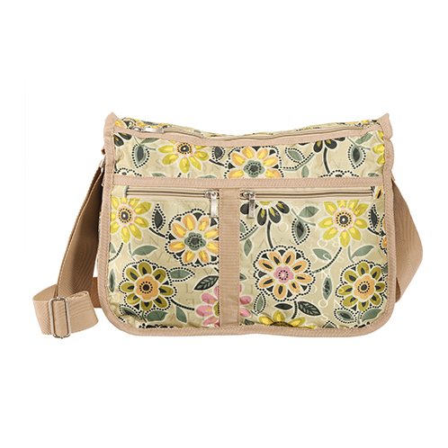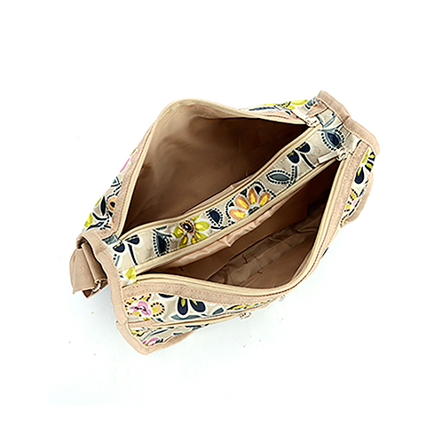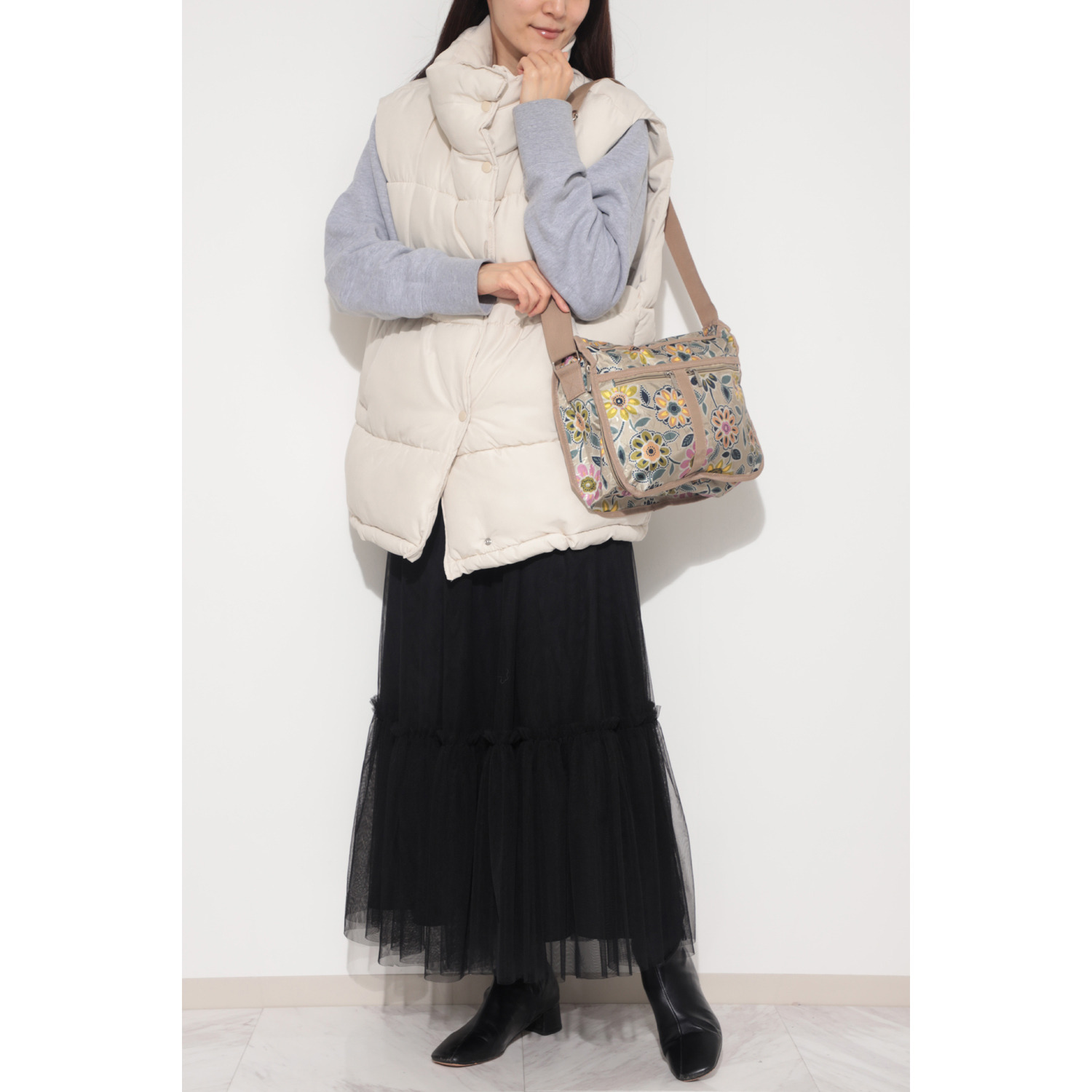 華やかな花柄が目を惹くショルダーバッグ。マチの変更が可能で、荷物の量に合わせて便利に使えます。