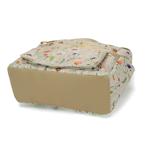 フラワーモティーフが彩る多機能バッグ。軽量設計と豊富なポケットで、お出かけをもっと快適に。