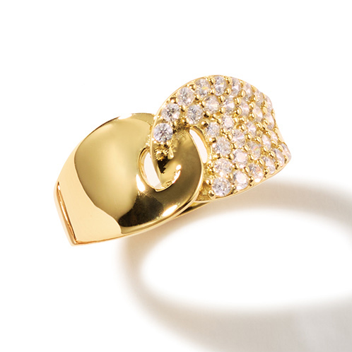 CZを贅沢に敷き詰めた輝きあふれる面と地金のみの鏡面が、互いをやさしく包み込むように交錯し、優美な雰囲気を漂わせます。