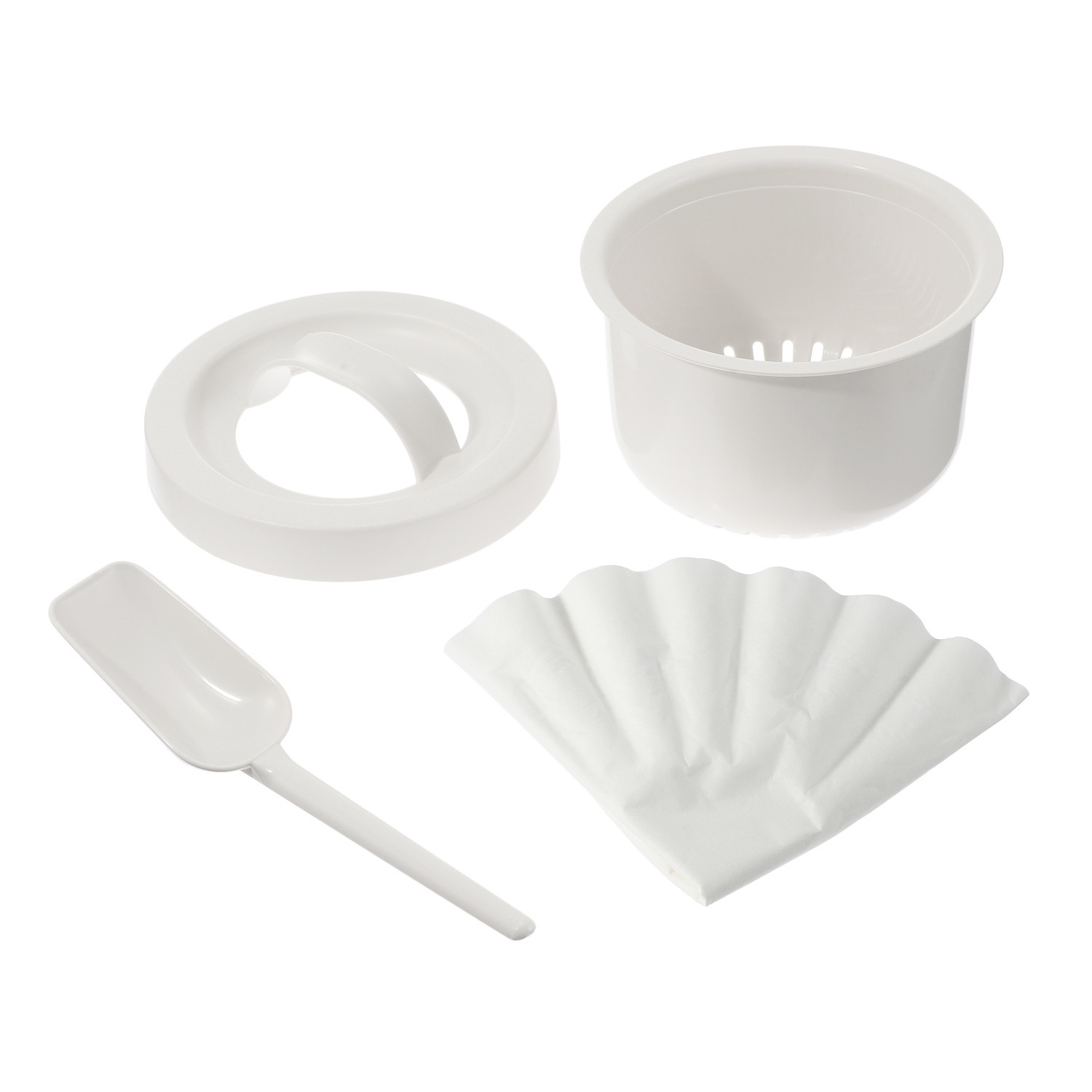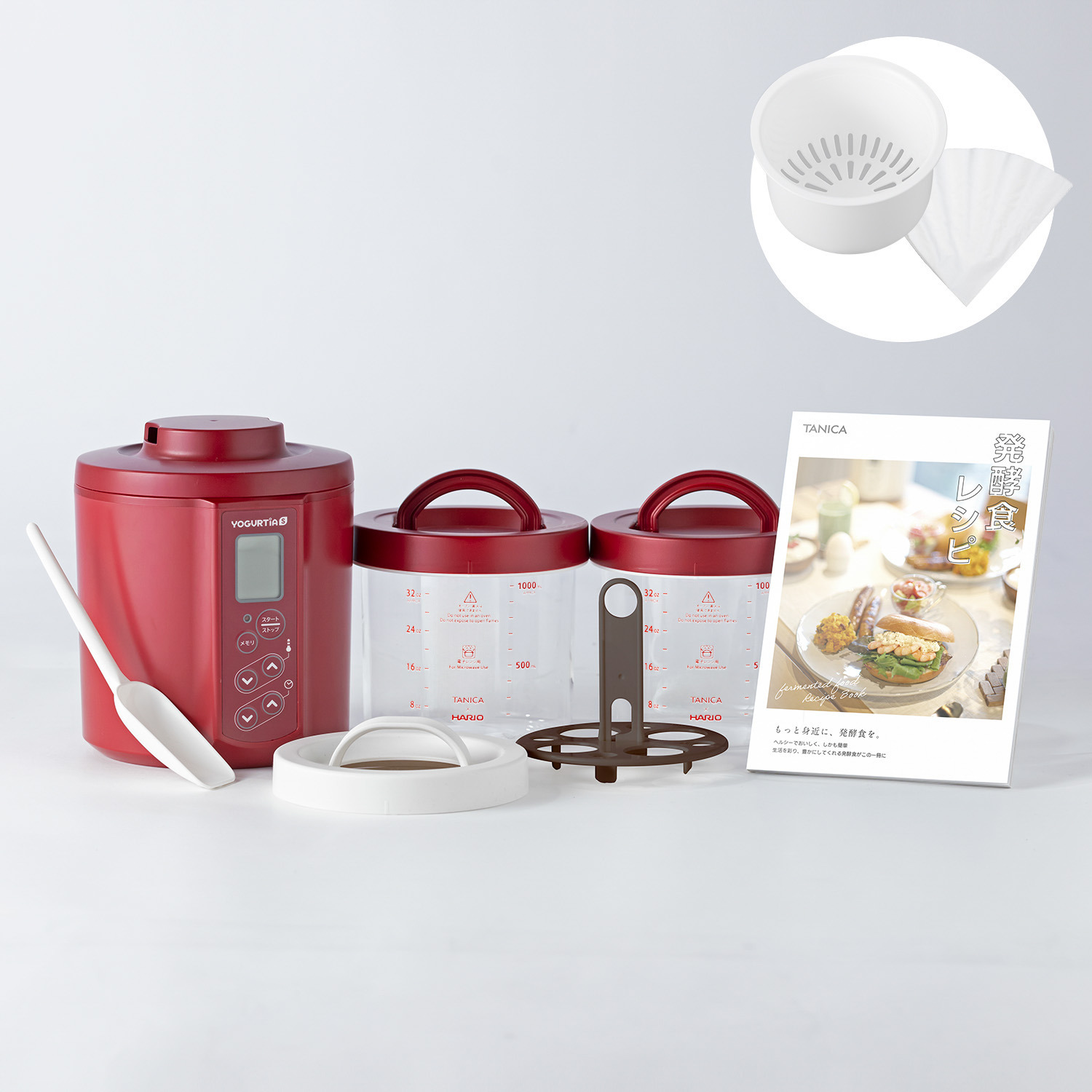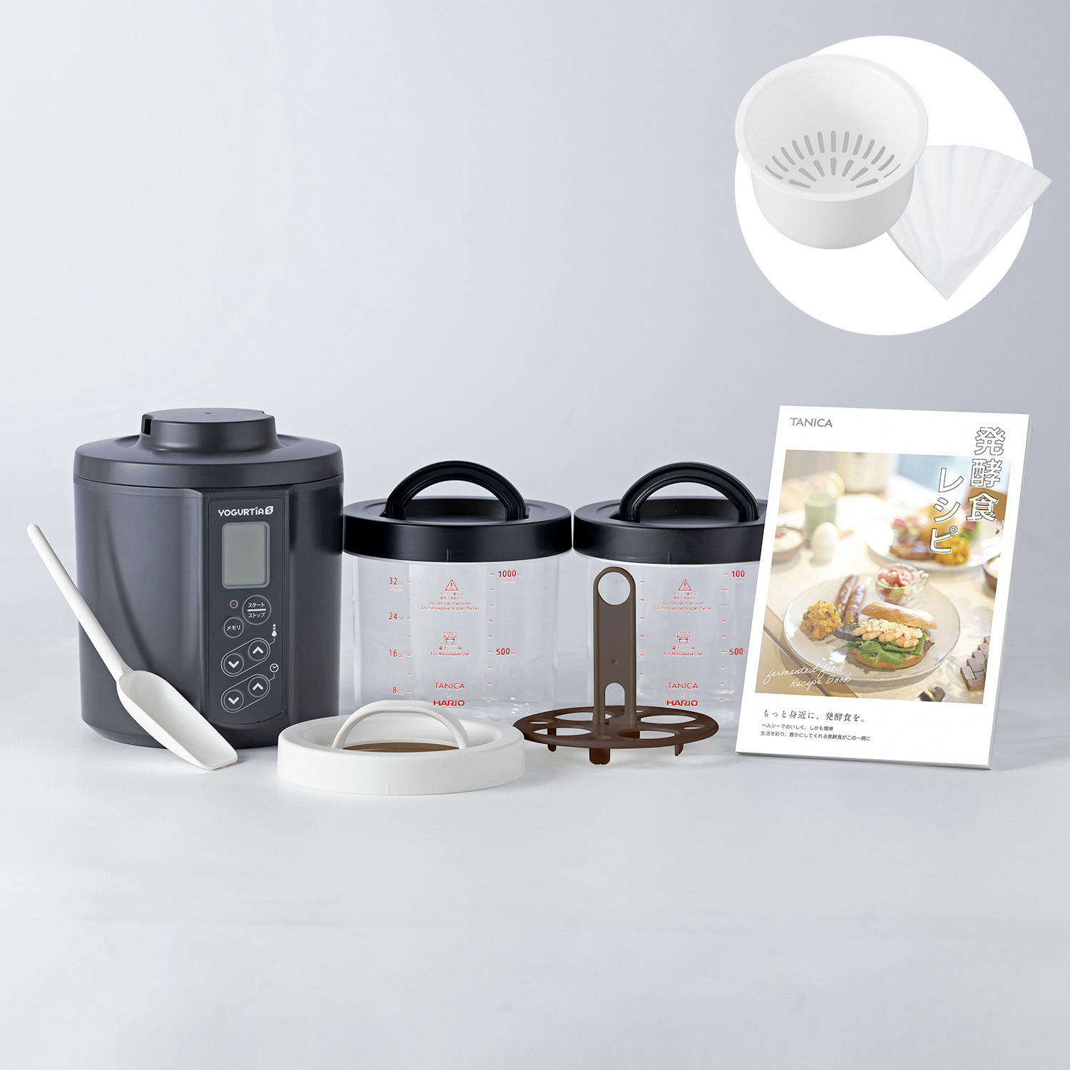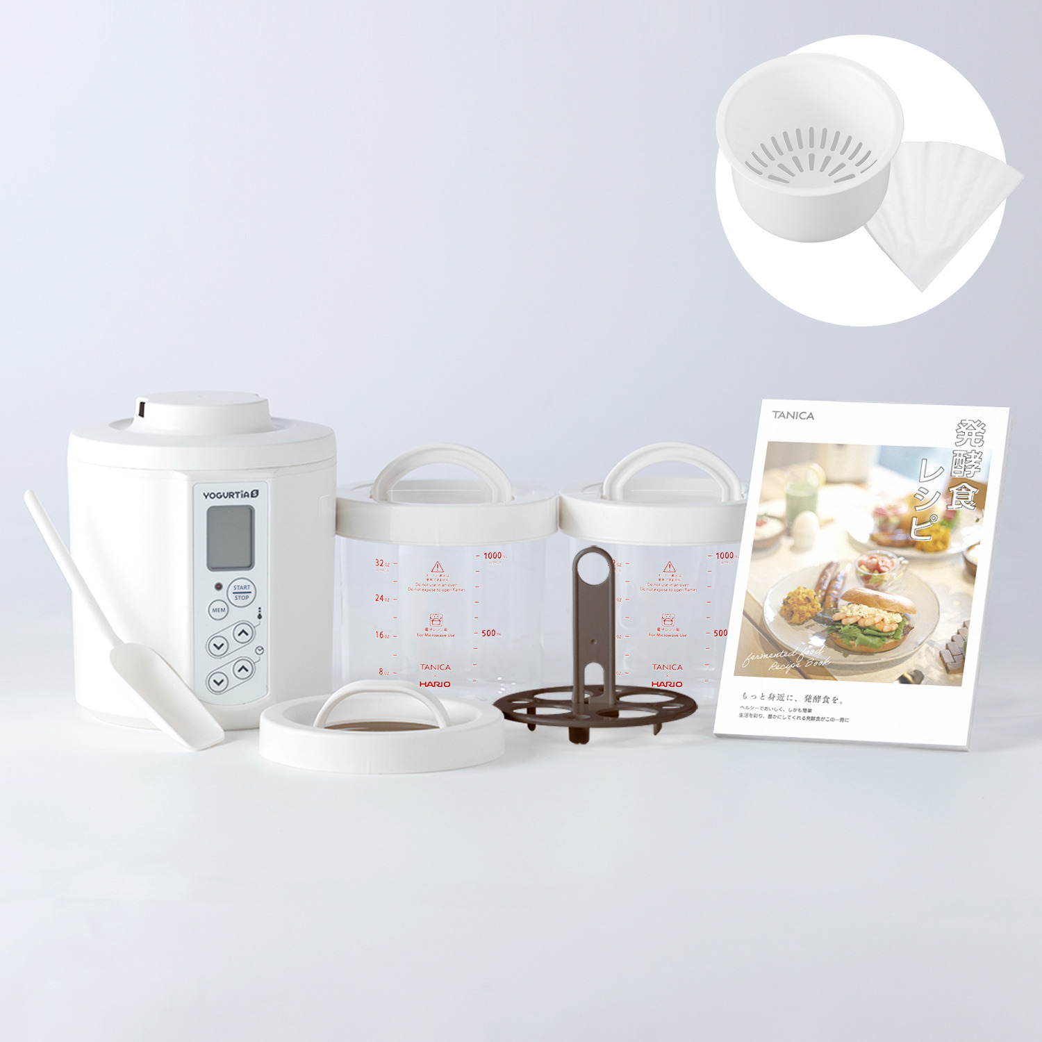 本体にガラスポット2個、温玉スタンド、水切りバスケット、ペーパーフィルター10枚をセットにした「ヨーグルティアS 特別セット」のご紹介です。
