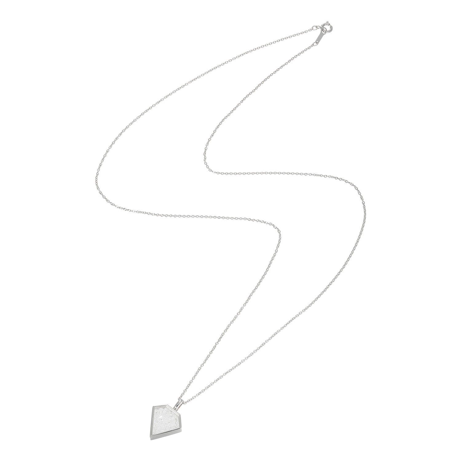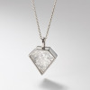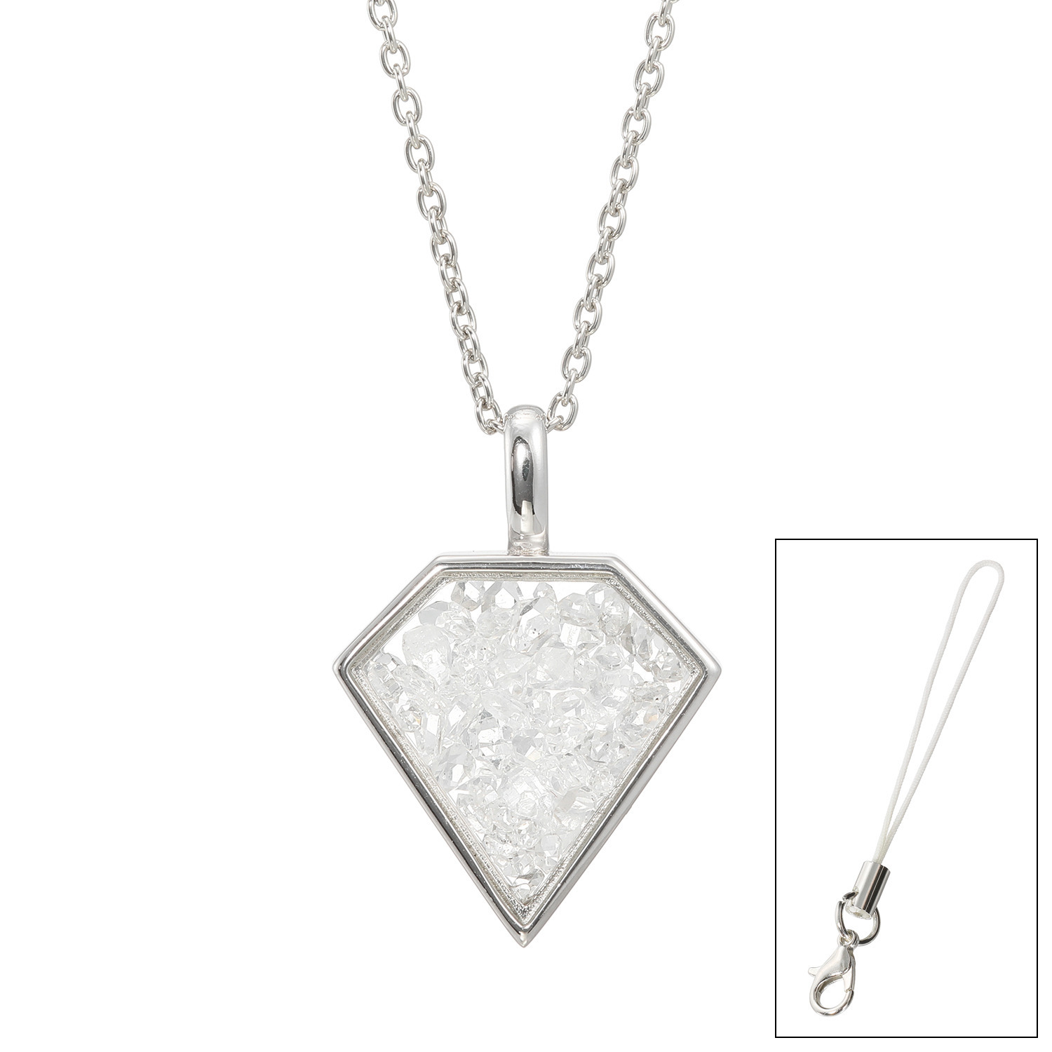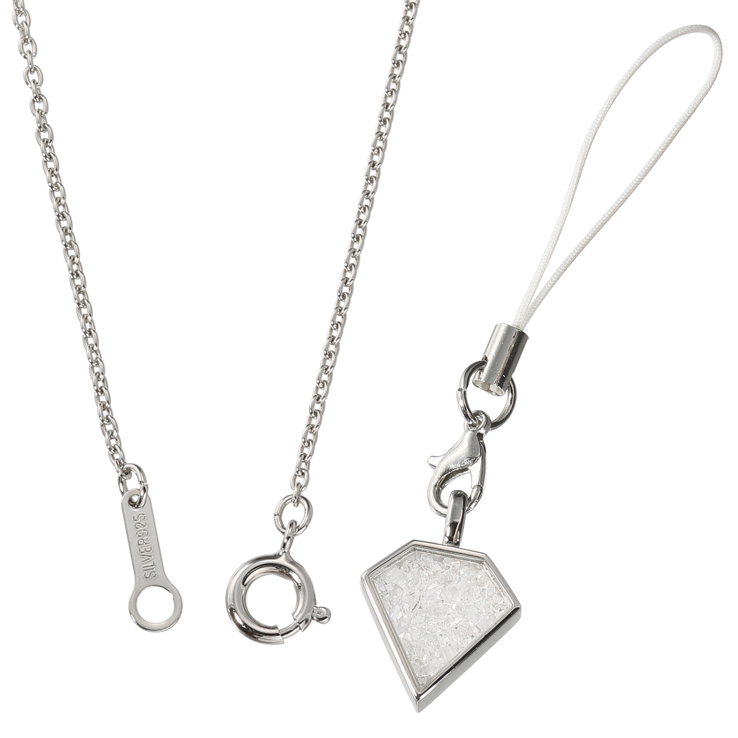 ダイヤ型のフォルムの中に、“ハーキマーダイヤモンド”と呼ばれるロッククリスタルクォーツをふんだんに詰め込んだペンダントとストラップです。