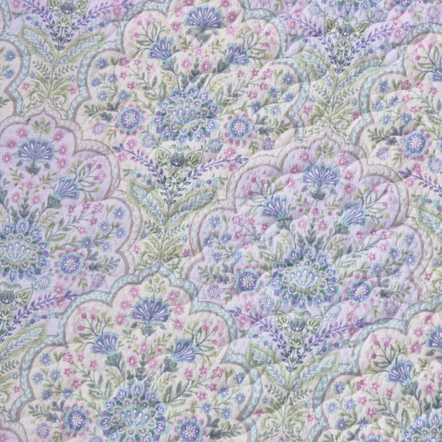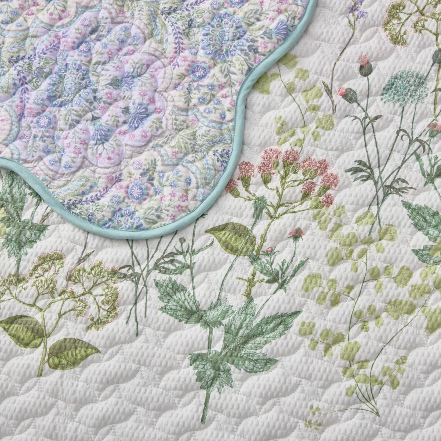 四周はハンドメイド感のある雰囲気の波型のスカラップ縫製、リーフ調のキルトでかわいらしく仕上げました。
