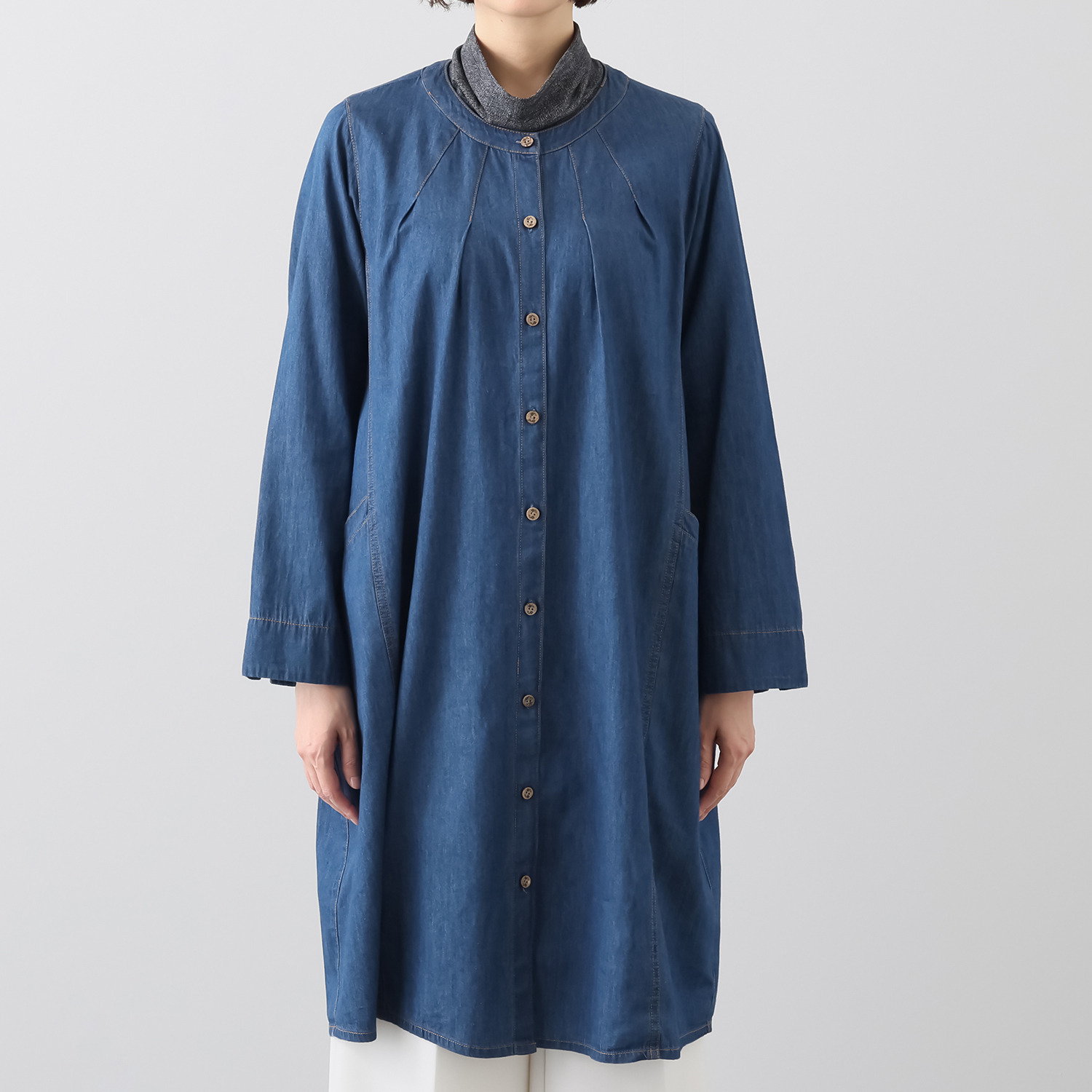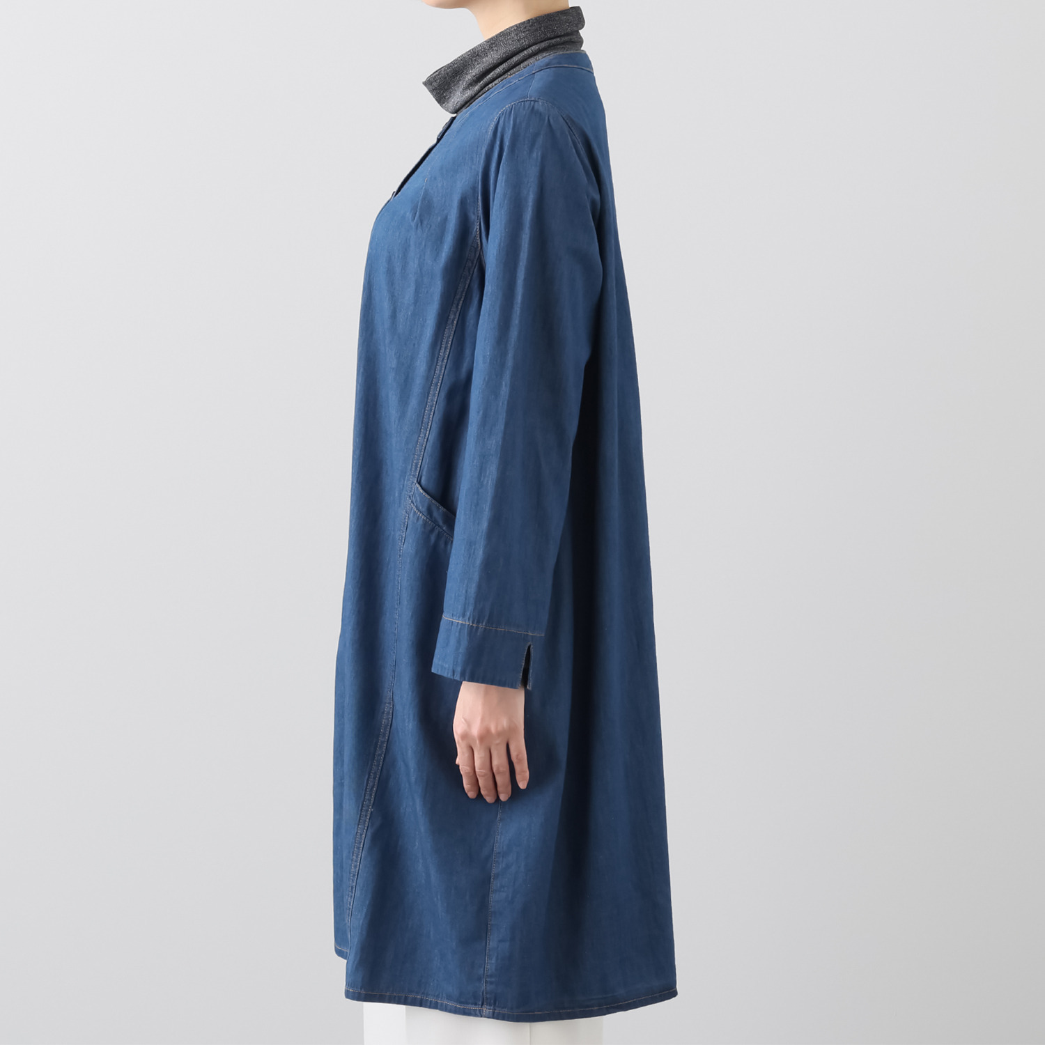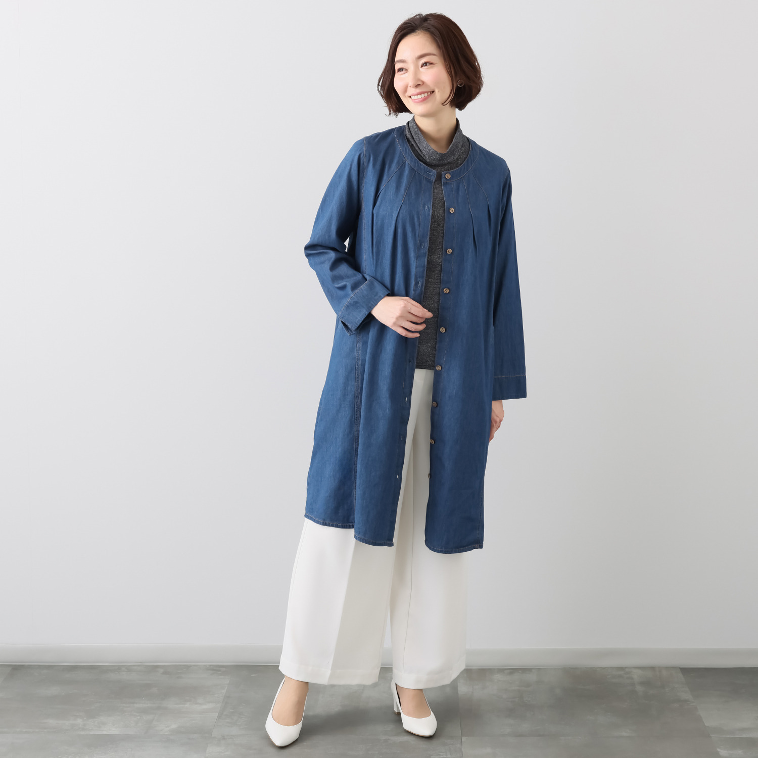 軽やかなデニム素材で仕立てたロング丈のコートです。